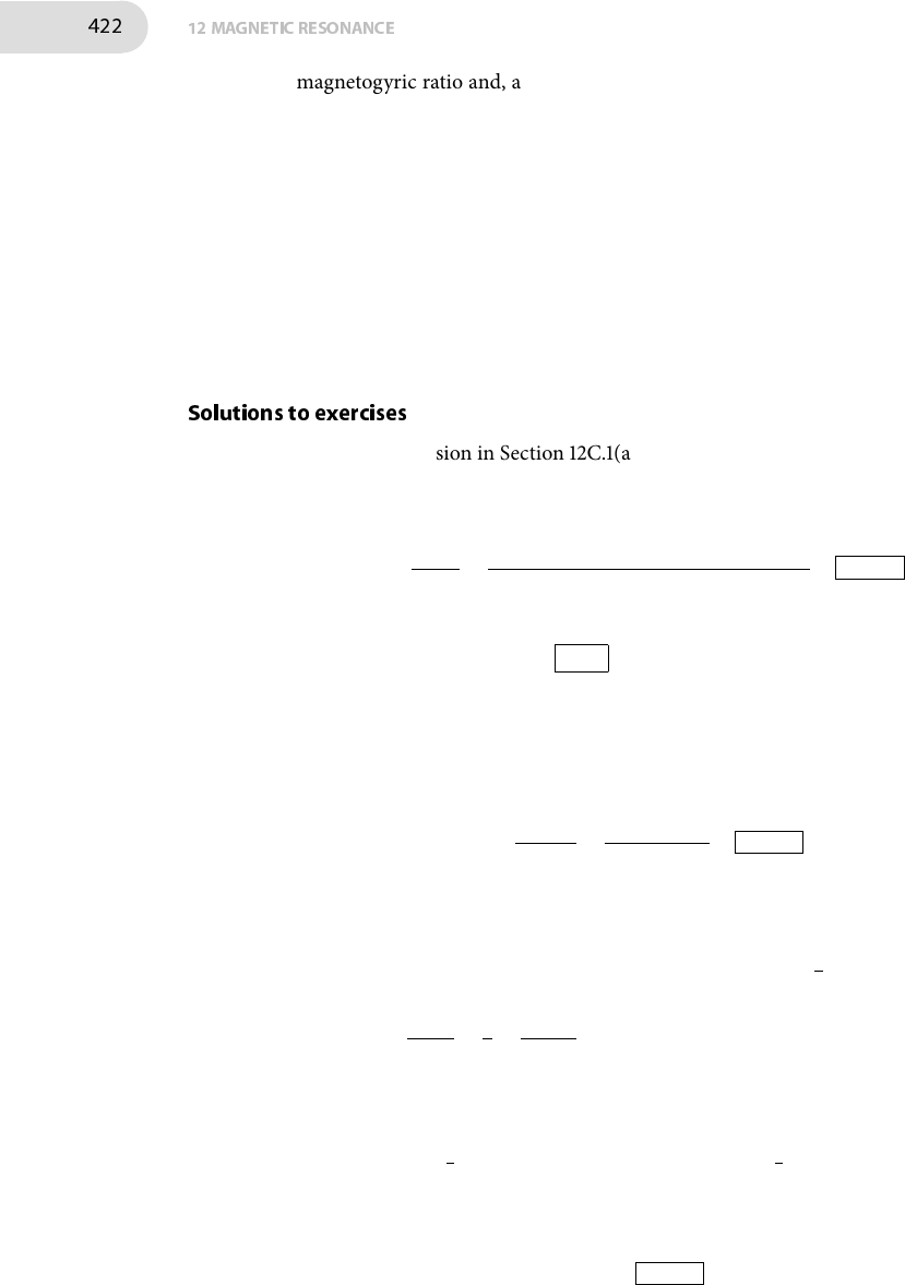 422 12MAGNETIC RESONANCE magnetogyric ratio and, all other things being equal, the relaxation caused by these �elds will therefore be faster the greater the magnetogyric ratio. �e magnetogyric ratio for 1H is about four times that of 13C, hence the inter- actions between 1H and local �elds is stronger leading to faster relaxation and shorter relaxation times. A somewhat separate issue is that in typical molecules H atoms tend to bemore accessible thanC atoms, and so if the local �eld is from outside themolecule it may be felt more strongly by themore exposedH atoms. D12C.4 �is is discussed in Section 12C.4 on page 516. Solutions to exercises E12C.1(b) From the discussion in Section 12C.1(a) on page 510, the �ip angle ϕ of a pulse of duration ∆τ is given by ϕ = γNB1∆τ, where B1 is the strength of the applied �eld. It follows that B1 = ϕ/γN∆τ. With the data given B1 = ϕ γN∆τ = π/2 (26.752 × 107 T−1 s−1) × (5 × 10−6 s) = 1.2 mT �e corresponding 180○ pulse has twice the �ip angle so, for the same B1, ∆τ is doubled: ∆τ = 2 × (5 µs) = 10 µs . E12C.2(b) �e e�ective transverse relaxation time, T∗2 , is given by [12C.6–514], T∗2 = 1/π∆ν1/2, where ∆ν1/2 is the width of the (assumed) Lorentzian signal mea- sured at half the peak height. Hence T∗2 = 1 π∆ν1/2 = 1 π × (12 Hz) = 0.027 s E12C.3(b) �e amplitude of the free induction decay, S(t), is proportional to e−t/T2 , where t is time and T2 is the transverse relaxation time. If S(t2) = 1 2 S(t1) then S(t2) S(t1) = 1 2 = e −t2/T2 e−t1/T2 = e−(t2−t1)/T2 = e−∆t/T2 taking logarithms gives ln 12 = −∆t/T2 therefore ∆t = −T2 ln 12 = T2 ln 2 With the data given ∆t = (0.050 s) × ln 2 = 0.035 s