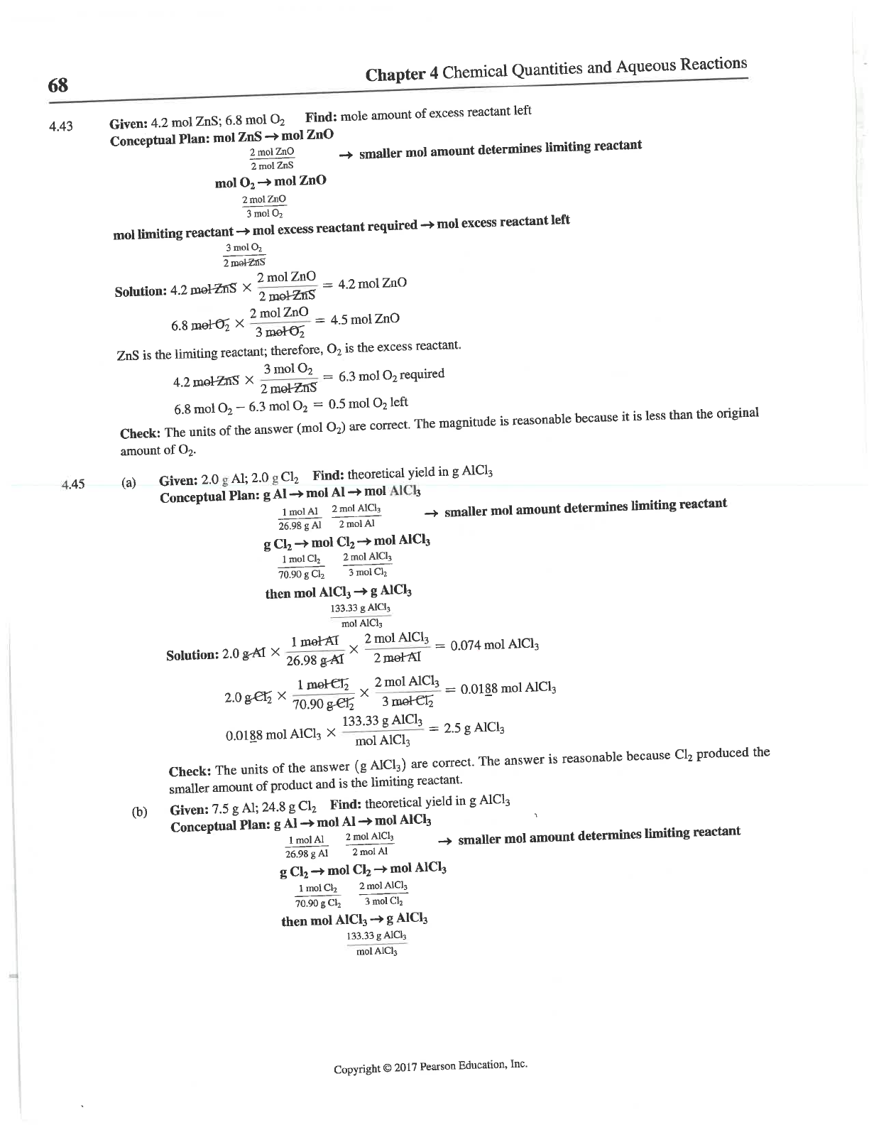 68 Chapter 4 Chemical Quantities and Aqueous Reactions 4.43 Given: 4.2 mol ZnS; 6.8 mol O₂ Find: mole amount of excess reactant left Conceptual Plan: mol ZnS mol ZnO 2 mol ZnO smaller mol amount determines limiting reactant 2 mol ZnS mol O₂ mol ZnO 2 mol ZnO 3 mol O₂ mol limiting reactant mol excess reactant required mol excess reactant left 3 mol O₂ 2 Solution: 4.2 mol X 2 2 mol ZnO = 4.2 mol ZnO 6.8 mol X 2 3 = 4.5 mol ZnO mol ZnO ZnS is the limiting reactant; therefore, O₂ is the excess reactant. 4.2 X 2 3 molZnS mol O₂ = 6.3 mol O₂ required 6.8 mol O₂ - 6.3 mol O₂ = 0.5 mol O₂ left Check: The units of the answer (mol O₂) are correct. The magnitude is reasonable because it is less than the original amount of O₂. 4.45 (a) Given: 2.0 g Al; 2.0 g Cl₂ Find: theoretical yield in g Conceptual Plan: g Al mol Al mol 1 mol Al 2 mol smaller mol amount determines limiting reactant 26.98 g Al 2 mol Al g mol mol 1 mol Cl₂ 2 mol 70.90 g Cl₂ 3 mol Cl₂ then mol g 133.33 g mol Solution: 2.0 26.98 1 X 2 2 mol mol = 0.074 mol 2.0 X 70.90 1 mol X 2 3 mol = 0.0188 mol 0.0188 mol X 133.33 = 2.5 g mol Check: The units of the answer (g are correct. The answer is reasonable because Cl₂ produced the smaller amount of product and is the limiting reactant. (b) Given: 7.5 g Al; 24.8 g Cl₂ Find: theoretical yield in g Conceptual Plan: g Al mol Al mol 1 mol Al 2 mol smaller mol amount determines limiting reactant 26.98 g Al 2 mol Al g Cl₂ mol Cl₂ mol 1 mol Cl₂ 2 mol 70.90 g Cl₂ 3 mol Cl₂ then mol g 133.33 g mol Copyright © 2017 Pearson Education, Inc.