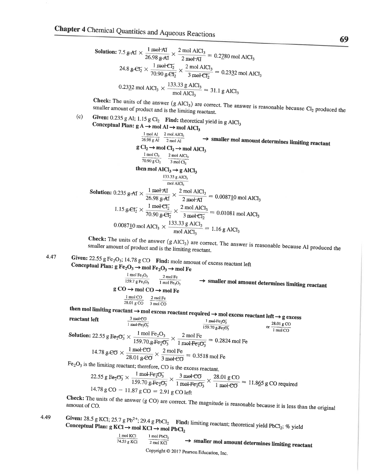 Chapter 4 Chemical Quantities and Aqueous Reactions 69 Solution: 7.5 1 mol X 2 2 mol = 0.2780 mol 24.8 70.90 1 X 2 3 mol = 0.2332 mol 0.2332 mol X 133.33 = 31.1 g mol Check: The units of the answer (g are correct. The answer is reasonable Cl₂ produced the smaller amount of product and is the limiting reactant. (c) Given: 0.235 g Al; 1.15 g Cl₂ Find: theoretical yield in g AICl₃ Conceptual Plan: g A mol Al mol AICI₃ 1 mol Al 2 mol smaller mol amount determines limiting reactant 26.98 g Al 2 mol Al g Cl₂ mol Cl₂ mol 1 mol Cl₂ 2 mol 70.90 g Cl₂ 3 mol Cl₂ then mol AICl₃ g 133.33 g AICI₃ mol Solution: 0.235 X 26.98 1 X 2 2 mol = 0.008710 mol 1.15 X 70.90 1 X 2 3 mol = 0.01081 mol 0.008710 mol X 133.33 mol = 1.16 g Check: The units of the answer (g are correct. The answer is reasonable because Al produced the smaller amount of product and is the limiting reactant. 4.47 Given: 22.55 g Fe₂O₃; 14.78 g CO Find: mole amount of excess reactant left Conceptual Plan: g Fe₂O₃ mol Fe₂O₃ mol Fe 1 mol Fe₂O₃ 2 mol Fe smaller mol amount determines limiting reactant 159.7 g Fe₂O₃ 1 mol Fe₂O₃ g CO mol CO mol Fe 1 mol CO 2 mol Fe 28.01 g CO 3 mol CO then mol limiting reactant mol excess reactant required mol excess reactant left g excess 3 1 molFe₂O₃ 28.01 g CO reactant left or 1 159.70 1 mol CO Solution: 22.55 g X 1 mol Fe₂O₃ X 1 2 mol Fe = 0.2824 mol Fe 14.78 28.01 1 g X 3 2 mol mol Fe = 0.3518 mol Fe Fe₂O₃ is the limiting reactant; therefore, CO is the excess reactant. 22.55 g X 159.70 1 X 1 3 X 28.01 1 mol CO = 11.865 g CO required 14.78 g CO - 11.87 g CO = 2.91 g CO left Check: The units of the answer (g CO) are correct. The magnitude is reasonable because it is less than the original amount of CO. 4.49 Given: 28.5 g 25.7 g Pb²⁺; 29.4 g PbCl₂ Find: limiting reactant; theoretical yield PbCl₂; % yield Conceptual Plan: g KCI mol KCI mol PbCl₂ 1 mol KCI 1 mol PbCl₂ smaller mol amount determines limiting reactant 74.55 g KCI 2 mol Copyright © 2017 Pearson Education, Inc.