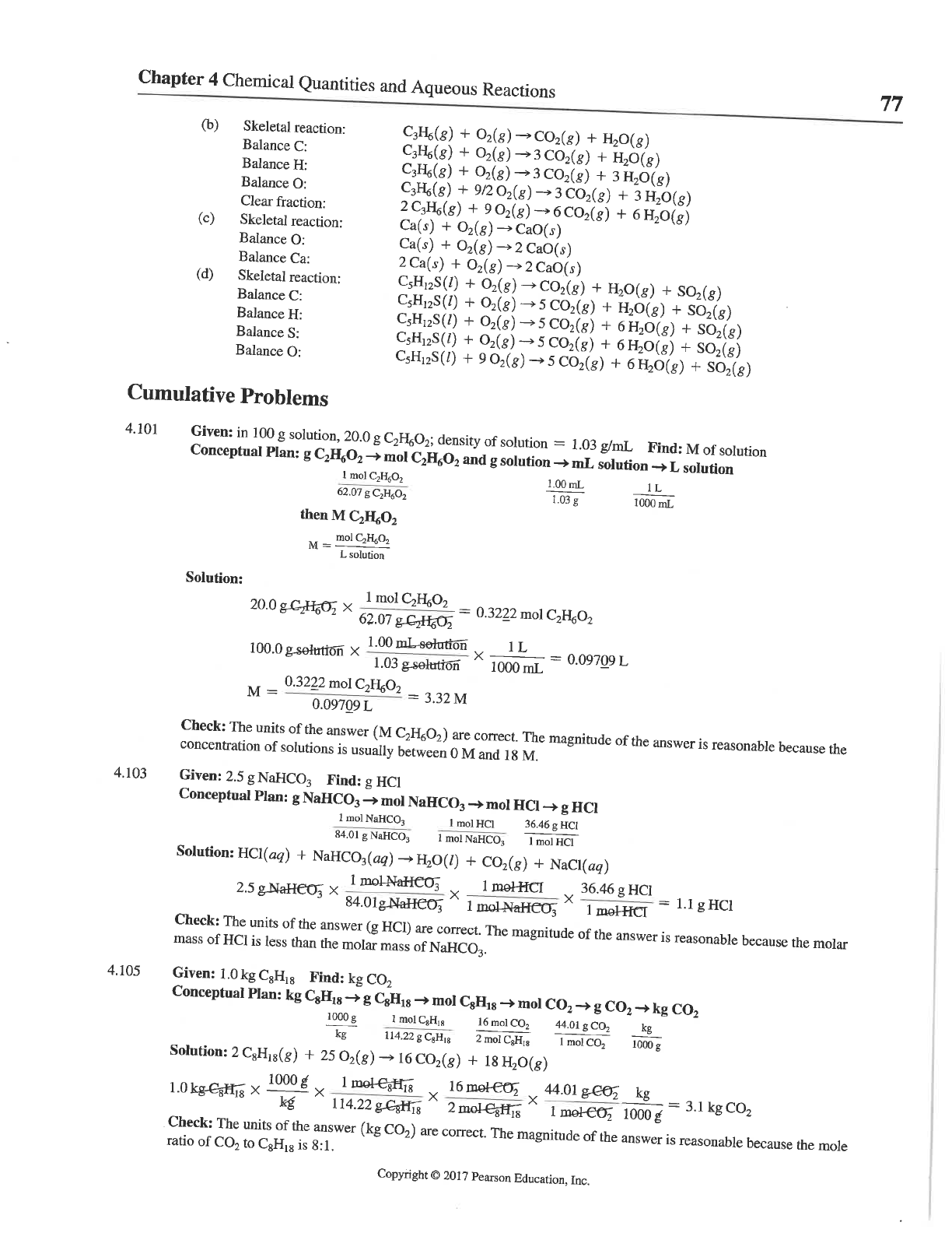 Chapter 4 Chemical Quantities and Aqueous Reactions 77 (b) Skeletal reaction: C₃H₆(₈) + O₂(₈) + Balance C: C₃H₆(₈) + O₂(₈) + Balance H: C₃H₆(₈) + + Balance O: + + Clear fraction: + + 6H₂O(g) (c) Skeletal reaction: Ca(s) + CaO(s) Balance O: Ca(s) + 2 CaO(s) Balance Ca: + (d) Skeletal reaction: C₅H₁₂S(l) + + + SO₂(g) Balance C: C₅H₁₂S(l) + O₂(₈) + + Balance H: + + 6H₂O(g) + Balance S: C₅H₁₂S(l) + + 6H₂O(g) + Balance O: + + + Cumulative Problems 4.101 Given: in 100 g solution, 20.0 g C₂H₆O₂; density of solution = 1.03 g/mL Find: M of solution Conceptual Plan: g C₂H₆O₂ mol C₂H₆O₂ and g solution mL solution L solution 1 mol C₂H₆O₂ 1.00 mL 1L 62.07 g C₂H₆O₂ 1.03 g 1000 mL then M C₂H₆O₂ mol C₂H₆O₂ M = L solution Solution: X 62.07 1 mol C₂H₆O₂ = 0.3222 mol C₂H₆O₂ 100.0 X 1.00 solution X 1000 1L mL = 0.09709 L 1.03 M = 0.3222 0.09709 mol C₂H₆O₂ L = 3.32 M Check: The units of the answer (M C₂H₆O₂) are correct. The magnitude of the answer is reasonable because the concentration of solutions is usually between 0 M and 18 M. 4.103 Given: 2.5 g Find: g Conceptual Plan: g mol NaHCO₃ mol HCI g HCI 1 mol 1 mol 36.46 g HCI 84.01 g 1 mol 1 mol Solution: HCl(aq) + NaHCO₃(aq) + + 2.5 1 X 1 1 X 36.46 1 HCI = 1.1 g Check: The units of the answer (g HCI) are correct. The magnitude of the answer is reasonable because the molar mass of HCI is less than the molar mass of NaHCO₃. 4.105 Given: 1.0 kg C₈H₁₈ Find: kg CO₂ Conceptual Plan: kg C₈H₁₈ g C₈H₁₈ mol C₈H₁₈ mol g kg CO₂ 1000 g 1 mol C₈H₁₈ 16 mol CO₂ 44.01 g CO₂ kg kg 114.22 g C₈H₁₈ 2 mol C₈H₁₈ 1 mol CO₂ 1000 g Solution: 2 + + 18 1.0 X 1000 X 114.22 1 mol X 2 16 mol mol X 44.01 1 mol kg = 3.1 kg CO₂ Check: The units of the answer (kg CO₂) are correct. The magnitude of the answer is reasonable because the mole ratio of CO₂ to C₈H₁₈ is 8:1. Copyright © 2017 Pearson Education, Inc.
