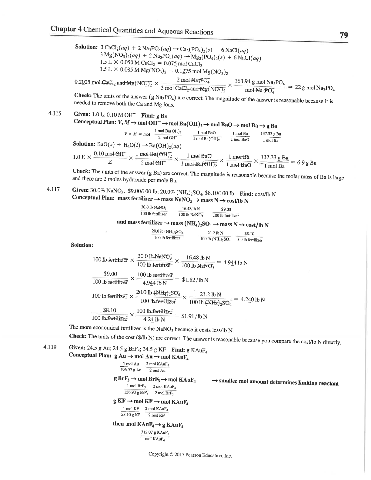 Chapter 4 Chemical Quantities and Aqueous Reactions 79 Solution: 3 CaCl₂(aq) + 2 Ca₃(PO₄)₂(s) + 6 3 Mg(NO₃)₂(aq) + 2 Mg₃(PO₄)₂(s) + 6 NaCl(aq) 1.5L X 0.050 M CaCl₂ = 0.075 mol CaCl₂ 1.5L X 0.085 M Mg(NO₃)₂ = 0.1275 mol Mg(NO₃)₂ 2 mol 163.94 g mol Na₃PO₄ 0.2025 mol and Mg(NO₃)₂ X 3 mol X = 22 g mol Check: The units of the answer (g Na₃PO₄) are correct. The magnitude of the answer is reasonable because it is needed to remove both the Ca and Mg ions. 4.115 Given: 1.0L; 0.10 M OH⁻ Find: g Ba Conceptual Plan: V,M mol OH mol Ba(OH)₂ mol BaO mol Ba g Ba 1 mol Ba(OH)₂ 1 mol BaO 1 mol Ba 137.33 g Ba 2 mol 1 mol Ba(OH)₂ 1 mol BaO 1 mol Ba Solution: BaO(s) + Ba(OH)₂(aq) 0.10 1 mol 1 1 X 137.33 X g Ba X X L 2 mol OH 1 mol Ba(OH)₂ 1 mol BaO = 6.9 g Ba 1 mol Ba Check: The units of the answer (g Ba) are correct. The magnitude is reasonable because the molar mass of Ba is large and there are 2 moles hydroxide per mole Ba. 4.117 Given: 30.0% NaNO₃, $9.00/100 lb; 20.0% (NH₄)₂SO₄, $8.10/100 lb Find: cost/lb N Conceptual Plan: mass fertilizer mass mass N cost/lb N 30.0 lb 16.48 lb N $9.00 100 lb fertilizer 100 lb 100 lb fertilizer and mass fertilizer mass (NH₄)₂SO₄ mass N cost/lb N 20.0 lb (NH₄)₂SO₂ 21.2 lb N $8.10 100 lb fertilizer 100 lb (NH₄)₂SO₄ 100 lb fertilizer Solution: 30.0 NaNO₃ 16.48 lb N 100 lb fertilizer X X = 4.944 lb N 100 lb fertilizer 100 NaNO₃ $9.00 100 lb fertilizer X 100 lb fertilizer $1.82/lb N 4.944 lb N 20.0 lb 21.2 lb N 100 lb fertilizer X X = 4.240 lb N 100 lb fertilizer 100 $8.10 100 lb fertilizer X 100 lb fertilizer = N 4.24 lb N The more economical fertilizer is the NaNO₃ because it costs less/lb N. Check: The units of the cost ($/lb N) are correct. The answer is reasonable because you compare the cost/lb N directly. 4.119 Given: 24.5 g Au; 24.5 g BrF₃; 24.5 g KF Find: g KAuF₄ Conceptual Plan: g Au mol Au mol 1 mol Au 2 mol 196.97 g Au 2 mol Au g BrF₃ mol BrF₃ mol smaller mol amount determines limiting reactant 1 mol 2 mol KAuF₄ 136.90 g BrF₃ 2 mol BrF₃ g KF mol KF mol 1 mol KF 2 mol 58.10 g KF 2 mol KF then mol KAuF₄ g KAuF₄ 312.07 g KAuF₄ mol Copyright © 2017 Pearson Education, Inc.