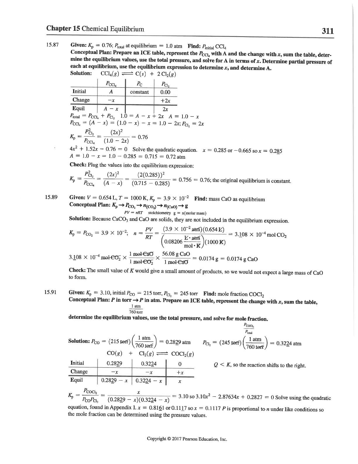 Chapter 15 Chemical Equilibrium 311 15.87 Given: = 0.76; at equilibrium = 1.0 atm Find: Pinitial Conceptual Plan: Prepare an ICE table, represent the with A and the change with x, sum the table, deter- mine the equilibrium values, use the total pressure, and solve for A in terms of x. Determine partial pressure of each at equilibrium, use the equilibrium expression to determine x, and determine A. Solution: C(s) + Pc Initial A constant 0.00 Change -x +2x Equil A 2x = + 1.0 = A - x + 2x A = 1.0 x = (A - x) = (1.0 x) - x = 1.0 2x; = 2x = = (1.0 = 0.76 + 1.52x - 0.76 = 0 Solve the quadratic equation. x = 0.285 or 0.665 so x = 0.285 A = 1.0 x = 1.0 0.285 = 0.715 = 0.72 atm Check: Plug the values into the equilibrium expression: Kₚ = = (A x) = (0.715 0.285) = 0.756 = 0.76; the original equilibrium is constant. 15.89 Given: V = T = 1000 K, Kₚ = 3.9 X 10⁻² Find: mass CaO as equilibrium Conceptual Plan: Kₚ PV = nRT stoichiometry g = n(molar mass) Solution: Because CaCO₃ and CaO are solids, they are not included in the equilibrium expression. Kₚ = Pco₂ = 3.9 X 10⁻²; n = RT PV = (3.9 X 10⁻² = 3.108 X 10⁻⁴ mol CO₂ mol 3.108 10⁻⁴ mol X 1 1 mol X 56.08 1 g CaO = 0.0174 = 0.0174 g CaO Check: The small value of K would give a small amount of products, so we would not expect a large mass of CaO to form. 15.91 Given: = 3.10, initial Pco = 215 torr, = 245 torr Find: mole fraction COCl₂ Conceptual Plan: P in torr P in atm. Prepare an ICE table, represent the change with x, sum the table, 1 atm 760 torr determine the equilibrium values, use the total pressure, and solve for mole fraction. Ptotal 1 atm Solution: = (215 = 0.2829 atm atm CO(g) + Initial 0.2829 0.3224 0 so the reaction shifts to the right. Change -x -x +x Equil 0.2829 x 0.3224 x x = = (0.2829 x x) = 3.10 so 3.10x² - 2.87634x + 0.2827 = 0 Solve using the quadratic equation, found in Appendix I.x = 0.8161 or 0.1117 so x = 0.1117 P is proportional to n under like conditions so the mole fraction can be determined using the pressure values. Copyright © 2017 Pearson Education, Inc.