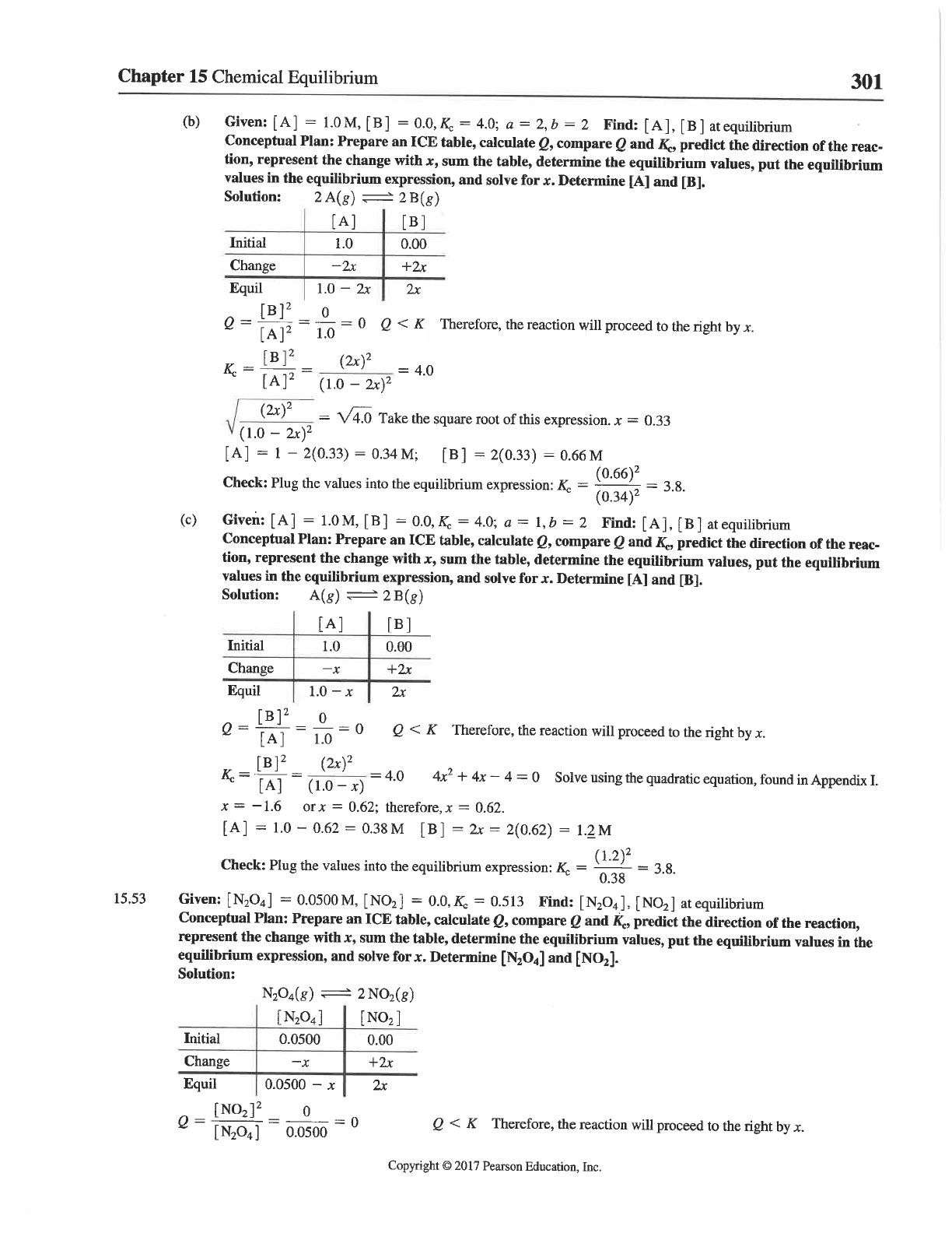Chapter 15 Chemical Equilibrium 301 (b) Given: [A] = 1.0 M, [B] = 0.0, = 4.0; a = Find: [A], [B] at equilibrium Conceptual Plan: Prepare an ICE table, calculate Q, compare Q and Kc, predict the direction of the reac- tion, represent the change with x, sum the table, determine the equilibrium values, put the equilibrium values in the equilibrium expression, and solve for x. Determine [A] and [B]. Solution: 2A(g) 2B(g) [A] [B] Initial 1.0 0.00 Change -2x +2x Equil 1.0 - 2x 2x Q = = 1.0 0 = 0 Therefore, the reaction will proceed to the right by = = (1.0 = 4.0 = V4.0 Take the square root of this expression. x = 0.33 (1.0 [A] = 1 - 2(0.33) = 0.34 M; [B] = 2(0.33) = 0.66 M Check: Plug the values into the equilibrium expression: Kc = (0.66)² = 3.8. (c) Given: [A] = [B] = 0.0, Kc = 4.0; a = 1,b = 2 Find: [A], [B] at equilibrium Conceptual Plan: Prepare an ICE table, calculate Q, compare Q and Kc, predict the direction of the reac- tion, represent the change with x, sum the table, determine the equilibrium values, put the equilibrium values in the equilibrium expression, and solve for x. Determine [A] and [B]. Solution: A(g) 2B(g) [A] [B] Initial 1.0 0.00 Change -x +2x Equil 1.0 - x 2x [B]² 0 = [A] = 1.0 = 0 Therefore, the reaction will proceed to the right by Kc = [B]² [A] = = 4.0 + 4x - 4 = 0 Solve using the quadratic equation, found in Appendix I. x = 1.6 or x = 0.62; therefore, x = 0.62. [A] = 1.0 0.62 = 0.38 M [B] = 2x = 2(0.62) = M Check: Plug the values into the equilibrium expression: = (1.2)² 0.38 = 3.8. 15.53 Given: [N₂O₄] = 0.0500 M, [NO₂] = 0.0, Kc = 0.513 Find: [N₂O₄], [NO₂] at equilibrium Conceptual Plan: Prepare an ICE table, calculate Q, compare Q and Kc, predict the direction of the reaction, represent the change with x, sum the table, determine the equilibrium values, put the equilibrium values in the equilibrium expression, and solve for x. Determine [N₂O₄] and [NO₂]. Solution: 1L [N₂O₄] [NO₂] Initial 0.0500 0.00 Change -x +2x Equil 0.0500 - x 2x Q = = 0 = 0 [N₂O₄] 0.0500 Therefore, the reaction will proceed to the right by x. Copyright © 2017 Pearson Education, Inc.