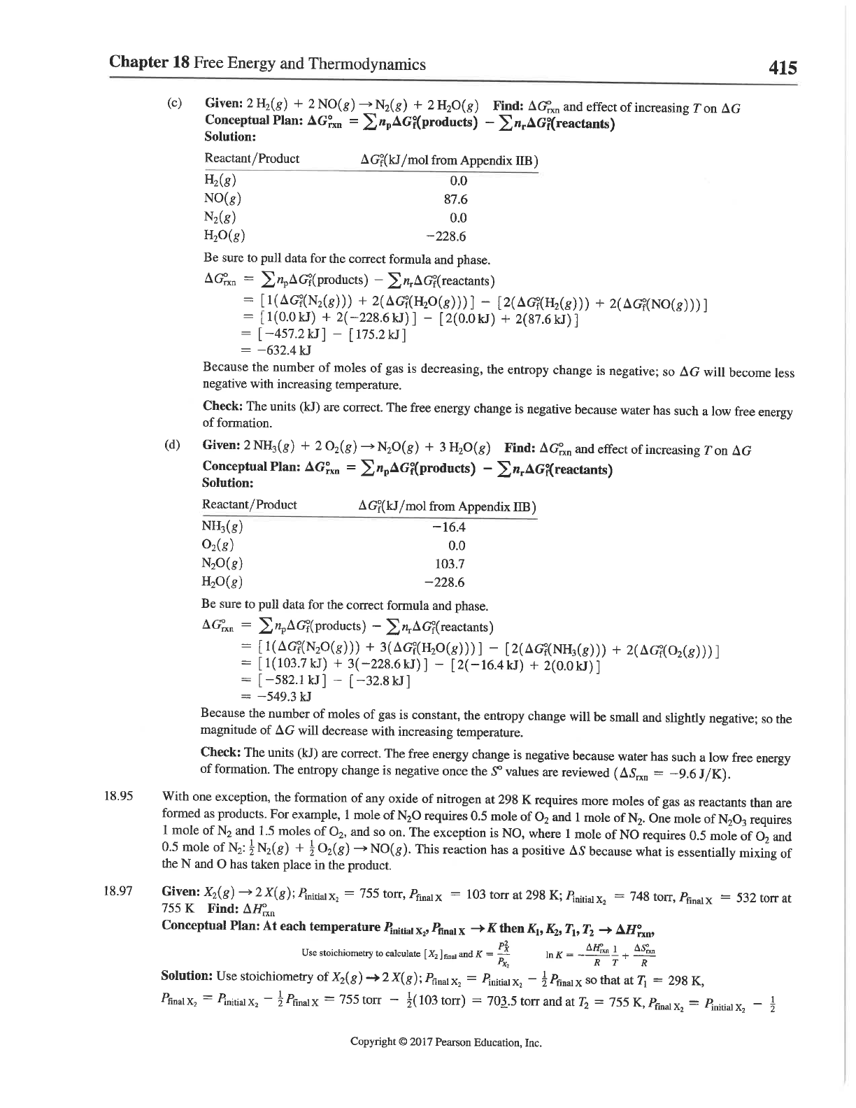 Chapter 18 Free Energy and Thermodynamics 415 (c) Given: 2H₂(g) + 2NO(g) + 2H₂O(g) Find: and effect of increasing T on Conceptual Plan: = Solution: Reactant/Product from Appendix IIB) H₂(g) 0.0 NO(g) 87.6 N₂(g) 0.0 -228.6 Be sure to pull data for the correct formula and phase. = = + + = [1(0.0kJ) + [2(0.0kJ) + 2(87.6kJ)] = [-457.2kJ] [175.2kJ] = -632.4kJ Because the number of moles of gas is decreasing, the entropy change is negative; so G will become less negative with increasing temperature. Check: The units (kJ) are correct. The free energy change is negative because water has such a low free energy of formation. (d) Given: N₂O(g) + 3H₂O(g) Find: and effect of increasing T on AG Conceptual Plan: = Solution: Reactant/Product from Appendix IIB) NH₃(g) -16.4 0.0 103.7 -228.6 Be sure to pull data for the correct formula and phase. = = + + = [1(103.7kJ) + 3(-228.6kJ)] [2(-16.4kJ) + 2(0.0kJ)] = [-582.1kJ] [-32.8kJ] = -549.3kJ Because the number of moles of gas is constant, the entropy change will be small and slightly negative; so the magnitude of G will decrease with increasing temperature. Check: The units (kJ) are correct. The free energy change is negative because water has such a low free energy of formation. The entropy change is negative once the values are reviewed = -9.6J/K). 18.95 With one exception, the formation of any oxide of nitrogen at 298 K requires more moles of gas as reactants than are formed as products. For example, 1 mole of requires 0.5 mole of O₂ and 1 mole of N₂. One mole of requires 1 mole of and 1.5 moles of O₂, and on. The exception is NO, where 1 mole of NO requires 0.5 mole of O₂ and 0.5 mole of + NO(g). This reaction has a positive because what is essentially mixing of the N and O has taken place in the product. 18.97 Given: 2X(g); Pinitial = 755 torr, = 103 torr at 298 K; Pinitial = 748 torr, X = 532 torr at 755 K Find: Conceptual Plan: At each temperature Pinitial K then K1, T₂ Use stoichiometry to calculate final and K = Solution: Use stoichiometry of 2X(g); = Pinitial X₂ that at T₁ = 298 K, = Pinitial X₂ 1/2 = 755 torr torr) = 703.5 torr and at T₂ = 755 K, = Pinitial 1/2 Copyright © 2017 Pearson Education, Inc.