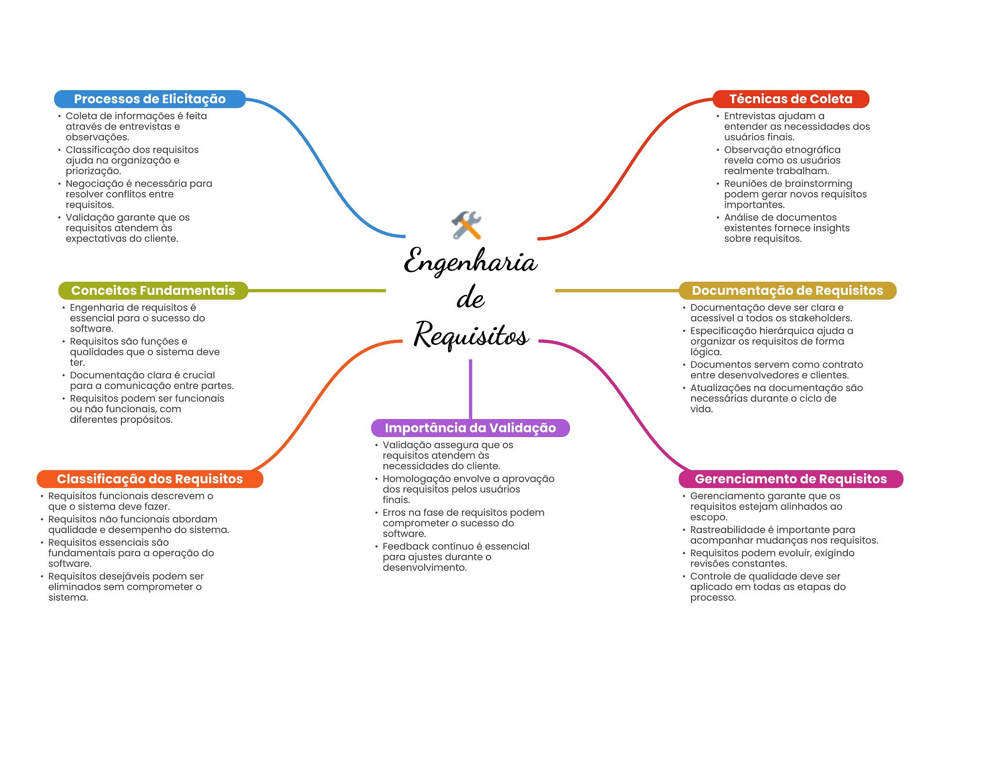 Processos de Elicitação Técnicas de Coleta Coleta de informações é feita Entrevistas ajudam a através de entrevistas e entender as necessidades dos observações. usuários finais. Classificação dos requisitos Observação etnográfica ajuda na organização e revela como usuários priorização. realmente trabalham. Negociação é necessária para Reuniões de brainstorming resolver conflitos entre podem gerar novos requisitos requisitos. importantes. Validação garante que OS Análise de documentos requisitos atendem às existentes fornece insights expectativas do cliente. sobre requisitos. Engenharia Conceitos Fundamentais de Documentação de Requisitos Engenharia de requisitos é Documentação deve ser clara e essencial para sucesso do acessível a todos stakeholders. software. Requisitos são funções e Requisitos Especificação hierárquica ajuda a organizar requisitos de forma qualidades que O sistema deve lógica. ter. Documentos servem como contrato Documentação clara é crucial entre desenvolvedores e clientes. para a comunicação entre partes. Atualizações na documentação são Requisitos podem ser funcionais necessárias durante ciclo de ou não funcionais, com vida. diferentes propósitos. Importância da Validação Validação assegura que requisitos atendem às necessidades do cliente. Classificação dos Requisitos Homologação envolve a aprovação Gerenciamento de Requisitos dos requisitos pelos usuários Requisitos funcionais descrevem finais. Gerenciamento garante que que sistema deve fazer. requisitos estejam alinhados ao Erros na fase de requisitos podem Requisitos não funcionais abordam comprometer sucesso do escopo. qualidade e desempenho do sistema. software. Rastreabilidade é importante para Requisitos essenciais são Feedback contínuo é essencial acompanhar mudanças nos requisitos. fundamentais para a operação do para ajustes durante Requisitos podem evoluir, exigindo software. desenvolvimento revisões constantes. Requisitos desejáveis podem ser Controle de qualidade deve ser eliminados sem comprometer aplicado em todas as etapas do sistema. processo.
