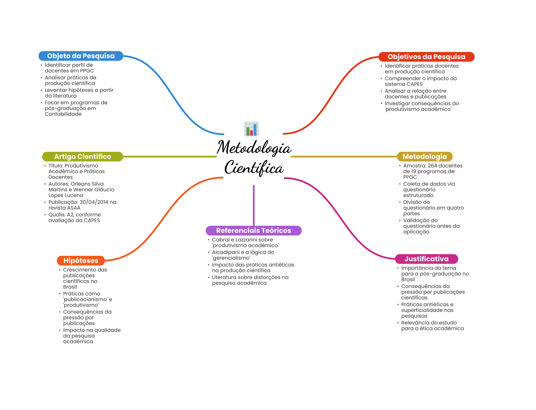 Objeto da Pesquisa Objetivos da Pesquisa Identificar perfil de Identificar práticas docentes docentes em PPGC em produção científica Analisar práticas de Compreender impacto do produção científica sistema CAPES Levantar hipóteses a partir Analisar a relação entre da literatura docentes e publicações Focar em programas de Investigar consequências do pós-graduação em produtivismo Contabilidade Metodologia Artigo Científico Metodologia Título: Produtivismo Científica Amostra: 264 docentes Acadêmico e Práticas de 19 programas de Docentes PPGC Autores: Orleans Silva Coleta de dados via Martins e Wenner Gláucio questionário Lopes Lucena estruturado Publicação: 30/04/2014 na Divisão do revista ASAA questionário em quatro Qualis: A2, conforme partes avaliação da CAPES Validação do questionário antes da Referenciais Teóricos aplicação Cabral e Lazzarini sobre produtivismo Alcadipani e a lógica do Hipóteses Justificativa Impacto das práticas antiéticas Crescimento das na produção científica Importância do tema publicações para a pós-graduação no Literatura sobre distorções na científicas no Brasil pesquisa acadêmica Brasil Consequências da Práticas como pressão por publicações e científicas Práticas antiéticas e Consequências da superficialidade nas pressão por pesquisas publicações Relevância do estudo Impacto na qualidade para a ética acadêmica da pesquisa acadêmica