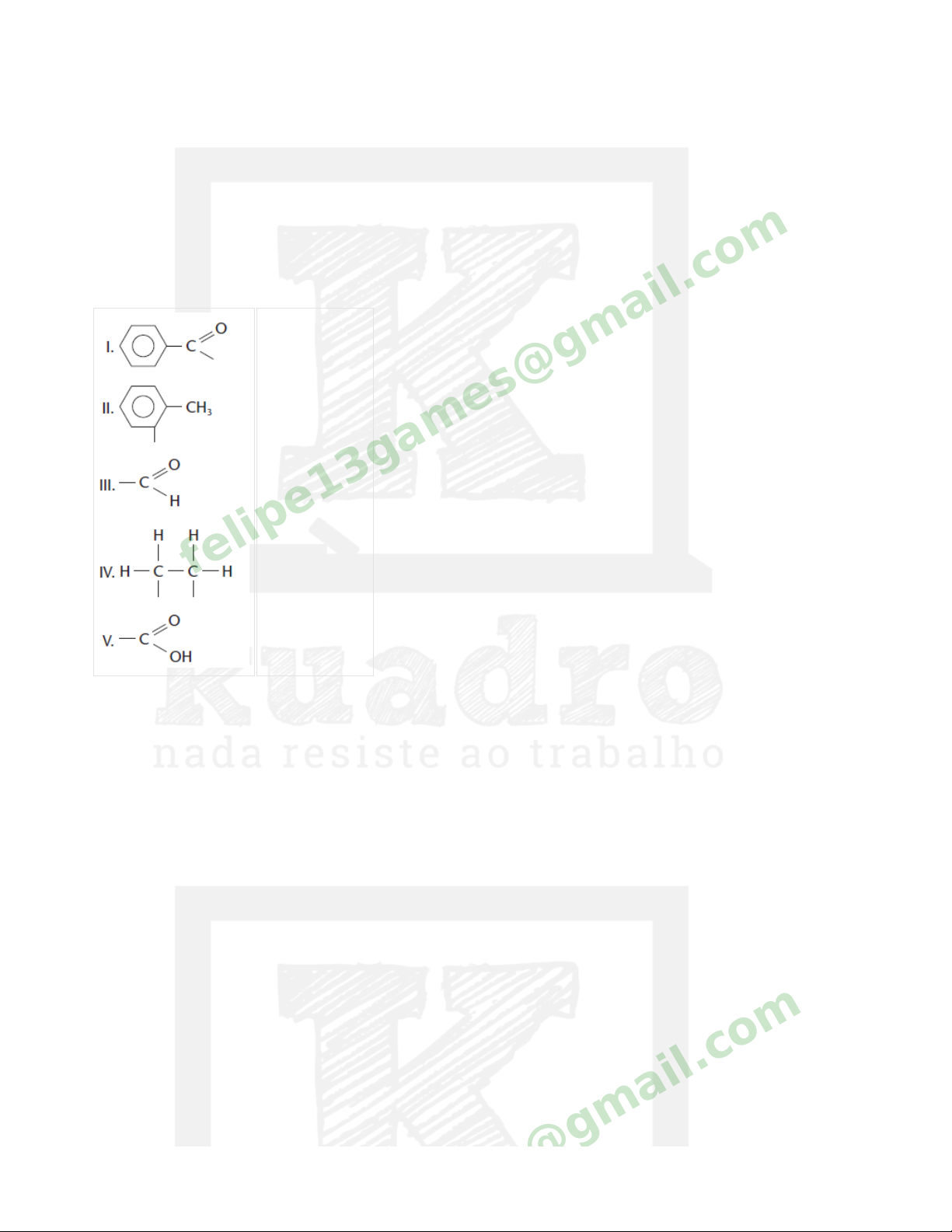 ITA18 - Química LQ2D1-4 - Funções Orgânicas Questão 1 (Unifor-CE) Com relação aos radicais orgânicos, associe a coluna da esquerda com a da direita e assinale a seqüência correta, de cima para baixo: ( ) carboxila ( ) metanoíla ( ) alquileno ( ) acila ( ) o-toluil a) V, IV, III, I, II b) IV, III, V, I, II c) V, III, IV, II, I d) V, III, IV, I, II e) Não sei. felipe13games@gmail.c om Questão 2 (Unifor - CE) Um professor de Química escreveu na lousa a fórmula C3H6O e perguntou a 3 estudantes que composto tal fórmula representava. As respostas fora: estudante 1 - propanona (acetona) estudante 2 - propanal estudante 3 - álcool propíl ico (propanol) felipe13games@gmail.c om O professor considerou certa a resposta dada somente por: a) 1 b) 2 c) 3 d) 1 e 2 e) 2 e 3 f) não sei felipe13games@gmail.c om Questão 3 (UFV - MG) a azadiractina é um composto natural isolado da árvore indiana Azadirachta indica com potente atividade nematicida e antialimentar para insetos. As funções de 1 a 4 marcadas na estrutura da azadiractina são, respectivamente: a) alqueno, álcool, éter, ácido carboxíl ico. b) alqueno, éster, álcool, ácido carboxíl ico. c) alqueno, éter, álcool, éster. d) dieno, cetona, fenol, éster. e) alquino, éter, fenol, cetona. f) não sei. felipe13games@gmail.c om Questão 4 (UFU - MG - adaptada) Segundo estimativa feito pelo governo brasileiro, cerca de 38% dos acidentes com vítimas, no Brasil , são provocados por motoristas embriagados. Assim, na nova Legislação de felipe13games@gmail.c om Trânsito Brasileira, o nível alcoólico máximo permitido aos motoristas diminuirá de 0,8 g de etanol/L de sangue para 0,6 g de etanol/L de sangue. (Folha de S. Paulo, 03/09/97) Qual a quantidade total de etanol (em gramas) que está presente na corrente sanguínea do motorista, para alcançar 0,6 g de etanol/L de sangue, sabendo-se que o volume médio de sangue numa pessoa que pesa 70 kg é de 5,4 L? a) 3,24 g. b) 2,54 g. c) 4,15 g. d) 6,0 g. e) 1,98 g. f) não sei. felipe13games@gmail.c om Questão 5 (UFU - MG - adaptada) Segundo estimativa feito pelo governo brasileiro, cerca de 38% dos acidentes com vítimas, no Brasil , são provocados por motoristas embriagados. Assim, na nova Legislação de Trânsito Brasileira, o nível alcoólico máximo permitido aos motoristas diminuirá de 0,8 g de etanol/L de sangue para 0,6 g de etanol/L de sangue. (Folha de S. Paulo, 03/09/97) Considerando a massa calculada na pergunta 4 (exercício anterior), calcule o volume de etanol, em mL sabendo que sua densidade é 800 kg/m³: a) 2,05 mL b) 3,45 mL. c) 4,05 mL. d) 5,05 mL. e) 6,0 mL. f) não sei. felipe13games@gmail.c om Questão 6 (UFMT - Adaptada) As fragrâncias características dos perfumes foram obtidas durante muito tempo exclusivamente a partir de óleos essenciais extraídos de flores, plantas, raízes e de alguns animais selvagens. Esses óleos receberam o nome de óleos essenciais porque continham a essência, ou felipe13games@gmail.c om seja, aquilo que confere à planta seu odor característico. Embora os óleos essenciais sejam ainda obtidos a partir dessas fontes naturais, têm sido substituídos cada vez mais por compostos sintéticos. Os exemplos abaixo mostram dois compostos, sendo um natural, outro artificial: Julgue os itens. (0) O composto II é o 2-fenil etanol. (1) O composto I é o ácido fenilacético. (2) O composto I possui fórmula molecular C6H8O2. (3) Por definição, nas cetonas a carbonila deve estar entre dois carbonos. Já nos aldeídos, ela deve estar l igada a um hidrogênio e, portanto, precisa ficar na ponta da cadeia. São verdadeiros somente: a) 0 e 1. b) 0, 1 e 2. c) 0, 1 e 3. d) 1, 2 e 3. e) Todos os itens são verdadeiros. f) não sei. felipe13games@gmail.c om Questão 7 (Uepa) O composto possui: a) 3 carbonos primários, 2 secundários e 1 terciário. b) 1 hidrogênio l igado ao carbono terciário. felipe13games@gmail.c om c) cadeia acícl ica, ramificada, saturada e homogênea. d) cadeia alifática, ramificada, saturada e heterogênea. e) o grupo funcional ( O ) que caracteriza um álcool. f) Não sei. felipe13games@gmail.c om Questão 8 (Uepa - adaptada) Dadas as colunas I e II, faça a associação entre fórmulas e funções, identificando a alternativa correta. Coluna I Coluna II a) Aldeído b) Éter c) Álcool d) Cetona e) Éster f) Hidrocarboneto g) Ácido carboxíl ico a) 1-a, 2-b, 3-c, 4-f, 5-d b) 1-a, 2-g, 3-d, 4-f, 5-b c) 1-b, 2-e, 3-c, 4-f, 5-a d) 1-c, 2-g, 3-b, 4-f, 5-a e) 1-c, 2-a, 3-d, 4-e, 5-g f) Não sei. felipe13games@gmail.c om Questão 9 (UFRRJ - adaptada) Leia o texto abaixo, para responder à questão. Fontes renováveis de energia: solução para a crise energética do século 21 As crises vividas pela economia brasileira nas últimas décadas reduziram o ritmo de crescimento do país, mas a demanda por energia continuou crescendo. Mesmo com a queda dos preços internacionais do petróleo e com a descoberta de importantes campos petrolíferos no país, o Brasil felipe13games@gmail.c om conserva ainda hoje uma matriz energética baseada em energias renováveis. Hoje, a energia hidráulica e o petróleo ainda respondem, juntos, por mais de dois terços do consumo energético brasileiro. O gás natural tem pequena participação nesse perfi l , mas a meta do governo brasileiro é a de que o gás natural represente entre 10% e 12% da matriz energética nacional em 2010, com ampliação no uso desse combustível na geração da eletricidade, em equipamentos industriais, nos setores de comércio e de serviços, em residências e em veículos. Observe a matriz energética brasileira: Abaixo estão relacionadas, na coluna A, as fontes energéticas presentes em cada fração da matriz e, na coluna B, os principais componentes uti l izados em cada fonte de energia. COLUNA A COLUNA B (1) Petróleo (2) Energia nuclear (3) Gás natural (4) Carvão mineral (5) Cana-de-açúcar (6) Lenha a) Sacarose (C12H22O11) b) Carbono