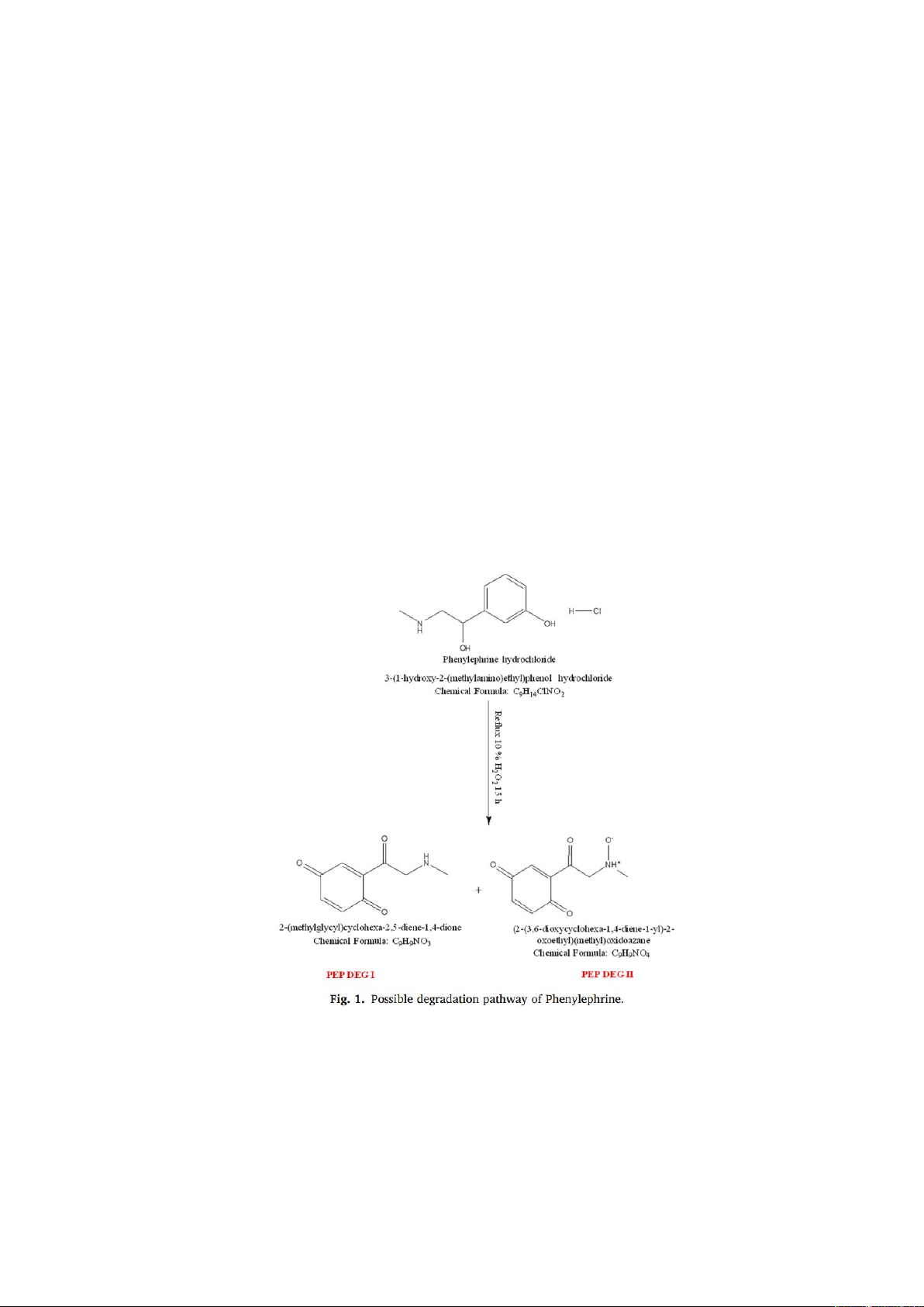 O estudo conduzido por Arunagiri et al. (2025) observou que em condições alcalina e ácida (NaOH 1N e HCl 1N a 60º por 1h) a fenilefrina degradou 10,45% e 4,23%, respectivamente. Nas demais condições (oxidativa, térmica e foto) a degradação foi menor que 3%. Outro estudo encontrou teores de degradação em 5,2%, 4,6% e 4,5% nas condições ácida (HCl 0,1N), térmica e básica (NaOH 0,1N) respectivamente, todas as amostras a 60ºC por 30 minutos (Rekulapally &. Rao, 2015). O DMF corrobora que o IFA apresenta significantes teores de degradação em meio ácido, básico e oxidativo. Marin & Barbas (2004) relatam que em meio oxidativo observou-se degradação de 5,8% da fenilefrina. Quando as mesmas condições de estresse foram aplicadas a uma formulação farmacêutica contra tosse e resfriado os autores foram capazes de confirmar através de análise em HPLC/MS que dois produtos de degradação eram oriundos da fenilefrina degradada em meio oxidativo. Já Kamel & Fawzy (2024) encontraram degradação completa da molécula na condição oxidativa (H2O2 10% a 100ºC por 15h) com o surgimento de dois picos de degradação. Os picos de degradação tiveram sua estrutura identificada por análises de IR e por MS conforme figura abaixo. A pesquisa de Dousa et al. (2011) encontrou, em diferentes preparações farmacêuticas contra resfriado comum que continham fenilefrina, cinco produtos de degradação após a exposição destas por seis meses em câmara a 25º e 60% de umidade relativa. Um dos produtos de degradação é a impureza conhecida Norfenilefrina. Duas das impurezas geradas correspondem a condensação da fenilefrina com formaldeído, conhecida como ciclização fenólica formando tetrahidroisoquinolina (figura). A faixa de pH que esta reação pode ocorrer é muito ampla e foi testada pelos autores através de testes de degradação em meio ácido e básico. A presença do formaldeído é explicada, uma vez que sua formação já foi confirmada em estudos de degradação de açúcares (usar ref do artigo). Por fim, os outros dois produtos de degradação também estão relacionados a reação da fenilefrina com produtos de degradação da sacarose. A sacarose pode ser percursor indireto, em condições térmicas, de derivados de furano como o 5-HMF. A reação entre o 5-HMF e fenilefrina formou 1-[5-(hidroximetil)-2-furil]-2-metil-1,2,3,4-tetraidroisoquinolina-4,8-diol (4,8-THQ-HMF) e 1-[5-(hidroximetil)-2-furil]-2-metil-1,2,3,4-tetraidroisoquinolina-4,6-diol (4,6-THQ-HMF) (Fig. 3), estruturas confirmadas pelos autores. Após a formação do 5-HMF, sua reação com a fenilefrina é acentuada em básico. Ademais, é possível encontrar estudos que trazem a incompatibilidade da fenilefrina sal maleato (Wong et al., 2006; Marín 2005, dissertação battisti, tese Alisson). O ácido maleico, usado para formar sais com fármacos básicos, é um ácido dicarboxílico α,β-insaturado, que na presença de uma amina primária ou secundária forma o sal maleato. Quando exposto a alta temperatura e umidade, ocorre a “reação de Michael” entre a fenilefina e o ácido maleico gerando um produto de degradação chamado N-(succinil) fenilefrina (2-[2-hydroxy-2-(3-hydroxyphenyl)ethyl]methylaminosuccinic acid) (Wong et al., 2006; Marín 2005) (figura abaixo). To evaluate the method’s stability-indicating properties, forced degradation studies were performed on all five analytes. The drug substances were subjected to a range of chemical and physical stress conditions. Hydrolytic degradation was assessed by treating samples with 1 N HCl (acidic) and 1 N NaOH (alkaline) at 60 ◦C for 1 h. Oxidative and reductive stress were induced by exposure to 10 % (v/v) H2O2 and 10 % (w/v) sodium bisulfite respectively, under the same time and temperature conditions. Furthermore, thermal stability was examined by exposing the analytes to 105 ◦C for 6 h in a hotair oven. At the same time, photodegradation was assessed by placing samples in a photostability chamber for the same duration. Following the stress periods, the acid and alkali-treated samples were neutralized. Ecofriendly analytical quality by design-based HPLC method for a quintuple-drug combination: assay, forced degradation, dissolution profiling, and greenness assessment Thirumalai Arunagiri a, Hemanth Kumar Chanduluru b,*, Kanaka Parvathi Kannaiah a,*, Reem H. Obaydo For acidic hydrolysis, a mass of 100 mg of each drug was dissolved separately in aqueous solutions of HCl ranging in molarity from 0.5–3 M and refluxed at 100 ◦C for 8 h. in a rounded flask. Similarly, basic hydrolysis was carried out in the same manner as acidic hydrolysis using NaoH. For the oxidative tests, a mass of 10 mg of each drug was refluxed individually in a rounded flask with 0.5, 1, 3, 5 and 10 % H2O2 aqueous solutions for 15 h at 100 ◦C. The photostability of the powdered pharmaceuticals was determined by exposing them to UV light (254 nm) for 12 h 10 cm away from the source of light in a Petri dish where the drug was dispersed as a homogenous thin layer. Finally, thermal stability was determined by enclosing the medicine ampoules made of glass and heating them in a thermostatic oven at 10 ◦C increments above (50, 60, and 100 ◦C) for 12 h. For PEP, a high degree of stability was noted in the investigated acidic, basic, thermal, and photolytic stress conditions, whereas the peak area of its HPTLC and/or HPLC chromatograms showed no discernible alterations. In contrast, upon treating PEP with 100 mL 10 % H2O2 aqueous solutions for 15 h at 100 ◦C complete degradation was achieved. The disappearance of drug’s HPLC peak and/ or HPTLC band and the appearance of two new peaks at tR 6.23 and 7.37 min (Fig. 3)/Rf = 0.53 and 0.63 (Fig. 4) (for PEP DEG I and PEP DEG II), respectively, were the evidence of the complete degradation. Structural identification of the degradation products, PEP DEG I and PEP DEG II (Fig. 1) was subsequently carried out via IR