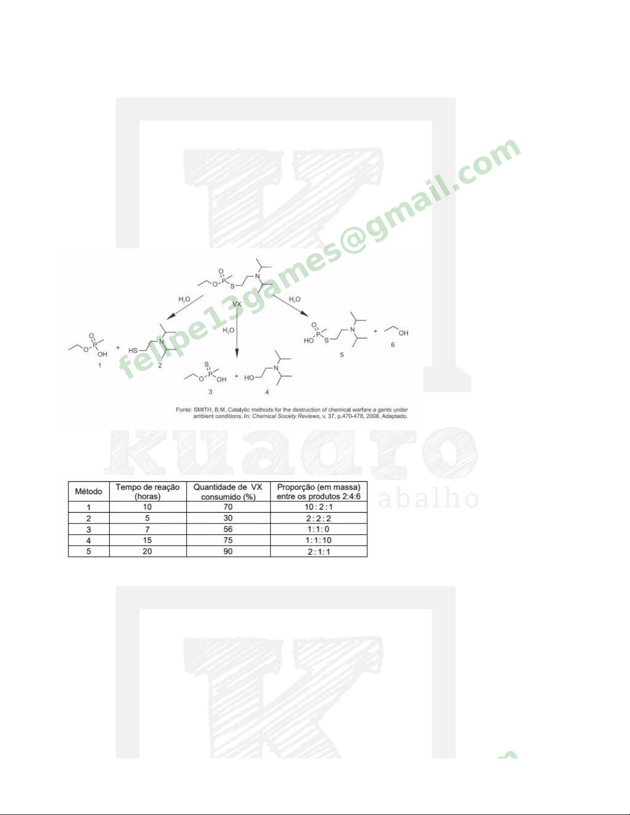 ITA18 - Química LQ8A1-2 - Química Ambiental Questão 1 (Ufpr 2016) O Nobel da Paz de 2013 foi entregue à Organização para a Proibição das Armas Químicas, o que reforçou a preocupação mundial quanto à erradicação desse tipo de armamento. O VX é um agente químico altamente tóxico, classificado como arma de destruição em massa. A eliminação desse agente é realizada via degradação, que pode ocorrer por três caminhos, tal como ilustrado abaixo. No entanto, o composto "5" também pode atuar como arma química, por ser muito mais tóxico que os outros produtos da degradação. O quadro abaixo mostra as condições para detoxificação do agente VX e respectivos resultados pelos diferentes métodos. Com base nas informações fornecidas, qual método de detoxificação é mais eficiente? a) Método 1. b) Método 2. c) Método 3. d) Método 4. e) Método 5. f) Não sei. felipe13games@gmail.c om felipe13games@gmail.c om Questão 2 (Unicamp 2016) A preocupação com a emissão de gases poluentes no meio ambiente está muito presente na indústria automobil ística. Recentemente, uma das soluções encontradas para contornar esse problema nos veículos movidos a Diesel foi o desenvolvimento do Arla 32, uma solução de ureia em água, que atua nos sistemas de exaustão, de acordo com as equações químicas abaixo: Com base nessas informações, pode-se afirmar corretamente que a ação do Arla 32 leva a uma redução a) da emissão das espécies NOx, e não contribui para a poluição atmosférica. b) completa do NO e apenas da metade do NO2 emitido, mas contribui para a poluição atmosférica. c) completa do NO, mas somente reduz a emissão de NO2 depois que acabar o NO, e não contribui para a poluição atmosférica. d) da emissão das espécies NOx, mas contribui para a poluição atmosférica. e) não sei. felipe13games@gmail.c om Questão 3 (Uemg 2016) “Se Itaipu fosse uma hidrelétrica a óleo, o Brasil teria que queimar 434 mil barris de petróleo por dia para obter o mesmo resultado. O volume de terra e rocha removido é equivalente a duas vezes o Pão de Açúcar. A altura da barragem principal equivale a um edifício de 65 andares. (...) calculei que por ali devia escoar uma catarata. O guia corrigiu a minha besteira: ‘não uma, mas quarenta cataratas do Iguaçu’.” VENTURA, 2012, p. 121. Inúmeras são as fontes de energia disponíveis no nosso planeta, sendo que essas fontes se dividem em dois tipos, as fontes renováveis e as não renováveis. As fontes de energias renováveis são aquelas em que sua uti l ização e uso podem ser mantidos e aproveitados ao longo do tempo sem possibil idade de esgotamento. As fontes de energia renováveis onde atualmente existe um maior desenvolvimento estão exemplificadas na tabela abaixo: De acordo com a tabela e com seus conhecimentos a respeito de combustíveis e energia, está CORRETO o que se afirma em: felipe13games@gmail.c om a) Apesar de existir em abundância no Brasil , e ser economicamente viável, a energia solar ainda é pouco explorada por razões políticas. b) Em regiões cercadas por montanhas e de muita terra, a melhor alternativa energética dentre as destacas seria a eólica. c) Por ser obtida a partir de bagaço de cana-de-açúcar, álcool, madeira, palha de arroz, óleos vegetais, dentre outros, a biomassa poderia ser uma alternativa economicamente viável em regiões de terra férti l . d) Sabe-se que a fonte do etanol é renovável, podendo ser extraído da cana-de-açúcar e também da beterraba, mas em termos de emissão de CO2/mol de combustível, é tão poluente quanto a gasolina. e) Não sei. Questão 4 (Acafe 2016) Considere os trechos retirados da portaria número 2914, de 11 de dezembro de 2011, do Ministério da Saúde, que dispõe sobre os procedimentos de controle e de vigilância da qualidade da água para consumo humano e seu padrão de potabil idade. Art. 30, § 1º: […] o valor máximo permitido de turbidez é 5,0 uT em toda a extensão do sistema de distribuição (reservatório e rede) [...]. Art. 38: […] Os níveis de triagem que conferem potabil idade da água do ponto de vista radiológico são valores de concentração de atividade que não excedem 0,5 Bq / L para atividade alfa total e 1,0 Bq / L para beta total. [...]. Art. 39, § 1º: […] Recomenda-se que, no sistema de distribuição, o pH da água seja mantido na faixa de 6,0 a 9,5 [...]. Art. 39, § 4, inc. III: […] Recomenda-se que, no sistema de distribuição, as concentrações de íons ferro e manganês não ultrapassem 2,4 e 0,4 mg / L, respectivamente [...]. Um automóvel do tipo “zero quilômetro” contém a Etiqueta Nacional de Conservação de Energia (ENCE) mostrada a seguir felipe13games@gmail.c om Dados: Considerar os valores do l itro da gasolina e etanol respectivamente: R$ 3,40 e R$ 2,50. Baseado nas informações fornecidas e nos conceitos químicos, analise as afirmações a seguir. I. Nas condições abordadas é mais vantajoso financeiramente uti l izar a gasolina como combustível, seja o veículo uti l izado na cidade ou na estrada. II. O etanol é uma substância polar possuindo um grupo hidroxila. III. A gasolina é constituída, em sua maioria, por hidrocarbonetos. IV. Em termos de poluição ambiental por CO2 o etanol (produzido a partir da cana-de-açúcar) é menos poluente que a gasolina. Assinale a alternativa correta. a) Todas as afirmações estão corretas. b) Apenas II e III estão corretas. c) Apenas I e IV estão corretas. d) Apenas I, II e III estão corretas. e) Não sei. Questão 5 (Enem PPL 2015) O quadro apresenta a composição do petróleo. felipe13games@gmail.c om Para a separação dos constituintes com o objetivo de produzir a gasolina, o método a ser uti l izado é a a) fi ltração. b) desti lação. c) decantação. d) precipitação. e) centrifugação. f) não sei. felipe13games@gmail.c om Questão 6 (Ucs 2015) O Pré-Sal é uma faixa que se estende ao 