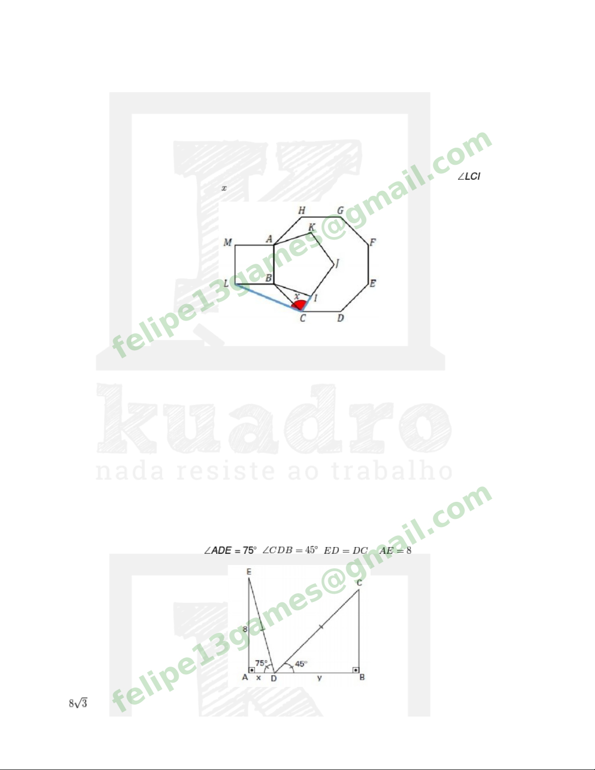 ITA18 - Matemática LMAT8-15 Geometria Plana 2 Questão 1 (OBM – 201" ) Na figura a seguir sabe-se que ABCDEFGH é um octógono regular, ABIJK é um pentágono regular e ABLM é um quadrado. Determine a medida em graus do ângulo representado na figura pela letra a) 81º b) 90º c) 92º d) 99º e) 102º felipe13games@gmail.c om Questão 2 (OBM) Na figura abaixo A, D e B são pontos colineares. ADE e DBC, são triângulos retângulos com ângulo reto A e B respectivamente.Se ; , e , então x+y é igual a: a) felipe13games@gmail.c om b) c) d) e) felipe13games@gmail.c om Questão 3 (ITA - 2008) Considere o triângulo ABC isósceles em que o ângulo distinto dos demais, BAC, mede 40º. Sobre o lado AB, tome o ponto E tal que ACE = 15º. Sobre o lado AC, tome o ponto D tal que DBC = 35º. Então, o ângulo EDB vale: a) 35º b) 45º c) 55º d) 75º e) 85º felipe13games@gmail.c om Questão 4 No quadrilátero convexo e . A razão entre a distância de ao circuncentro de e a medida do segmento de reta é a) b) c) d) e) felipe13games@gmail.c om Questão 5 (OBM - 2015) No desenho abaixo, o segmento CF é tangente ao semicírculo de diâmetro AB. Se ABCD é um quadrado de lado 4, determine o comprimento de CF. felipe13games@gmail.c om a) 9/2 b) 5 c) 1/2 d) 23/4 e) 6 felipe13games@gmail.c om Questão 6 (OBM - 2013) Seja ABC um triângulo retângulo em A. Seja D o ponto médio de AC. Sabendo que BD = 3DC e que AC = 2, a hipotenusa do triângulo é: a) b) c) d) e) felipe13games@gmail.c om Questão 7 (OBM - 2013) Na figura abaixo o ponto O é o centro da circunferência que passa pelos pontos A, B, C, D e E. Sabendo que o diâmetro AB e a corda CD são perpendiculares e que o valor em graus do ângulo é: felipe13games@gmail.c om a) 35º b) 10º c) 20º d) 30º e) 55º felipe13games@gmail.c om Questão 8 (OLIMPÍADA DE MATEMÁTICA DO CA�GURU SEM FRONTEIRAS - 2014) Um quadrado, apoiado sobre uma reta, tem os outros dois vértices sobre duas circunferências de raio 1 tangentes entre si e à reta de apoio, conforme figura ao lado. Quanto mede o lado do quadrado? a) 2/5 b) 1/4 c) 1/ d) 1/5 e) 1/2 felipe13games@gmail.c om felipe13games@gmail.c om Questão 9 (OBM - 2012) Na figura a seguir, o ângulo é reto; a reta r corta os segmentos AB e BC em D e E, respectivamente; as retas CD e AE se cortam em F; P e Q são as projeções ortogonais de A e C sobre a reta r, respectivamente. Sendo o ângulo entre as retas CD e AE igual a , a medida de , em graus, é: a) 110 b) 120 c) 130 d) 140 e) 160 felipe13games@gmail.c om Questão 10 (OLIMPÍADA ARGENTINA) Na figura: Dado que ABC é um triângulo retângulo em C. ADE é um triângulo retângulo em A. ED = 2 x AB e o ângulo EBC = 18º, podemos afirmar que a medida, em graus, do ângulo ABE é: a) 30º b) 54º felipe13games@gmail.c om c) 36º d) 60º e) 40º felipe13games@gmail.c om Questão 11 (OBM) Um terreno quadrangular foi dividido em quatro lotes menores por duas cercas retas unindo os pontos médios dos lados do terreno. As áreas de três dos lotes estão indicadas em metros quadrados no mapa ao lado. Qual é a área do quarto lote, em metros quadrados, representado pela região destacada no mapa? a) 240 b) 220 c) 300 d) 230 e) 260 felipe13games@gmail.c om Questão 12 (OLIMPÍADA COLOMBIANA) Na figura abaixo ABC é um triângulo retângulo. Inscrito neste triângulo temos o retângulo HIJE de altura h. Se DEFG e JKLM são quadrados de lados a e b respectivamente, podemos afirmar que: felipe13games@gmail.c om a) h = (a+b)/2 b) h = (a+b)/3 c) h = a + b d) h = 2(a+b) e) h = 3(a+b) felipe13games@gmail.c om Questão 13 (OLIMPÍADA AUSTRALIANA) Determine, em graus, o valor de S: S = u + v + w a) 90 b) 100 c) 120 d) 150 e) 180 felipe13games@gmail.c om Questão 14 (OBM) Seja ABC um triângulo retângulo em A. O ponto D pertence ao lado AC e é tal que BD = CD. Sejam M o ponto médio de BC e N a interseção de AM e BD. Sendo N o ponto médio de AM, qual a medida em graus, do ângulo ? felipe13games@gmail.c om a) 15 b) 22,5 c) 30 d) 37,5 e) 45 felipe13games@gmail.c om Questão 15 No triângulo retângulo ABC, , AB = 5 cm e BC = 9 cm. Se I é o incentro de ABC, determine o comprimento do segmento CI. felipe13games@gmail.c om Questão 16 (OBM - 2012) O teorema de Morley diz que, ao traçarmos as retas que dividem cada ângulo interno de um triângulo ABC em três ângulos iguais, obtemos um triângulo equilátero chamado triângulo de Morley de ABC, como o que está destacado na figura a seguir: Qual é a medida do lado do triângulo de Morley de um triângulo retângulo isósceles cujos catetos medem 2? a) b) c) d) e) felipe13games@gmail.c om felipe13games@gmail.c om Questão 17 (OBM) Na figura, a reta PQ toca em N o círculo que passa por L, M e N. A reta LM corta a reta PQ em R. Se LM = LN e a medida do ângulo PNL, em graus, é , , quanto mede o ângulo LRP? a) b) c) d) e) felipe13games@gmail.c om Questão 18 (OLIMPÍADA ITALIANA) Dado os ângulos A, B, C e D, quanto vale a soma E + F? a) A + B + C+ D b) (A + B + C + D) / 2 c) 360º – A – B – C – D d) 360º + A + B – C – D e) nenhuma das alternativas. felipe13games@gmail.c om felipe13games@gmail.c om Questão 19 (OMU) Considere um ponto P no interior de um retângulo ABCD e tal que , e . Determine o comprimento do segmento . felipe13games@gmail.c om Questão 20 No triângulo ABC, M é o ponto médio do lado AC, BP é bissetriz do ângulo ABC, e . Se os lados AB e BC medem 6 e 10 respectivamente, PM mede: a) 1 b) 2 c) d) e) felipe13games@gmail.c om Questão 21 (OBM - 2012) felipe13games@gmail.c om No triângulo ABC, seja AD a altura relativa a BC. Quantos triângulos não congruentes satisfazem com AD = 2012 e BD e CD ambos inteiros? Note que AB e AC não precisam ser inteiros. felipe13games@gmail.c om Questão 22 Considere um triângulo ABC com ângulos BAC = 50º, ABC = 60º, seja M o ponto médio de AB, seja um ponto P pertencente ao lado BC tal que AC + PC = PB, determine a medida do ângulo MPC