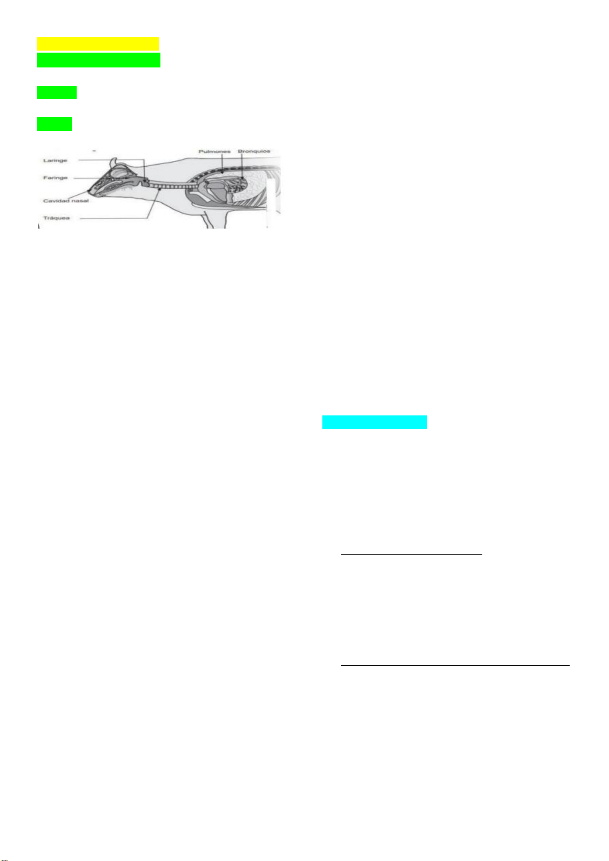 N2 – Técnica de Necropsia SISTEMA RESPIRATÓRIO Dividido em parte superior e inferior: Superior narinas e cavidade nasal, faringe e laringe; Inferior traqueia, pulmões, brônquios, bronquíolos, ductos alveolares e alvéolo. Porção: Condução Transição (entre a porção condutora e respiratória) Respiração Epitélio pseudoestratificado cilíndrico ciliado com células caliciformes tem grande importância, pois é extremamente sensível. Quando esse epitélio é lesionado, todo o sistema de defesa do trato respiratório fica comprometido. Um exemplo são animais expostos à fumaça, como: os que ficam próximos a incêndios (por ex, em áreas do pantanal) ou até mesmo que convivem com pessoas fumantes (se tornam fumantes passivos). A fumaça tóxica e quente danifica o epitélio ciliado, que é responsável pelo batimento dos cílios e pela remoção do muco. Além da fumaça, VÍRUS também podem causar lesões nesse epitélio. Esses agentes patológicos, que são leves, geralmente penetram pelas vias aéreas (via erógena), replicam-se nas células do epitélio e o destroem. Com a destruição do epitélio, o sistema mucociliar deixa de funcionar adequadamente, dificultando a eliminação do muco e das impurezas. Assim, bactérias oportunistas conseguem se instalar, levando a infecções secundárias com exsudato purulento, que podem evoluir para pneumonias, especialmente pneumonias mais tardias. É essencial haver integridade do epitélio respiratório em toda a porção condutora. A mucosa tem papel protetor, pois o muco retém partículas e impurezas. As narinas, por sua vez, são altamente vascularizadas por isso sangram facilmente e ajudam na termorregulação, aquecendo o ar inspirado. Quando o ar frio entra sem ser aquecido, pode causa lesões no trato respiratório. Por isso, a respiração nasal é fundamental: ela aquece o ar, filtra impurezas e facilita a eliminação posterior do muco (o “catarro”), mantendo o sistema respiratório saudável. A porção respiratória se localiza dentro dos alvéolos pulmonares, que são estruturas muito finas, altamente vascularizadas. Nessa região há vasos sanguíneos que permitem a troca gasosa (hematose). Cada alvéolo é como um pequeno “saquinho” que deve conter apenas ar, em seu interior para que as trocar ocorram corretamente. O pulmão normal apresenta coloração rosa claro, resultando da mistura entre o sangue capilar e o ar. Quando ocorre espessamento da parede alveolar, seja por processos inflamatórios ou por edema, a barreira hematoaérea se torna mais espessa, dificultando a hematose (passagem de oxigênio e gás carbônico entre o ar e o sangue). Bactérias oportunistas O trato respiratório superior dos animais é naturalmente contaminado, ou seja, essas bactérias habitam normalmente a cavidade seu causar lesões. O problema ocorre quando há queda de imunidade ou condições predisponentes, permitindo que elas se aproveitem e causem infecções graves, como pneumonias. Principais bactérias comensais: Mannheimia haemolytica bovinos. Pasteurella multocida gato, bovinos e suínos. Responsável pela rinite atrófica em suínos. Bordetella bronchiseptica caninos e suínos. Fatores de agressão contínua ao trato respiratório O TR está continuamente exposto a agressões externas, tais como: Agentes alérgicos, como pólen. Micro-organismos (bactérias, vírus, parasitas – ex: Oestrus ovis). Estruturas vegetais, como grimpas de pinheiro. Gases irritantes, por ex: ambientes sujos (bezerreiros, apriscos, areia de gatos); acúmulo de amônia proveniente de urina e fezes no chão. Esses gases e partículas irritam e lesionam o epitélio nasal, predispondo à entrada de bactérias. Essas agressões são comuns no dia a dia (poeira, pólen), mas podem facilitar o desenvolvimento de infecções secundárias por bactérias já presentes no TR. Equinos = 2000m2 de superfície de contato pulmonar. Muita área sujeita a sofrer lesão. Mecanismos de defesa do Sistema Respiratório Defesas estruturais – sistema mucociliar. É o principal mecanismo de defesa. Ele produz muco, onde as partículas ficam presas (retenção), e os cílios realizam o batimento (limpeza), levando o muco até a faringe. O animal pode escarrar ou engolir esse muco, e ao engolir, o ácido estomacal destrói os MO contidos nele (vírus e bactérias). Etapas do sistema mucociliar: 1. Deposição: as partículas se depositam sobre o epitélio; 2. Retenção: o muco prende essas partículas; 3. Limpeza: o batimento ciliar remove o muco para fora do trato respiratório. Tamanho das partículas e onde se depositam: 10μm retidas nas vias nasais (partículas grandes) 2 a 10μm alcançam a traqueia (partículas médias) Menores que 2μm chegam até o pulmão (partículas muito pequenas, como vírus). Exemplos: Vírus 0,01 a 0,45μm partículas leves, ficam suspensas no ar. Ex: vírus da raiva – pode ser inalado em cavernas com colônias de morcegos infectados. Bactérias 0,3 a 15μm partículas mais pesadas *Isso determina o tipo de pneumonia que o animal tem. Geralmente as broncopneumonias são causadas por coisas pesadas bactérias! Pneumonias intersticiais geralmente são causadas por vírus! Pólen 10 a 100μm partículas grandes, irritantes (ex: pólen de pinus [pó amarelo] ou flores). Podem causar asma em cavalos e gatos. Além das estruturas (cílios, muco, células caliciformes/epitélio), temos: Defesas celulares inespecíficas Mesmo com o sistema mucociliar atuando, algumas partículas podem chegar até os alvéolos, onde há células de defesa residentes, provenientes do: Tecido linfoide associado aos brônquios (BALT); Macrófagos residentes que ficam dentro do parênquima pulmonar (dentro do alvéolo). Se algo passou por todo esse sistema anterior e foi parar dentro do pulmão, ainda tem o macrófago pra tentar fazer fagocitose, proveniente desse tecido do BALT. Principais células: Macrófagos Neutrófilos: também realizam fagoci