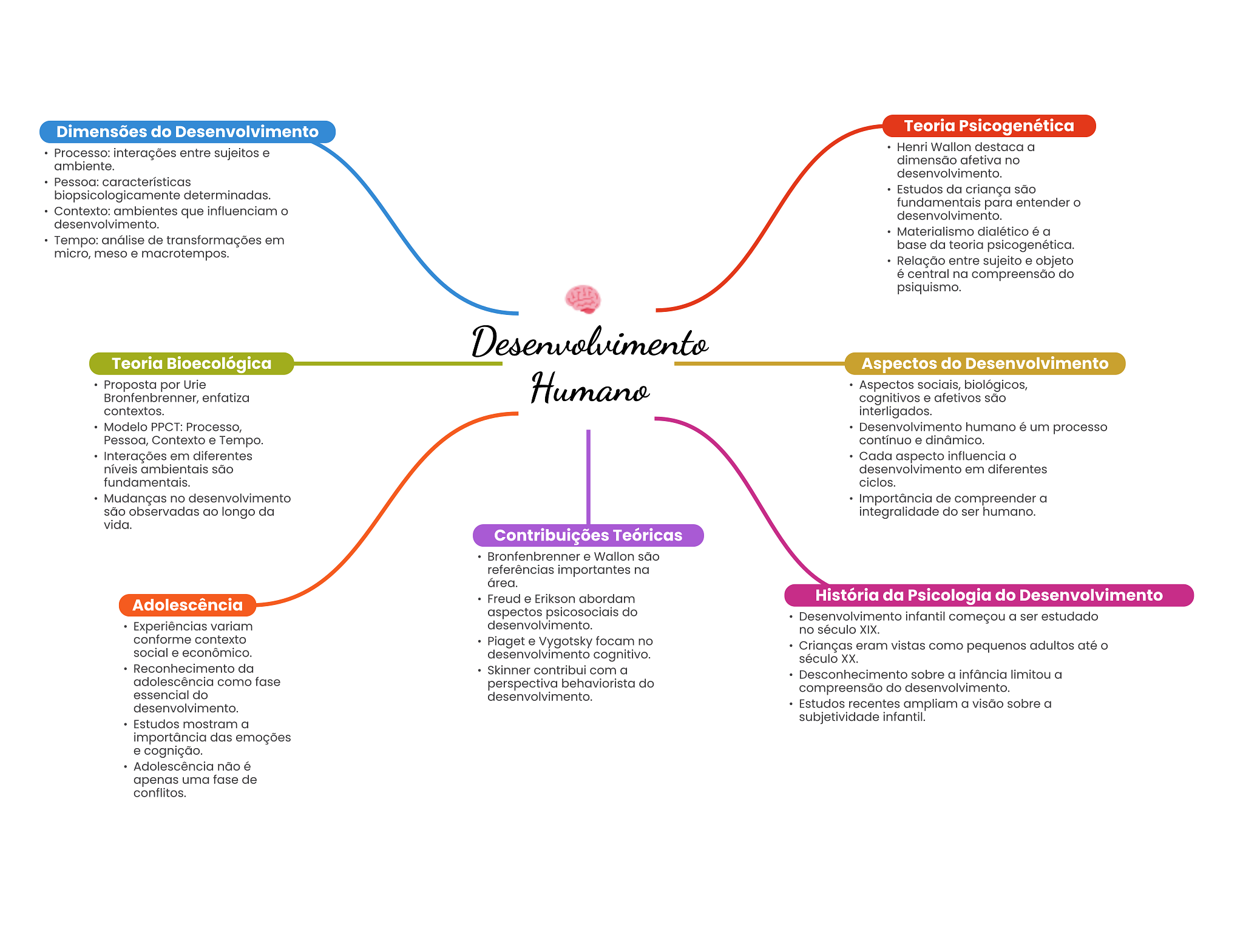 Dimensões do Desenvolvimento Teoria Psicogenética Henri Wallon destaca a Processo: interações entre sujeitos e dimensão afetiva no ambiente. desenvolvimento. Pessoa: características biopsicologicamente determinadas. Estudos da criança são fundamentais para entender Contexto: ambientes que influenciam desenvolvimento. desenvolvimento. Materialismo dialético é a Tempo: análise de transformações em base da teoria psicogenética. micro, meso e macrotempos. Relação entre sujeito e objeto é central na compreensão do psiquismo. Desenvolvimento Teoria Bioecológica Aspectos do Desenvolvimento Proposta por Urie Bronfenbrenner, enfatiza Humano Aspectos sociais, biológicos, cognitivos e afetivos são contextos. interligados. Modelo PPCT: Processo, Desenvolvimento humano é um processo Pessoa, Contexto e Tempo. contínuo e dinâmico. Interações em diferentes Cada aspecto influencia O níveis ambientais são desenvolvimento em diferentes fundamentais. ciclos. Mudanças no desenvolvimento Importância de compreender a são observadas ao longo da integralidade do ser humano. vida. Contribuições Teóricas Bronfenbrenner e Wallon são referências importantes na área. Freud e Erikson abordam História da Psicologia do Desenvolvimento Adolescência aspectos psicosociais do Desenvolvimento infantil começou a ser estudado Experiências variam desenvolvimento. no século XIX. conforme contexto Piaget e Vygotsky focam no social e econômico. Crianças eram vistas como pequenos adultos até desenvolvimento cognitivo. século XX. Reconhecimento da Skinner contribui com a Desconhecimento sobre a infância limitou a adolescência como fase perspectiva behaviorista do essencial do compreensão do desenvolvimento. desenvolvimento. desenvolvimento. Estudos recentes ampliam a visão sobre a Estudos mostram a subjetividade infantil. importância das emoções e cognição. Adolescência não é apenas uma fase de conflitos.