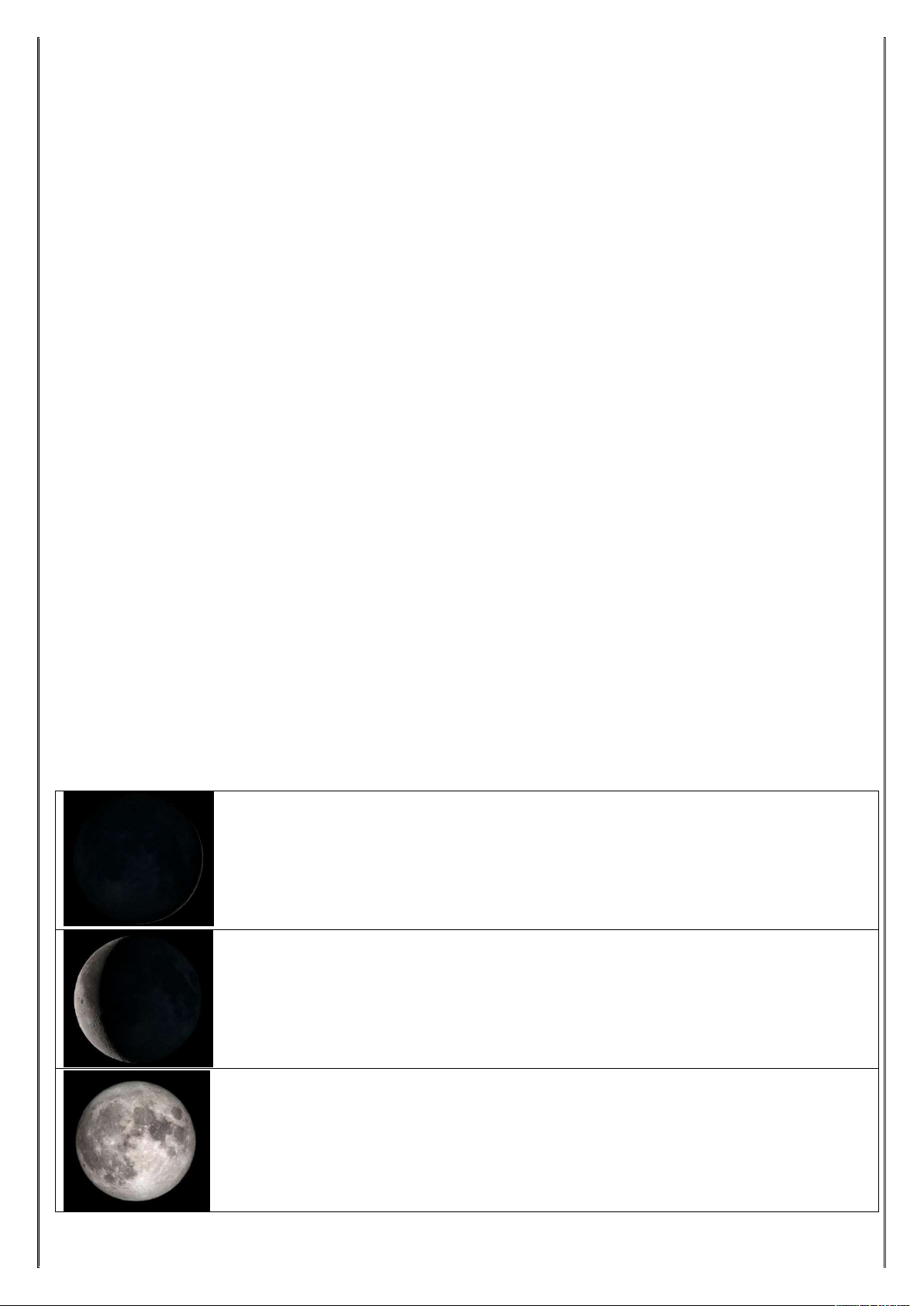 ESCOLA MUNICIPAL JOSÉ MARINHO FALCÃO DISCIPLINA : CIÊNCIAS ALUNO (A) ____________________________________________________________________________ PROFESSOR: LEILSON ARAÚJO ATIVIDADES PARTE 2 – MOVIMENTOS DA LUA Tema/ objeto de conhecimento: Terra e Universo: Sistema Sol, Terra e Lua. As fases da Lua: A Lua é o único satélite natural do planeta Terra, sendo formado há bilhões de anos atrás, cuja hipótese de origem mais aceita pelos cientista é que ocorreu após o impacto de um grande corpo celeste, do tamanho aproximado de Marte, atingir nosso jovem planeta, ejetando partículas que se juntaram e formaram nosso satélite, mas existem outras teorias que estão em debate. Do ponto de vista terrestre, a Lua é um astro brilhante nas noites em nosso planeta, mas a Lua não pode emitir luz, na verdade ela reflete a luz do Sol, a estrela que aquece e ilumina nosso planeta e sistema solar. A Lua apresenta movimentos de translação, rotação e revolução. A translação é o movimento que a Lua faz, junto com a Terra ao redor do Sol, levando o mesmo tempo que a terra para fazer o percurso. A rotação é o movimento que a Lua faz ao girar em torno do seu próprio eixo. E a revolução é o movimento que a Lua faz ao girar ao redor da Terra. Os movimentos de rotação e revolução tem exatamente o mesmo tempo, fazendo com que nós observemos apenas uma face da Lua. Esse período é de aproximadamente 28 dias, é chamado de mês lunar e o tempo que a Lua leva para completar a translação ao redor do Sol é o ano lunar. O movimento da Lua em torno da Terra, a revolução e o movimento conjunto da Lua e da Terra ao redor do Sol, a translação, fazem com que a Lua tenha mudanças de posição e reflexão da luz do Sol para o nosso planeta. Essas posições com incidências luminosas distintas são chamadas de fases da Lua. As fases da Lua são quatro: Nova, Crescente, Cheia e Minguante. Lua Nova: Nesta fase, não conseguimos observar a Lua pois ela está posicionada entre o Sol e a Terra e, por isso, não a vemos neste momento. Nesta fase, a Lua está no céu durante o dia, nascendo por volta das 6 horas e se pondo por volta das 18 horas. Lua Crescente: A Lua crescente ou quarto crescente recebe esta denominação pois neste momento só conseguimos observar um quarto de sua totalidade. Seu formato é de um semicírculo e, nesta fase, a Lua nasce aproximadamente ao meio-dia e se põe aproximadamente à meia-noite. Lua Cheia: Na fase da Lua cheia, a Terra está entre o Sol e a Lua e, portanto, conseguimos observar a totalidade do satélite iluminado integralmente pelo Sol. Nesta fase, a Lua nasce aproximadamente às 18 horas e se põe aproximadamente às 6 horas do dia seguinte. Lua Minguante: A Lua minguante ou quarto minguante é o último estágio das fases da Lua. Neste período, ela encontra-se no formato de um semicírculo e assim, novamente conseguimos observar um quarto de sua totalidade no sentido oposto da fase crescente. Nesta fase, a Lua nasce aproximadamente à meia-noite e se põe aproximadamente ao meio-dia. Eclipses: O movimento constante da Terra e da Lua em torno do Sol faz com que haja alinhamentos, onde a Lua pode obstruir a luz do Sol por alguns instantes, ou a Terra obstruir a luz do Sol de atingir a superfície da Lua, esses fenômenos são conhecidos como eclipses. O eclipse solar ocorre quando a Lua se interpõe entre o Sol e a Terra, projetando a sombra formada sobre a Terra. Nas regiões do planeta onde o Sol é observado sendo completamente obstruído pela Lua, ocorre o chamado eclipse solar total. Nos lugares onde o sol não fica completamente encoberto pela lua, ocorre o eclipse solar parcial, correspondendo às regiões de penumbra da Lua. ( Caso a órbita da Lua ao redor da Terra fosse alinhada com a órbita da Terra ao redor do Sol, sempre teríamos eclipse solar durante a fase da Lua Nova. ) O eclipse lunar ocorre quando a Lua entra na região da sombra da Terra, gerada por meio da luz do Sol, e a sombra da Terra cobre o disco lunar. ( Caso a órbita da Lua ao redor da Terra fosse alinhada com a órbita da Terra ao redor do Sol, sempre teríamos eclipse lunar durante a fase da Lua Cheia. ) ATIVIDADES 1. Qual o movimento que a Lua faz junto da Terra em torno do Sol? a) ( ) Revolução. b) ( ) Rotação c) ( ) Evolução. d) ( ) Translação. 2. Complete o texto com os termos que faltam para que este tenha sentido ( DENOMINAÇÃO - QUARTO – MEIO-DIA SEMICÍRCULO – CRESCENTE ) A Lua ou quarto crescente recebe esta pois neste momento só conseguimos observar um de sua totalidade. Seu formato é de um e, nesta fase, a Lua nasce aproximadamente ao e se põe aproximadamente à meia-noite. 3. Qual fase da Lua em que é possível observar totalmente a face lunar voltada para a Terra? a) ( ) Nova. b) ( ) Crescente. c) ( ) Cheia. d) ( ) Minguante. 4. Analise as afirmações a seguir e coloque V para as verdadeiras e F para as falsas. a) ( ) Caso a órbita da Lua ao redor da Terra fosse alinhada com a órbita da Terra ao redor do Sol, sempre teríamos eclipse solar durante a fase da Lua Nova. b) ( ) O formato da Lua minguante é de um semicírculo e, nesta fase, a Lua nasce aproximadamente ao meio- dia e se põe aproximadamente à meia-noite. c) ( ) Caso a órbita da Lua ao redor da Terra fosse alinhada com a órbita da Terra ao redor do Sol, sempre teríamos eclipse lunar durante a fase da Lua Cheia. d) ( ) A revolução é o movimento que a Lua faz ao girar ao redor do seu próprio eixo. 5. Elabore um mapa mental com as características das fases da Lua e os eclipses. 6. Complete o texto com os termos que faltam para que este tenha sentido. Do ponto de vista terrestre, a Lua é um astro brilhante nas noites em nosso planeta, sendo que a Lua emitir luz, ela a luz do Sol, a estrela que aquece e ilumina nosso planeta e sistema solar. A Lua apresenta movimentos de translação, rotação e . a) ( ) não pode; interfere; contorção. b) ( ) pode; deflete; vibra