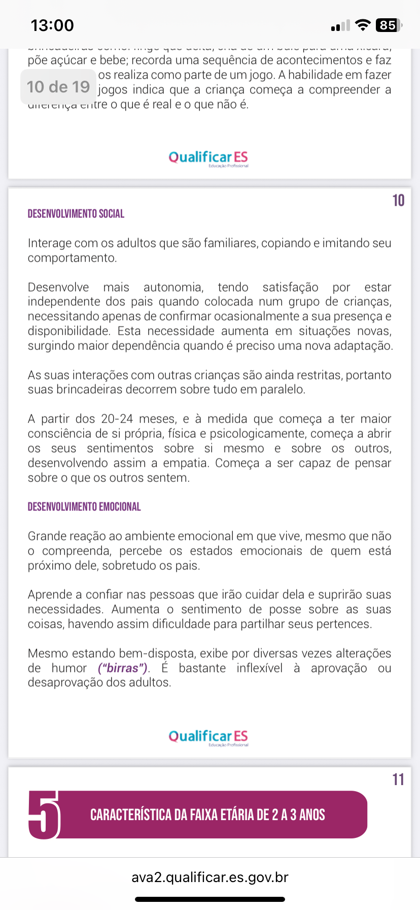 13:00 85 põe açúcar e bebe; recorda uma sequência de acontecimentos e faz realiza como parte de um jogo. A habilidade em fazer 10 de 19 jogos indica que a criança começa a compreender a entre que é real e que não é. Qualificar ES 10 DESENVOLVIMENTO SOCIAL Interage com adultos que são familiares, copiando e imitando seu comportamento. Desenvolve mais autonomia, tendo satisfação por estar independente dos pais quando colocada num grupo de crianças, necessitando apenas de confirmar ocasionalmente a sua presença e disponibilidade. Esta necessidade aumenta em situações novas, surgindo maior dependência quando é preciso uma nova adaptação. As suas interações com outras crianças são ainda restritas, portanto suas brincadeiras decorrem sobre tudo em paralelo. A partir dos 20-24 meses, e à medida que começa a ter maior consciência de si própria, física e psicologicamente, começa a abrir seus sentimentos sobre si mesmo e sobre os outros, desenvolvendo assim a empatia. Começa a ser capaz de pensar sobre que outros sentem. DESENVOLVIMENTO EMOCIONAL Grande reação ao ambiente emocional em que vive, mesmo que não compreenda, percebe estados emocionais de quem está próximo dele, sobretudo pais. Aprende a confiar nas pessoas que irão cuidar dela e suprirão suas necessidades. Aumenta sentimento de posse sobre as suas coisas, havendo assim dificuldade para partilhar seus pertences. Mesmo estando bem-disposta, exibe por diversas vezes alterações de humor ("birras"). É bastante inflexível à aprovação ou desaprovação dos adultos. Qualificar ES 11 5 CARACTERÍSTICA DA FAIXA ETÁRIA DE 2 A 3 ANOS ava2.qualificar.es.gov.br
