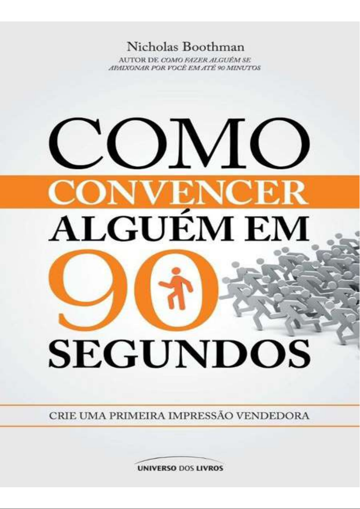 Nicholas Boothman AUTOR DE COMO FAZER ALGUÉM SE APAIXONAR POR VOCÊ EM ATÉ 90 MINUTOS COMO CONVENCER ALGUÉM EM SEGUNDOS CRIE UMA PRIMEIRA IMPRESSÃO VENDEDORA UNIVERSO DOS LIVROSDADOS DE COPYRIGHT Sobre a obra: A presente obra é disponibilizada pela equipe Le Livros e seus diversos parceiros, com o objetivo de oferecer conteúdo para uso parcial em pesquisas e estudos acadêmicos, bem como o simples teste da qualidade da obra, com o fim exclusivo de compra futura. É expressamente proibida e totalmente repudíavel a venda, aluguel, ou quaisquer uso comercial do presente conteúdo Sobre nós: O Le Livros e seus parceiros disponibilizam conteúdo de dominio publico e propriedade intelectual de forma totalmente gratuita, por acreditar que o conhecimento e a educação devem ser acessíveis e livres a toda e qualquer pessoa. Você pode encontrar mais obras em nosso site: LeLivros.link ou em qualquer um dos sites parceiros apresentados neste link. "Quando o mundo estiver unido na busca do conhecimento, e não mais lutando por dinheiro e poder, então nossa sociedade poderá enfim evoluir a um novo nível." Grupo Provisão estuda Mecânica Quântica Pnl participe você também compatilhar seu conhecimento. venha aprender me chame no : WHATZAPP :Nicholas Boothman Grupo Provisão estuda Mecânica Quântica , Pnl , participe você também , compatilhar seu conhecimento. venha apender me chame no : WHATZAPP : 65 9 9632 0674 copie link abaixo e acesse no grupo :COMO CONVENCER ALGUÉM EM 90 SEGUNDOS São Paulo 2012 UNIVERSO DOS LIVROSConvince them in 90 seconds or less First published in the United States by Workman Publishing Co., Inc. as CONVINCE THEM IN 90 SECONDS OR LESS: Make Instant Connections That Pay Off in Business and in Life Copyright © 2002, 2010 by Nicholas Boothman Published by arrangement with Workman Publishing Company, Inc., New York © 2012 by Universo dos Livros Todos os direitos reservados e protegidos pela Lei 9.610 de 19/02/1998. Nenhuma parte deste livro, sem autorização prévia por escrito da editora, poderá ser reproduzida ou transmitida sejam quais forem os meios empregados: eletrônicos, mecânicos, fotográficos, gravação ou quaisquer outros. Diretor editorial Luis Matos Assistentes editoriais Bóris Fatigati Raíça Augusto Raquel Nakasone Tradução Mayara Fortin e Renato D' Almeida Preparação Cátia de Almeida Revisão Ana Luiza Candido Arte Camila Kodaira Karine Barbosa Noele Vavalle Stephanie Lin Capa Zuleika Iamashita Dados Internacionais de Catalogação na Publicação (CIP)(Câmara Brasileira do Livro, SP, Brasil) B725c Boothman, Nicholas. Como convencer alguém em 90 segundos / Nicholas Boothman ; [tradução de Mayara Fortin e Renato D'Almeida ]. - São Paulo : Universo dos Livros, 2012. 264 Tradução de: Convince Them in 90 Seconds or Less: Make Instant Connections That Pay Off in Business and in Life ISBN 978-85-7930-319-7 1. Sucesso pessoal. 2. Relação interpessoal. 3. Autoajuda. I. Título. CDD 158.2 Universo dos Livros Editora Ltda. Rua do Bosque, 1589 - Bloco 2 Conj. 603/606 Barra Funda CEP 01136-001 São Paulo/SP Telefone/Fax: (11) 3392-3336 www.universodoslivros.com.br e-mail: editor@universodoslivros.com.br Siga-nos no Twitter: @univdoslivrosPara GracieAGRADECIMENTOS Eu quero agradecer a Francis Xavier Muldoon por plantar as sementes deste livro em minha cabeça e em meu coração, a Mike Freedman por regá-las com sua sabedoria, a Peter Workman por direcioná-las à luz e a Margot Herrera, minha editora na Workman, por cuidar delas até florescerem. Agradecimentos especiais a Derek Sweeney da Sweeney Agency Speaker Bureau por seu constante apoio, conselho, e amizade. Minha profunda gratidão a Brian Palmer, Don Jenkins, Susan Masters e à equipe da National Speakers Bureau nos EUA pela contínua torcida. Meus sinceros agradecimentos a Mary e Lester Stanford por me acolherem nessas terras há mais de três décadas e por me apontarem sempre as direções certas.INTRODUÇÃO: AQUELES 90 SEGUNDOS CRUCIAIS Este livro não é sobre uma nova teoria de negócios; ele é sobre como você pode se tornar mais bem-sucedido nos negócios e na vida, aprendendo a se conectar com seus clientes, colegas de trabalho, chefes, empregados e até com estranhos em noventa segundos ou menos. Os primeiros noventa segundos de qualquer encontro não são apenas um momento para causar uma boa impressão. Nos primeiros instantes de qualquer reunião, você se conecta com os instintos e a essência da pessoa, com suas respostas intrínsecas. Nos primeiros segundos, o nosso instinto de sobrevivência subconsciente reage e nossa mente e corpo decidem se fogem, combatem ou interagem; se essa pessoa representa oportunidade ou ameaça, se é amiga ou inimiga. Este livro ensina a você sobre os julgamentos instantâneos que são feitos nesses primeiros momentos, e como você pode usá-los a seu favor. Uma vez que transpôs esses obstáculos e a confiança é estabelecida, você pode começar a se conectar em um nível pessoal, ou (para ser mais preciso) em um nível de personalidade. Eu vou lhe mostrar como identificar exatamente com quem e com o que você está lidando, como deve conectar-se, e como motivar, influenciar e convencer alguém. Há uma ordem e um processo para conectar-se com os outros: primeiro você estabelece confiança com os instintos básicos, em seguida estabelece harmonia com a personalidade. O que resulta é um relacionamento, e todos os relacionamentos oferecem possibilidades infinitas. Como eu sei disso? Experiência. Agora estou anos-luz à frente de onde eu comecei e de onde esperava estar quando iniciei a jornada da vida. E eu devo muito do meu sucesso à habilidade de me conectar com as pessoas. Passei um quarto de século dando uma boa aparência aos outros. Fui fotógrafo internacional de moda e publicidade, e aquilo me ensinou muito sobre como fazer as pessoas parecerem atraentes. Não estou falando somente de fotografar modelos profissio