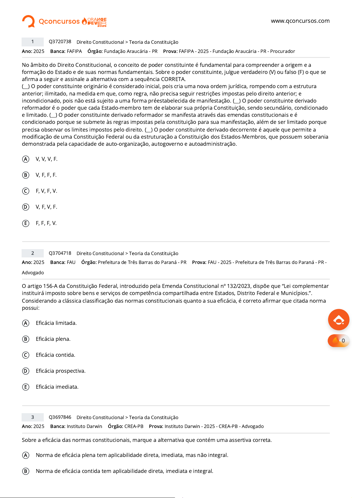 www.qconcursos.com Ano: 2025 Banca: FAFIPA Órgão: Fundação Araucária - PR No âmbito do Direito Constitucional, o conceito de poder constituinte é fundamental para compreender a origem e a formação do Estado e de suas normas fundamentais. Sobre o poder constituinte, julgue verdadeiro (V) ou falso (F) o que se afirma a seguir e assinale a alternativa com a sequência CORRETA. (__) O poder constituinte originário é considerado inicial, pois cria uma nova ordem jurídica, rompendo com a estrutura anterior; ilimitado, na medida em que, como regra, não precisa seguir restrições impostas pelo direito anterior; e incondicionado, pois não está sujeito a uma forma préestabelecida de manifestação. (__) O poder constituinte derivado reformador é o poder que cada Estado-membro tem de elaborar sua própria Constituição, sendo secundário, condicionado e limitado. (__) O poder constituinte derivado reformador se manifesta através das emendas constitucionais e é condicionado porque se submete às regras impostas pela constituição para sua manifestação, além de ser limitado porque precisa observar os limites impostos pelo direito. (__) O poder constituinte derivado decorrente é aquele que permite a modificação de uma Constituição Federal ou da estruturação a Constituição dos Estados-Membros, que possuem soberania demonstrada pela capacidade de auto-organização, autogoverno e autoadministração. A V, V, V, F. B V, F, F, F. C F, V, F, V. D V, F, V, F. E F, F, F, V. Ano: 2025 Banca: FAU Órgão: Prefeitura de Três Barras do Paraná - PR O artigo 156-A da Constituição Federal, introduzido pela Emenda Constitucional nº 132/2023, dispõe que “Lei complementar instituirá imposto sobre bens e serviços de competência compartilhada entre Estados, Distrito Federal e Municípios.”. Considerando a clássica classificação das normas constitucionais quanto a sua eficácia, é correto afirmar que citada norma possui: A Eficácia limitada. B Eficácia plena. C Eficácia contida. D Eficácia prospectiva. E Eficácia imediata. Ano: 2025 Banca: Instituto Darwin Órgão: CREA-PB Sobre a eficácia das normas constitucionais, marque a alternativa que contém uma assertiva correta. A Norma de eficácia plena tem aplicabilidade direta, imediata, mas não integral. B Norma de eficácia contida tem aplicabilidade direta, imediata e integral. 1 Q3720738 >Direito Constitucional Teoria da Constituição Prova: FAFIPA - 2025 - Fundação Araucária - PR - Procurador 2 Q3704718 >Direito Constitucional Teoria da Constituição Prova: FAU - 2025 - Prefeitura de Três Barras do Paraná - PR - Advogado 3 Q3697846 >Direito Constitucional Teoria da Constituição Prova: Instituto Darwin - 2025 - CREA-PB - Advogado 0 https://www.qconcursos.com/ https://www.qconcursos.com/questoes-de-concursos/bancas/fafipa https://www.qconcursos.com/questoes-de-concursos/institutos/fundacao-araucaria-pr https://www.qconcursos.com/questoes-de-concursos/bancas/fau https://www.qconcursos.com/questoes-de-concursos/institutos/prefeitura-de-tres-barras-do-parana-pr https://www.qconcursos.com/questoes-de-concursos/bancas/instituto-darwin https://www.qconcursos.com/questoes-de-concursos/institutos/crea-pb https://www.qconcursos.com/questoes-de-concursos/questoes/8486956c-c0 https://www.qconcursos.com/questoes-de-concursos/disciplinas/direito-direito-constitucional https://www.qconcursos.com/questoes-de-concursos/disciplinas/direito-direito-constitucional/teoria-da-constituicao https://www.qconcursos.com/questoes-de-concursos/provas/fafipa-2025-fundacao-araucaria-pr-procurador https://www.qconcursos.com/questoes-de-concursos/questoes/82cf76bb-b9 https://www.qconcursos.com/questoes-de-concursos/disciplinas/direito-direito-constitucional https://www.qconcursos.com/questoes-de-concursos/disciplinas/direito-direito-constitucional/teoria-da-constituicao https://www.qconcursos.com/questoes-de-concursos/provas/fau-2025-prefeitura-de-tres-barras-do-parana-pr-advogado https://www.qconcursos.com/questoes-de-concursos/provas/fau-2025-prefeitura-de-tres-barras-do-parana-pr-advogado https://www.qconcursos.com/questoes-de-concursos/questoes/4599700e-b5 https://www.qconcursos.com/questoes-de-concursos/disciplinas/direito-direito-constitucional https://www.qconcursos.com/questoes-de-concursos/disciplinas/direito-direito-constitucional/teoria-da-constituicao https://www.qconcursos.com/questoes-de-concursos/provas/instituto-darwin-2025-crea-pb-advogado C Norma de eficácia limitada tem aplicabilidade indireta, mediata, reduzida e se subdividem em normas de princípio programático e em normas de princípio institutivo. D Norma de eficácia limitada tem aplicabilidade indireta, imediata, reduzida e traçam apenas as diretrizes e os objetivos a serem perseguidos pelo Poder Público. E As normas constitucionais e as infraconstitucionais possuem a mesma eficácia e aplicabilidade imediata, sendo ambas autoexecutáveis, sem necessidade de regulamentação. Ano: 2025 Banca: Instituto Darwin Órgão: CREA-PB Acerca da classificação de Constituição quanto a sua estabilidade, assinale a alternativa correta. A É flexível a constituição quando algumas de suas normas podem ser modificadas por um processo legislativo mais dificultoso que o ordinário. B Rígida é a constituição cujas normas podem ser modificadas por procedimento específico, distinto pelo qual se modificam as demais leis. C É considerada super-rígida a constituição cujo texto normativo não pode nunca ser modificado. D Imutável é a constituição em que há um núcleo imodificável de cláusulas pétreas e outras normas alteráveis por um processo legislativo diferenciado. E A Constituição Federal de 1988 é flexível, pois suas normas podem ser alteradas pelo mesmo procedimentos das leis ordinária. Ano: 2025 Banca: MPE-GO Órgão: MPE-GO A respeito da estrutura de poderes estabelecida pela Constituição de 1824 e a posição do Imperador, pode-se afirmar: A
