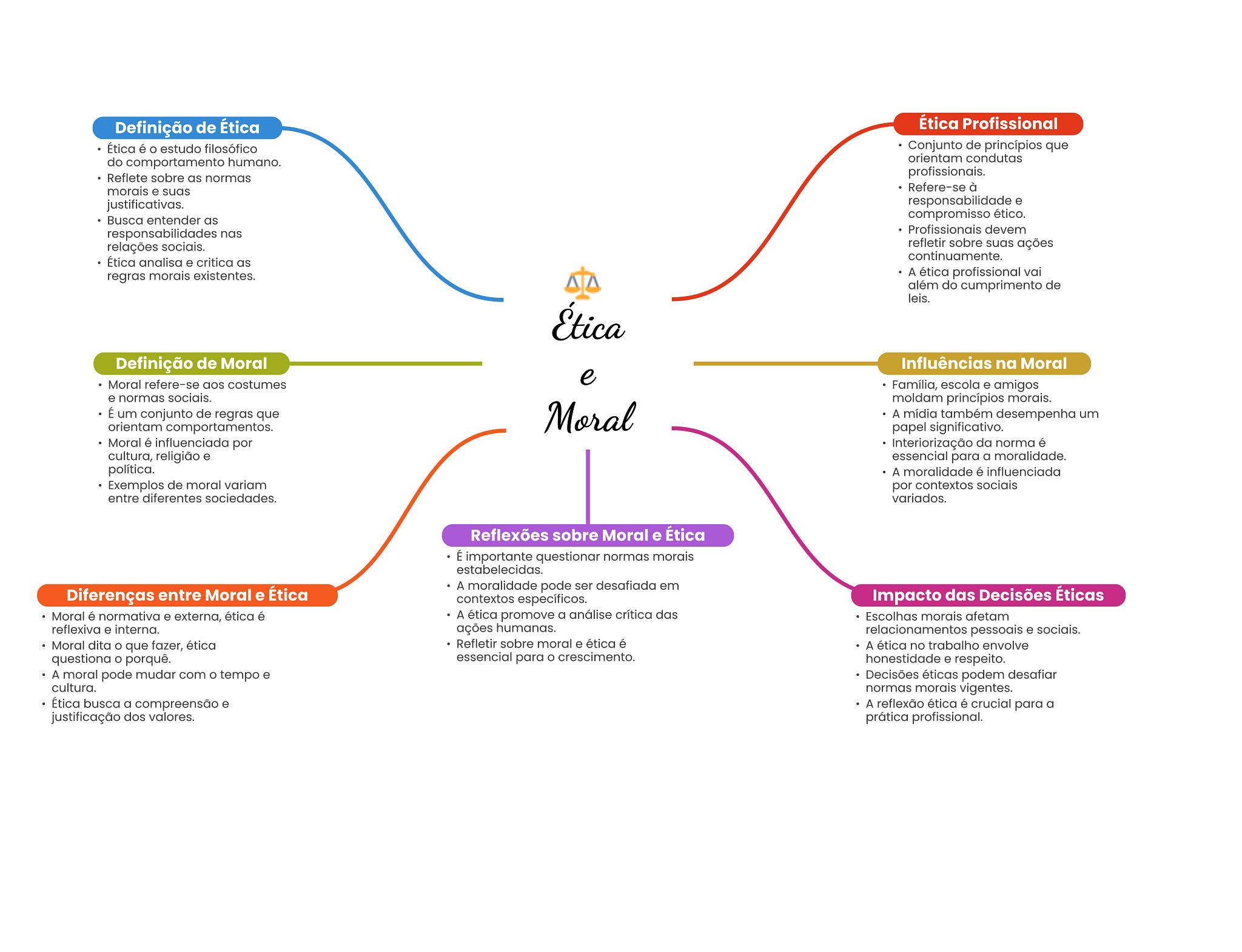 Definição de Ética Ética Profissional Ética é estudo filosófico Conjunto de princípios que do comportamento humano. orientam condutas Reflete sobre as normas profissionais. morais e suas Refere-se à justificativas. responsabilidade e Busca entender as compromisso ético. responsabilidades nas Profissionais devem relações sociais. refletir sobre suas ações Ética analisa e critica as continuamente. regras morais existentes. A ética profissional vai além do cumprimento de leis. Ética Definição de Moral Influências na Moral Moral refere-se aos costumes e Família, escola e amigos e normas sociais. moldam princípios morais. É um conjunto de regras que orientam comportamentos. Moral A mídia também desempenha um papel significativo. Moral é influenciada por Interiorização da norma é cultura, religião e essencial para a moralidade. política. A moralidade é influenciada Exemplos de moral variam por contextos sociais entre diferentes sociedades. variados. Reflexões sobre Moral e Ética É importante questionar normas morais estabelecidas. Diferenças entre Moral e Ética A moralidade pode ser desafiada em contextos específicos. Impacto das Decisões Éticas Moral é normativa e externa, ética é A ética promove a análise crítica das Escolhas morais afetam reflexiva e interna. ações humanas. relacionamentos pessoais e sociais. Moral dita que fazer, ética Refletir sobre moral e ética é A ética no trabalho envolve questiona porquê. essencial para crescimento. honestidade e respeito. A moral pode mudar com O tempo e Decisões éticas podem desafiar cultura. normas morais vigentes. Ética busca a compreensão e A reflexão ética é crucial para a justificação dos valores. prática profissional.