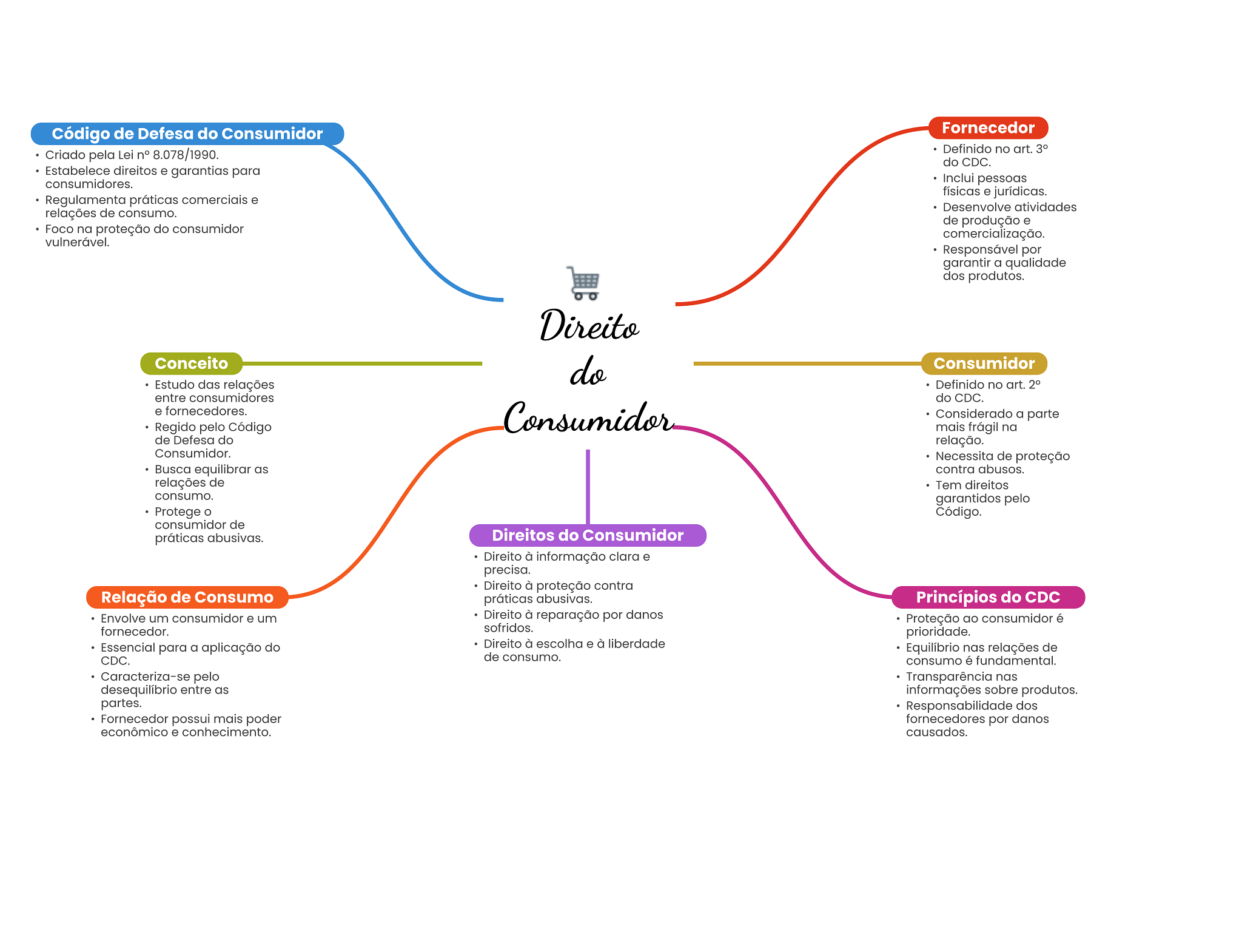 Código de Defesa do Consumidor Fornecedor Criado pela Lei n° 8.078/1990. Definido no art. 3° do CDC. Estabelece direitos e garantias para consumidores. Inclui pessoas físicas e jurídicas. Regulamenta práticas comerciais e Desenvolve atividades relações de consumo. de produção e Foco na proteção do consumidor comercialização. vulnerável. Responsável por garantir a qualidade dos produtos. Direito Conceito do Consumidor Estudo das relações Definido no art. 2° entre consumidores do CDC. e fornecedores. Consumidor Considerado a parte Regido pelo Código mais frágil na de Defesa do relação. Consumidor. Necessita de proteção Busca equilibrar as contra abusos. relações de Tem direitos consumo. garantidos pelo Protege Código. consumidor de práticas abusivas. Direitos do Consumidor Direito à informação clara e precisa. Direito à proteção contra Relação de Consumo práticas abusivas. Princípios do CDC Envolve um consumidor e um Direito à reparação por danos Proteção ao consumidor é fornecedor. sofridos. prioridade. Essencial para a aplicação do Direito à escolha e à liberdade Equilíbrio nas relações de CDC. de consumo. consumo é fundamental. Caracteriza-se pelo Transparência nas desequilibrio entre as informações sobre produtos. partes. Responsabilidade dos Fornecedor possui mais poder fornecedores por danos econômico e conhecimento. causados.