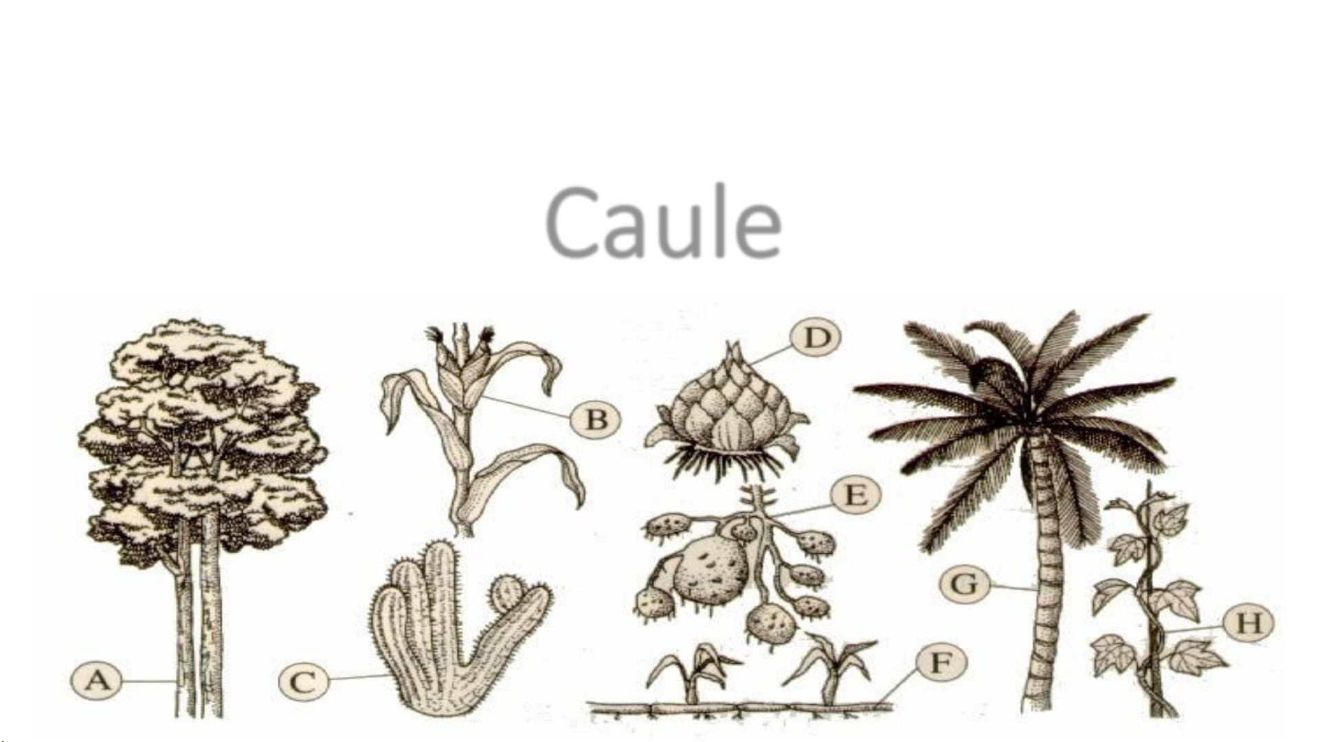 Caule Caule • Origem • Como o caule está estreitamente relacionado com as folhas, o termo “sistema caulinar” muitas vezes é empregado para designar o conjunto desses dois órgãos. • O caule e as folhas formam-se durante o desenvolvimento do embrião, onde são representados pela plúmula. A plúmula pode ser considerada como a primeira gema, consistindo do epicótilo, primórdios foliares (uma ou mais folhas rudimentares) e um meristema apical. • Na maioria das plantas os caules parecem ser a porção mais evidente e dominante do eixo. As plantas com bulbos e filicíneas são exceções. • Função Caule • Função • As duas principais funções associadas ao caule são condução e sustentação. As folhas, principais órgãos fotossintéticos da planta, são sustentadas pelos caules que as colocam em posições favoráveis para a captação da luz. As substâncias “fabricadas” nas folhas são transportadas através dos caules, via floema, aos locais de utilização (caules, raízes, primórdios foliares, flores, sementes e frutos). • Uma grande parte da substância alimentar é armazenada nas células parenquimáticas de raízes, sementes e fruto, mas os caules também constituem importantes órgãos de reserva. • Em alguns casos, o caule pode também funcionar como órgão fotossintético (ex: caules jovens ou em alguns vegetais que não possuem folhas típicas como os cactos). • Também podem ter a função de servir como fonte de propágulo no caso de reprodução assexuada de plantas. Caule • Constituição a) Nós: são as regiões caulinares geralmente dilatadas onde se inserem os órgãos apendiculares (folhas, estípulas, etc.). b) Entrenós: são as regiões caulinares situadas entre dois nós consecutivos. Muitas eudicotiledôneas não apresentam diferença entre nó e entrenó, especialmente em plantas adultas. Nas monocotiledôneas os nós são geralmente mais salientes que os entrenós. Caule c) Gemas: são rudimentos de ramos, geralmente formadas na axila de uma folha. Geralmente gemas terminais aparecem protegidas por estípulas (folhas modificadas para a proteção). • Gemas terminais: produzem ramos terminais, formação análoga ao caule. • Gemas foliares: produzem folhas quando se desenvolvem. • Gemas floríferas: produzem flores quando se desenvolvem. d) Folhas: são expansões laterais do caule sendo, portanto, consideradas estruturas caulinares. Caule • Quanto ao desenvolvimento • Herbáceos Plantas em geral de pequeno porte, cujo caule contém muito pouco tecido lenhoso. Podem ser anuais, bienais ou perenes, de acordo com a duração de seu ciclo vital. • Arbustivos Vegetais lenhosos, de porte não muito avantajado, ramificado desde a base e em conseqüência disso, desprovido quase totalmente de um tronco. Classificação do Caule • Arbóreos Vegetais lenhosos, de porte avantajado, provido de um tronco, que se ramifica na parte superior, formando uma copa. Classificação do Caule • Quanto ao habitat 1. Áereo 1.1. Eretos a) Troncos Caules robustos, resistentes, lenhosos, com desenvolvimento maior na base e com ramificações no ápice. Ex.: flamboyant, ipê, sibipiruna, etc. b) Estipes Caules que se caracterizam por serem resistentes, cilíndricos e sem ramificações laterais (exceto inflorescências), apresentando um tufo de folhas no ápice. Ex. palmeiras. Classificação do Caule A B c) Hastes Caules de pequeno diâmetro e cor verde, onde os nós são evidenciados pela presença de folhas. Ex. arroz. d) Colmos Caules com nítida divisão entre nós e entrenós. O colmo pode ser cheio ou fistuloso (oco), onde quase toda a medula do entrenó desaparece. Ex. milho, bambu, cana-de-açúcar. Obs.: em algumas espécies, como por exemplo Musa spp. (bananeira), os restos das bainhas foliares, densamente superpostas, constituem-se em um falso caule aéreo, denominado pseudocaule. Classificação do Caule C D Classificação do Caule • Quanto ao habitat 1. Áereo 1.2. Rastejantes a)Estoloníferos Emitem raízes adventícias e ramos a partir dos nós consecutivos ou intercalados. De cada nó pode surgir uma nova planta. Ex. Morango. Classificação do Caule b) Sarmentosos Caules rastejantes, geralmente com apenas um ponto de fixação ao solo. Ex.: abobrinha. Classificação do Caule • Quanto ao habitat 1. Áereo 1.3. Trepador Sobe através de um suporte por meio de elementos de fixação, como raízes grampiformes (Ex.: hera (Hedera sp.)), gavinhas (Ex.: chuchu (Sechium edule)), espinhos (Ex.: primavera (Bougainvillea sp.)), etc. O caule aéreo pode, ainda, enroscar-se num suporte sem a ajuda de elementos de fixação, sendo denominado volúvel. Ele se enrola ao tocar no suporte, podendo fazê-lo para a direita ou esquerda. Ex.: madressilva. Classificação do Caule • Quanto ao habitat 2. Subterrâneos a) Rizoma Crescem horizontalmente, próximos à superfície do solo. Geralmente armazenam substâncias nutritivas. Apresentam todas as características de um sistema caulinar comum. Ex.: gengibre (rizoma suculento). b) Tubérculo Caules subterrâneos que podem ser formados de porções terminais de um sistema caulinar. Possui nós e entrenós de formato freqüentemente ovóide com gemas. Ex: batata-inglesa (Solanum tuberosum). Classificação do Caule A B c) Bulbo É considerado um sistema caulinar modificado e não somente um caule modificado. No bulbo há apenas uma pequena porção de tecido caulinar, o prato, que é constituído de um disco achatado onde estão presos os catáfilos ou túnicas (folhas cheias de reserva nutritiva). Ex: cebola, alho. d)Xilopódio Caule subterrâneo duro e muitas vezes lignificado que ocorre em muitas espécies do cerrado brasileiro. Classificação do Caule C C • Quanto ao habitat 3. Aquáticos Seguem a mesma classificação dos caules terrestres, independente de serem caules enterrados em substratos ou flutuantes. Classificação do Caule • Caules modificados e/ou modificaç