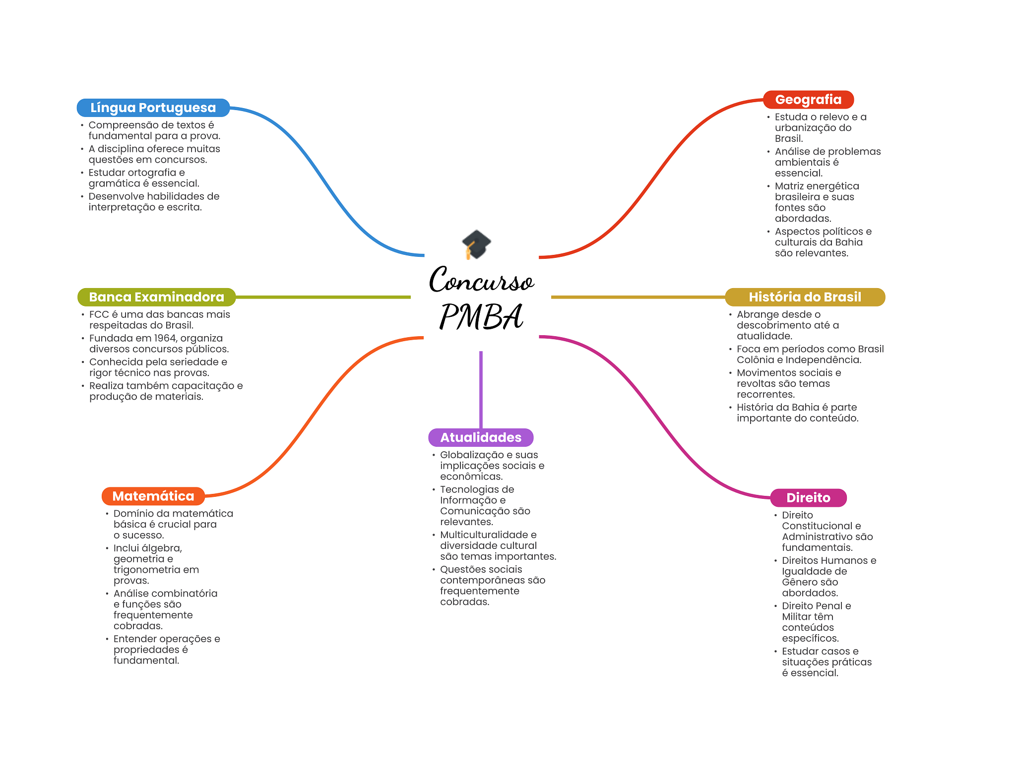 Geografia Língua Portuguesa Estuda o relevo e a Compreensão de textos é urbanização do fundamental para a prova. Brasil. A disciplina oferece muitas Análise de problemas questões em concursos. ambientais é Estudar ortografia e essencial. gramática é essencial. Matriz energética Desenvolve habilidades de brasileira e suas interpretação e escrita. fontes são abordadas. Aspectos políticos e culturais da Bahia são relevantes. Concurso Banca Examinadora História do Brasil FCC é uma das bancas mais respeitadas do Brasil. PMBA Abrange desde descobrimento até a Fundada em 1964, organiza atualidade. diversos concursos públicos. Foca em períodos como Brasil Conhecida pela seriedade e Colônia e Independência. rigor técnico nas provas. Movimentos sociais e Realiza também capacitação e revoltas são temas produção de materiais. recorrentes. História da Bahia é parte importante do conteúdo. Atualidades Globalização e suas implicações sociais e econômicas. Matemática Tecnologias de Informação e Direito Domínio da matemática Comunicação são Direito básica é crucial para relevantes. Constitucional e sucesso. Multiculturalidade e Administrativo são Inclui álgebra, diversidade cultural fundamentais. geometria e são temas importantes. Direitos Humanos e trigonometria em Questões sociais Igualdade de provas. são Gênero são Análise combinatória frequentemente abordados. e funções são cobradas. Direito Penal e frequentemente Militar têm cobradas. conteúdos Entender operações e específicos. propriedades é Estudar casos e fundamental. situações práticas é essencial.