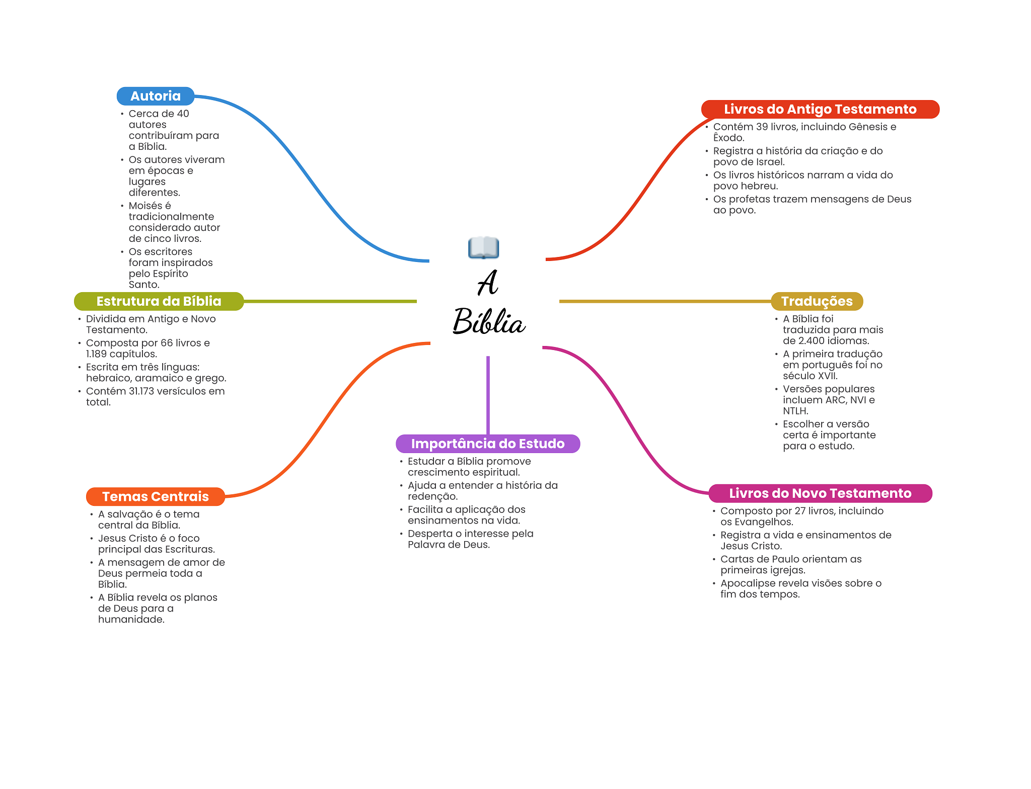 Autoria Cerca de 40 Livros do Antigo Testamento autores Contém 39 livros, incluindo Gênesis e contribuíram para Êxodo. a Bíblia. Registra a história da criação e do Os autores viveram povo de Israel. em épocas e Os livros históricos narram a vida do lugares diferentes. povo hebreu. Os profetas trazem mensagens de Deus Moisés é tradicionalmente ao povo. considerado autor de cinco livros. Os escritores foram inspirados pelo Espírito Santo. A Estrutura da Bíblia Traduções Dividida em Antigo e Novo Bíblia A Bíblia foi Testamento. traduzida para mais Composta por 66 livros e de 2.400 idiomas. 1.189 capítulos. A primeira tradução Escrita em três línguas: em português foi no hebraico, aramaico e grego. século XVII. Contém 31.173 versículos em Versões populares total. incluem ARC, NVI e NTLH. Escolher a versão certa é importante Importância do Estudo para estudo. Estudar a Bíblia promove crescimento espiritual. Ajuda a entender a história da Temas Centrais redenção. Livros do Novo Testamento A salvação é tema Facilita a aplicação dos Composto por 27 livros, incluindo central da Bíblia. ensinamentos na vida. Evangelhos. Jesus Cristo é foco Desperta interesse pela Registra a vida e ensinamentos de Palavra de Deus. principal das Escrituras. Jesus Cristo. A mensagem de amor de Cartas de Paulo orientam as Deus permeia toda a primeiras igrejas. Bíblia. Apocalipse revela visões sobre A Bíblia revela planos fim dos tempos. de Deus para a humanidade.