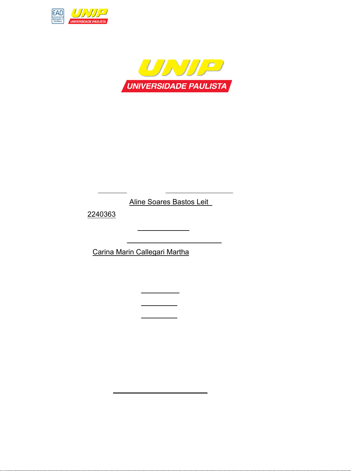 Universidade Paulista – Nutrição Relatório de aulas práticas Curso: Nutricão Disciplina:Avaliação Nutricional Nome do aluno: Aline Soares Bastos Leite RA: 2240363 Polo de matricula: Polo Jacarei-SP Polo da prática: Dutra São José dos Campos Prof.ª Carina Marin Callegari Martha Data das aulas práticas (Relacione todas as datas em que compareceu): 23 /02/2024 02/03/2024 27/04/2024 Jacaréi, 03 de Maio de 2024 allin Lápis allin Lápis allin Lápis allin Lápis allin Lápis allin Lápis allin Lápis INTRODUÇÃO A gravidez é um momento que deixa a mulher em um estado de vulnerabilidade nutricional devido ao seu aumento significativo de algumas necessidades nutricionais. Junto com as mudanças orgânicas, existem necessidades nutricionais que podem ter consequências. Funcional, metabólico, físico, emocional, comportamental e dietético. Essas alterações são projetadas para observar a gravidez, o parto e a lactação (Silva, Mura, 2014). A condição alimentar da gestante deve ser levada em consideração para descrever as condições nutricionais da mulher e, indiretamente, desenvolvimento do feto em conjunto com o pré-natal .As primeiras semanas de uma gravidez completa, que geralmente dura cerca de 40 semanas. O início de pequenas mudanças fisiológicas que ocorrem entre a concepção e a 13ª semana de ganhar mais peso. A 14ª a 26ª semana do segundo trimestre traz mais mudanças corporais. Aparentemente, o crescimento mais rápido é observado na 27ª semana após o terceiro trimestre. O ganho de peso materno está correlacionado com o feto (Brasil, 2016). Objetivo: Realizar os cálculos e classificar o estado nutricional de gestantes. Exercícios: Realize a avaliação nutricional das gestantes (1 a 5) realizando os seguintes passos e preencha na tabela de respostas. a. Calcule o IMC pré-gestacional e classifique pela tabela. b. Verifique o peso esperado para o final da gestação (mínimo e máximo). Instituto de Ciências da Saúde Disciplina: Avaliação Nutricional Título da Aula: Antropometria de Gestantes ROTEIRO 1 c. Calcule o ganho de peso real de acordo com a semana gestacional. d. Classifique o EN pela idade gestacional utilizando o gráfico de Atalah. Projeção de ganho de peso de acordo com o estado nutricional pré- gestacional Estado Nutricional Antes da Gestação IMC pré-gestacional (kg/m2) Ganho de peso total (kg)* Ganho de peso por semana no 2º e 3º trimestre (kg) Baixo Pesopassos e preencha na tabela de respostas: a. Calcule o IMC da criança. b. Coloque os dados nos gráficos de acordo com a idade (Até 5 anos = 4 gráficos [P/I, P/E, IMC/I e E/I ]; 5 a 10 anos = 3 gráficos [P/I, IMC/I e E/I ]). c. Classifique o percentil e escore z encontrados nos gráficos utilizando a tabela. 1. Menina, 2 anos e 9 meses, peso 12,2 kg e estatura 92 cm. 2. Menino, 22 meses, peso 14,8 kg e estatura 88 cm. Instituto de Ciências da Saúde Disciplina: Avaliação Nutricional Título da Aula: Antropometria de Crianças ROTEIRO 2 3. Menina, 14 meses, peso 13,6 kg e estatura 95,5 cm. 4. Menina, 8 anos e 2 meses, peso 23,1 kg e altura 1,30 m. 5. Menino, 9 anos e 4 meses, peso 43,2 kg e altura 1,44 m. 6. Menino 7 anos e 8 meses, peso 25,2 kg e altura 1,40 cm RESPOSTAS – Crianças: Crianças IMC (kg/m²) Gráfico P/I (percentil, escore z e classificações) Gráfico P/E (percentil, escore z e classificaçõe s) Gráfico IMC/I (percentil, escore z e classificações) Gráfico E/I (percentil, escore z e classificações) Conclusão do estado nutricional 1 14,41kg/m² P15 – 50 Escore-z 2 Adequado P15 Escore-z - 1 Risco de sobrepeso P15 – 50 Escore-z -1– 0 Risco de sobrepeso P15 - P50 Escore-z -2 e 0 Estatura Adequada Percentil e escore-z em adequação 2 19,12kg/m² P85 – 97 Escore-z 0 – 2 Obesidade P97 Escore-z 3 – 2 Sobrepeso P>97 Escore-z -3 – 2 Sobrepeso P>97 Escore-z -2 – 0 Estatura Adequada Apresentou obesidade e sobrepeso, precisa ajustar a alimentação 3 14,91kg/m² P97 Escore-z 2 Peso elevado P15 – 50 Escore-z 1 Adequado P15 Escore-z -1 Sobrepeso P97 Escore-z +2 Estatura Adequada Risco de sorepeso necessita de atenção quanto a alimentação 4 13,66kg/m² P15 – P50 Escore-z 0 – 1 Adequado P3 – P15 Escore-z - 2 – -1 Eutrofia P97 Escore-z 2 – 3 Estatura adequada Percentil e escore-z em adequação 5 20,83kg/m² P>97 Escore-z 2 – 3 Peso elevado Não se aplica P97 Escore-z -2 – -1 Sobrepeso P97 Escore-z 2 Estatura adequada Risco de sorepeso precisa ajustar a alimentação 6 12,85kg/m² P50 – P85 Escore-z 0 – 1 Adequado Ppara adultos (Anexo). Instituto de Ciências da Saúde Disciplina: Avaliação Nutricional Título da Aula: Antropometria de Adultos ROTEIRO 4 Aferir as medidas antropométricas do colega e preencher o quadro abaixo: Nome do avaliado: Aline Soares Bastos Leite Idade: 36 anos Gênero: Feminino Data da avaliação: 27 / 04 / 2024 Peso e altura: Altura (m): 1.63m Envergadura (cm): 173cm Altura do joelho (cm): 51,5cm Peso atual (kg): 85,3kg Peso habitual (kg): 72kg Peso desejado (kg): 70 Circunferências (cm): Braço: 40,5cm Pulso: 18cm Cintura: 91,5cm Abdominal: 98cm Quadril: 115cm Pescoço: 40cm Panturrilha: 38,5cm Coxa proximal: 72cm Coxa medial: 63cm Dobras cutâneas (mm): Bíceps: 22mm Tríceps:27mm Subescapular: 29mm Suprailíaca: 32mm Abdominal: 27mm Coxa: 40mm Axilar média: 23mm Peitoral: 11mm Panturrilha: 33mm IMC (kg/m²): 32,12kg/m² Classificação IMC: Obesidade 1 Compleição: 9,0 grande Peso ideal (kg): 56,8kg % adequação de peso: 150,10% Classificação %: Obesidade CMB (cm): 32,02 cm % adequação CMB: 144,6% AMBc (cm):59,83cm AGB (cm): 47,08cm Classificação Circ. Abdom.:≥80 cm Risco elevado de complicações metabólicas associadas à obesidade RCQ: 0,79 – moderado % gordura corporal (4 dobras=bíceps, tríceps, subescapular e suprailíaca): 110mm Classificação do percentual de GC: ≥ 39 obesidade mórbida Cálculo densidade corporal (Jackson, Pollock e Ward, 1980 = 7 dobras): 