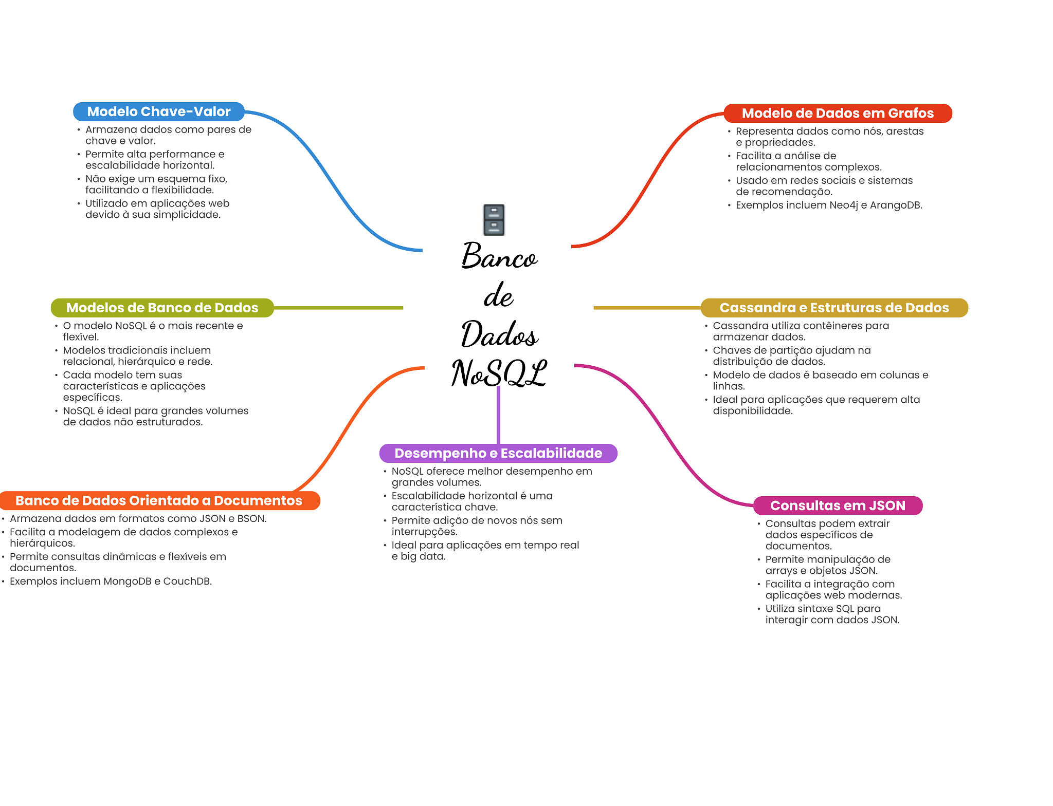 Modelo Chave-Valor Modelo de Dados em Grafos Armazena dados como pares de Representa dados como nós, arestas chave e valor. e propriedades. Permite alta performance e Facilita a análise de escalabilidade horizontal. relacionamentos complexos. Não exige um esquema fixo, Usado em redes sociais e sistemas facilitando a flexibilidade. de recomendação. Utilizado em aplicações web Exemplos incluem Neo4j e ArangoDB. devido à sua simplicidade. Banco de Modelos de Banco de Dados Cassandra e Estruturas de Dados modelo é O mais recente e Dados Cassandra utiliza contêineres para flexível. armazenar dados. Modelos tradicionais incluem Chaves de partição ajudam na relacional, hierárquico e rede. NoSQL distribuição de dados. Cada modelo tem suas Modelo de dados é baseado em colunas e características e aplicações linhas. específicas. Ideal para aplicações que requerem alta é ideal para grandes volumes disponibilidade. de dados não estruturados. Desempenho e Escalabilidade oferece melhor desempenho em grandes volumes. Banco de Dados Orientado a Documentos Escalabilidade horizontal é uma característica chave. Consultas em JSON Armazena dados em formatos como JSON e BSON. Permite adição de novos nós sem Consultas podem extrair Facilita a modelagem de dados complexos e interrupções. dados específicos de hierárquicos. Ideal para aplicações em tempo real documentos. Permite consultas dinâmicas e flexíveis em e big data. Permite manipulação de documentos. arrays e objetos JSON. Exemplos incluem MongoDB e CouchDB. Facilita a integração com aplicações web modernas. Utiliza sintaxe SQL para interagir com dados JSON.