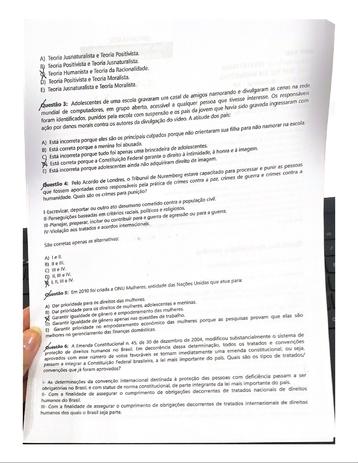 A) Teoria Jusnaturalista e Teoria Positivista. B) Teoria Positivista e Teoria Jusnaturalista. Teoria Humanista e Teoria da Racionalidade. D) Teoria Positivista e Teoria Moralista. E) Teoria Jusnaturalista e Teoria Moralista. Questão 3: Adolescentes de uma escola gravaram um casal de amigos namorando e divulgaram as cenas responsáveis na rede mundial de computadores, em grupo aberto, acessível a qualquer pessoa que tivesse interesse. Os com foram identificados, punidos pela escola com suspensão e os pais da jovem que havia sido gravada ingressaram ação por danos morais contra os autores da divulgação do vídeo. A atitude dos pais: A) Está incorreta porque eles são os principais culpados porque não orientaram sua filha para não namorar na escola. B) Está correta porque a menina foi abusada. C) Está incorreta porque tudo foi apenas uma brincadeira de adolescentes. Está correta porque a Constituição Federal garante o direito à intimidade, à honra e à imagem. E) Está incorreta porque adolescentes ainda não adquiriram direito de imagem. Questão 4: Pelo Acordo de Londres, o Tribunal de Nuremberg estava capacitado para processar e punir crimes as contra pessoas a que fossem apontadas como responsáveis pela prática de crimes contra a paz, crimes de guerra e humanidade. Quais são os crimes para punição? I-Escravizar, deportar ou outro ato desumano cometido contra a população civil. baseadas em critérios raciais, políticos e religiosos. III-Planejar, preparar, incitar ou contribuir para a guerra de agressão ou para a guerra. IV-Violação aos tratados e acordos internacionais. São corretas apenas as alternativas: A) e II. B) II e III. C) III e IV. D) II, III e IV. I, II, III e IV. Questão 5: Em 2010 foi criada a ONU Mulheres, entidade das Nações Unidas que atua para: A) Dar prioridade para os direitos das mulheres. B) Dar prioridade para os direitos de mulheres, adolescentes e meninas. Garantir igualdade de gênero e empoderamento das mulheres. D) Garantir igualdade de gênero apenas nas questões de trabalho. E) Garantir prioridade no empoderamento econômico das mulheres porque as pesquisas provam que elas são melhores no gerenciamento das finanças domésticas. Questão 6: A Emenda Constitucional n. 45, de 30 de dezembro de 2004, modificou substancialmente o sistema de proteção de direitos humanos no Brasil. Em decorrência dessa determinação, todos os tratados e convenções aprovados com esse número de votos favoráveis se tornam imediatamente uma emenda constitucional, ou seja, passam a integrar a Constituição Federal brasileira, a lei mais importante do país. Quais são os tipos de tratados/ convenções que já foram aprovados? 1- As determinações da convenção internacional destinada à proteção das pessoas com deficiência passam a ser II- obrigatórias no Brasil, e com status de norma constitucional, de parte integrante da lei mais importante do humanos Com a do finalidade Brasil. de assegurar o cumprimento de obrigações decorrentes de tratados nacionais de direitos humanos III- Com a dos finalidade quais de Brasil assegurar seja parte. cumprimento de obrigações decorrentes de tratados internacionais de direitosSão corretas apenas as alternativas: A) B) le II. C) le III. D) e III. I, e III. Questão 7: Estado brasileiro tem o dever de prover a saúde de todos por meio de políticas econômicas e sociais. Mas o dever do Estado não exclui o dever: A) Da prefeitura e da escola. B) Dos hospitais e do município. Das famílias, das empresas e da sociedade. D) Da sociedade e do município. E) Dos Conselhos Municipais de Saúde. Questão 8: Uma pessoa com deficiência foi contratada por uma empresa para trabalhar como operadora de atendimento telefônico. Após 6 meses de trabalho ficou sabendo que estava recebendo um salário menor que seus demais colegas, mesmo aqueles que haviam sido contratados na mesma época e que executavam o mesmo trabalho. Questionou seu superior e foi informada de que isso era normal porque ele era pessoa com deficiência física e, por isso, a empresa poderia pagar um salário menor. A posição da empresa está: A) Correta, porque a empregabilidade de pessoas com deficiência não é uma prática usual. B) Correta, porque a empresa é obrigada a cumprir cotas e não pode ter ônus em razão disso. Incorreta, porque a lei garante que todos os operadores de atendimento telefônico recebam o mesmo salário. Incorreta, porque a Constituição Federal veda expressamente a discriminação no tocante ao salário de pessoas com deficiência. E) Correta, porque a Constituição Federal garante liberdade empresarial e cada um pode administrar sua empresa como achar melhor. Questão 9: Em um determinado país o governo havia positivado em lei o direito de acesso a linhas de crédito para moradia não Alguns anos depois, o mesmo governo resolveu extinguir essas linhas de crédito sob alegação de crédito que existiam mais recursos para isso. Os cidadãos se organizaram para exigir o retorno do direito às linhas de humanos para que moradia é a: popular, sob alegação de que havia sido ferida uma característica essencial dos direitos A) B) Vedação de retrocesso. Complementaridade. E) a: Questão 10: Na Organização das Nações Unidas, o órgão que cuide da educação, ciência e cultura é A) OMS. Unesco. C) OEA. D) FMI. E) Otan. elIMPORTANTE Data limite para aplicação desta prova: 07/06/2025 UNIP EAD Código da Prova: 125314735866 1-A 6-C Curso: SUP TEC EM MARKETING 7-C Série: 3 Tipo: Bimestral 3-D 8-D I Questões objetivas valendo 10 pontos 4-E 9-B Gerada em: 03/06/2025 às 15h11 5-c Instruções para a realização da prova: 1. Leia as questões com atenção. 2. Confira seu nome e RA e verifique se o caderno de questão e folha de respostas correspondem à sua disciplina. 3. Faça as marcações primeiro no caderno de questões e depois repasse para a folha de respostas. 4. Serão consideradas somente as m