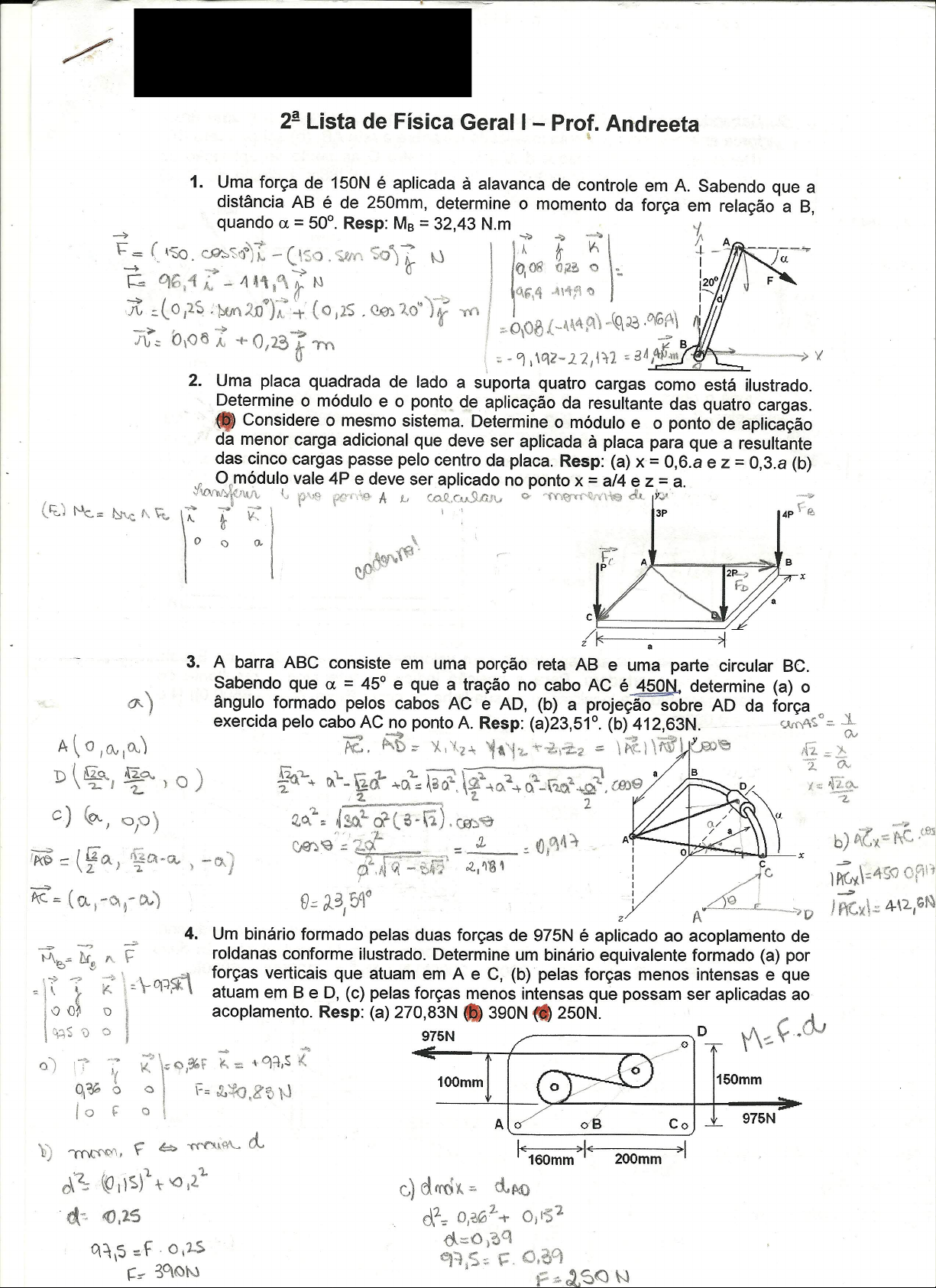 Lista de Física Geral I - Prof. Andreeta 1. Uma força de 150N é aplicada à alavanca de controle em A. Sabendo que a distância AB é de 250mm, determine o momento da força em relação a B, quando α = 50°. Resp: 32,43 N.m A N 0,08 0,23 F 96,4 11490 m B 2. Uma placa quadrada de lado a suporta quatro cargas como está ilustrado. Determine o módulo e o ponto de aplicação da resultante das quatro cargas. (b) Considere o mesmo sistema. Determine o módulo e o ponto de aplicação da menor carga adicional que deve ser aplicada à placa para que a resultante das cinco cargas passe pelo centro da placa. Resp: (a) X = 0,6.a e = 0,3.a (b) módulo vale 4P e deve ser aplicado no ponto X = A calcular de 3P 4P A B P 2P FD 3. A barra ABC consiste em uma porção reta AB e uma parte circular BC. Sabendo que α = 45° e que a tração no cabo AC é 450N, determine (a) a) ângulo formado pelos cabos AC e AD, (b) a projeção sobre AD da força exercida pelo cabo AC no ponto A. Resp: (a)23,51°. (b) 412,63N. a AD = = 2 2 B D 2 2 = b) 2,181 cc F A 4. Um binário formado pelas duas forças de 975N é aplicado ao acoplamento de F roldanas conforme ilustrado. Determine um binário equivalente formado (a) por forças verticais que atuam em A e C, (b) pelas forças menos intensas e que K atuam em e D, (c) pelas forças menos intensas que possam ser aplicadas ao 0 acoplamento. Resp: (a) 270,83N 390N 250N. 975N D M=F.d a) 0,36F 100mm 150mm 0,36 0 10 F A Co 975N b) F d0 120 a) 5. Sabendo que α = 60°, substitua a força e o binário ilustrados por uma única força aplicada em um ponto localizado (a) sobre a reta AB, (b) sobre a reta CD. (Determine em cada caso a distância do centro ao ponto de aplicação da força) Resp: F = 960 + (a) 0,0288m à direita de (b) 0,05m abaixo de O. 480 831,40 960N 120N C A o b) 100mm 120N 480 831,4 0 D a) 6. Duas forças paralelas P e Q estão aplicadas às extremidades de uma viga AB, de comprimento L. Determine a distância X de A à linha de ação da resultante. 0,2 Verifique a fórmula obtida considerando L = 0,20m e (a) P = 50N para baixo, Q = 150N para baixo, (b) P = 50N para baixo, Q = 150N para cima. Resp: (a) X = 0,15m (b) X 0,30m. a P R Q x 0,2 150 100 MA B L 100 7. Quatro fardos são transportados com velocidade constante de A até B pela correia transportadora. Para a posição indicada, determine a resultante do carregamento e a localização de sua linha de ação. Resp: R = N e 06 X 0,003m. 1200N.m 2000 1,20m 1.20m 1,50m 1250 2500N 750 0 Fx 2500 FB 6500 FA 1250N 750N 2250 2000N 2500 x=26m 1,80m 16950 8. Duas forças estão aplicadas a um poste vertical, como está indicado. Determine as componentes da força e momento em equivalentes às duas forças. Resp: R = (- 1000i 9000j 2000k) N e = 12000i 6000k. 7kN 3m A 5kN 3m 3m D R= 2m o 4m FBD= 0 0 3-6-2 0 -4-309. Um bloco de peso P é suportado pelo guincho ilustrado. Determine módulo necessário para a força V (a) em termos de P, r, e Θ (b) se P = 500N, r = 75mm, = 375mm e Resp: (a)V = r.P/ (b) V = 200N. Mp b) V= = 200N N 3,75.0,5 l V=Pr B V P 10. Na ilustração abaixo determine as reações em A e quando o ângulo for 60° e Determine o valor de para que a reação em seja mínima. Nessas condições quais os valores das reações em A e B? 400N - 250 mm 250 mm 300 mm A