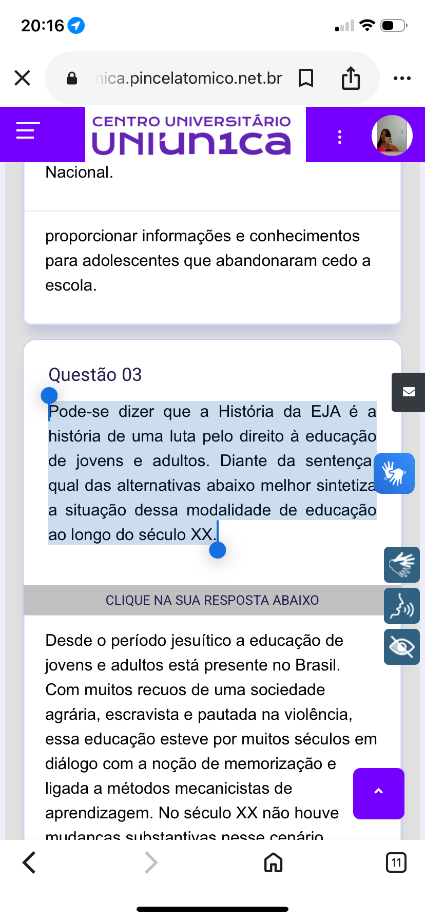 20:16 X nica.pincelatomico.net.br CENTRO UNIVERSITÁRIO ... Nacional. proporcionar informações e conhecimentos para adolescentes que abandonaram cedo a escola. Questão 03 Pode-se dizer que a História da EJA é a história de uma luta pelo direito à educação de jovens e adultos. Diante da sentença qual das alternativas abaixo melhor sintetiza a situação dessa modalidade de educação ao longo do século CLIQUE NA SUA RESPOSTA ABAIXO Desde o período jesuítico a educação de jovens e adultos está presente no Brasil. Com muitos recuos de uma sociedade agrária, escravista e pautada na violência, essa educação esteve por muitos séculos em diálogo com a noção de memorização e ligada a métodos mecanicistas de aprendizagem. No século XX não houve mudancas substantivas nesse cenário 11