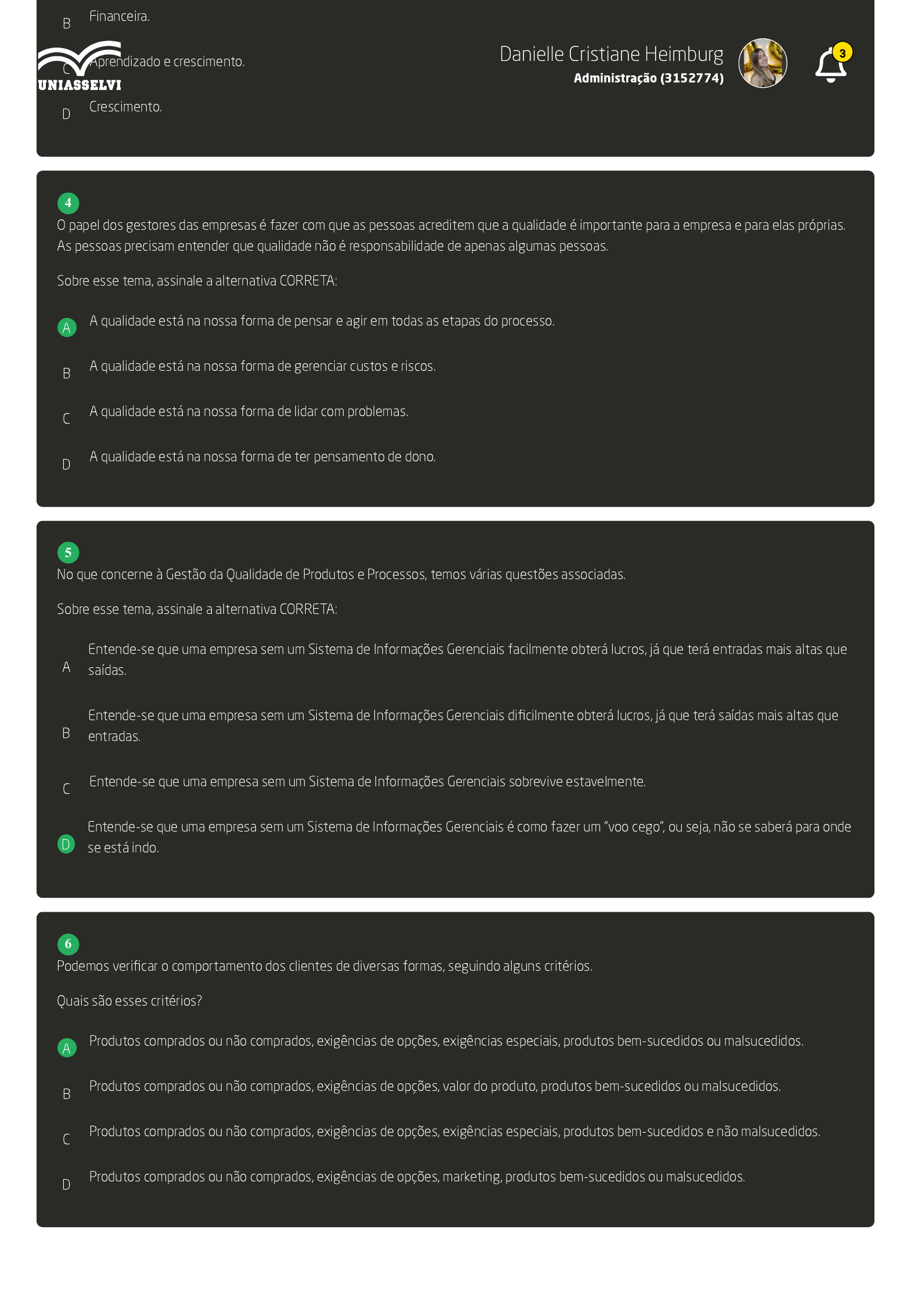 Financeira. B Danielle Cristiane Heimburg 3 Aprendizado e crescimento. UNIASSELVI Administração (3152774) Crescimento. D 4 0 papel dos gestores das empresas é fazer com que as pessoas acreditem que a qualidade é importante para a empresa e para elas próprias. As pessoas precisam entender que qualidade não é responsabilidade de apenas algumas pessoas. Sobre esse tema, assinale a alternativa CORRETA: A A qualidade está na nossa forma de pensar e agir em todas as etapas do processo. B A qualidade está na nossa forma de gerenciar custos e riscos. A qualidade está na nossa forma de lidar com problemas. D A qualidade está na nossa forma de ter pensamento de dono. 5 No que concerne à Gestão da Qualidade de Produtos e Processos, temos várias questões associadas. Sobre esse tema, assinale a alternativa CORRETA: Entende-se que uma empresa sem um Sistema de Informações Gerenciais facilmente obterá lucros, já que terá entradas mais altas que A saídas. Entende-se que uma empresa sem um Sistema de Informações Gerenciais dificilmente obterá lucros, já que terá saídas mais altas que B entradas. Entende-se que uma empresa sem um Sistema de Informações Gerenciais sobrevive estavelmente. Entende-se que uma empresa sem um Sistema de Informações Gerenciais é como fazer um "voo cego", ou seja, não se saberá para onde D se está indo. 6 Podemos verificar 0 comportamento dos clientes de diversas formas, seguindo alguns critérios. Quais são esses critérios? A Produtos comprados ou não comprados, exigências de opções, exigências especiais, produtos bem-sucedidos ou malsucedidos. B Produtos comprados ou não comprados, exigências de opções, valor do produto, produtos bem-sucedidos ou malsucedidos. Produtos comprados ou não comprados, exigências de opções, exigências especiais, produtos bem-sucedidos e não malsucedidos. D Produtos comprados ou não comprados, exigências de opções, marketing, produtos bem-sucedidos ou malsucedidos.