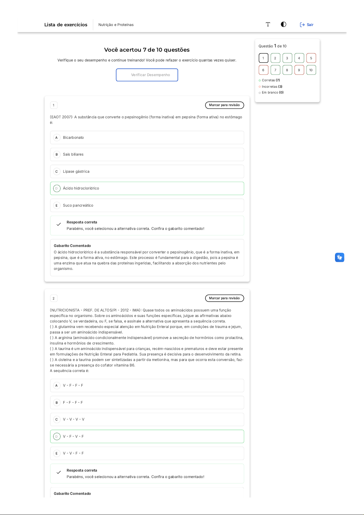 Você acertou 7 de 10 questões Verifique o seu desempenho e continue treinando! Você pode refazer o exercício quantas vezes quiser. Verificar Desempenho A B C D E A B C D E 1 Marcar para revisão (EAOT 2007): A substância que converte o pepsinogênio (forma inativa) em pepsina (forma ativa) no estômago é: Bicarbonato Sais biliares Lipase gástrica Ácido hidroclorídrico Suco pancreático Resposta correta Parabéns, você selecionou a alternativa correta. Confira o gabarito comentado! Gabarito Comentado O ácido hidroclorídrico é a substância responsável por converter o pepsinogênio, que é a forma inativa, em pepsina, que é a forma ativa, no estômago. Este processo é fundamental para a digestão, pois a pepsina é uma enzima que atua na quebra das proteínas ingeridas, facilitando a absorção dos nutrientes pelo organismo. 2 Marcar para revisão (NUTRICIONISTA - PREF. DE ALTOS/PI - 2012 - IMA): Quase todos os aminoácidos possuem uma função específica no organismo. Sobre os aminoácidos e suas funções específicas, julgue as afirmativas abaixo colocando V, se verdadeira, ou F, se falsa, e assinale a alternativa que apresenta a sequência correta. ( ) A glutamina vem recebendo especial atenção em Nutrição Enteral porque, em condições de trauma e jejum, passa a ser um aminoácido indispensável. ( ) A arginina (aminoácido condicionalmente indispensável) promove a secreção de hormônios como prolactina, insulina e hormônios de crescimento. ( ) A taurina é um aminoácido indispensável para crianças, recém-nascidos e prematuros e deve estar presente em formulações de Nutrição Enteral para Pediatria. Sua presença é decisiva para o desenvolvimento da retina. ( ) A cisteína e a taurina podem ser sintetizadas a partir da metionina, mas para que ocorra esta conversão, faz- se necessária a presença do cofator vitamina B6. A sequência correta é: V - F - F - F F - F - F - F V - V - V - V V - F - V - F V - V - F - F Resposta correta Parabéns, você selecionou a alternativa correta. Confira o gabarito comentado! Gabarito Comentado Questão 1 de 10 Corretas (7) Incorretas (3) Em branco (0) 1 2 3 4 5 6 7 8 9 10 Lista de exercícios Nutrição e Proteínas Sair A B C D E A B C D E A sequência correta das afirmativas é: V - F - V - F. A primeira afirmação é verdadeira, pois a glutamina se torna um aminoácido indispensável em condições de trauma e jejum. A segunda afirmação é falsa, pois a arginina não promove a secreção de hormônios como prolactina, insulina e hormônios de crescimento. A terceira afirmação é verdadeira, pois a taurina é um aminoácido indispensável para crianças, recém- nascidos e prematuros e sua presença é decisiva para o desenvolvimento da retina. A última afirmação é falsa, pois a cisteína e a taurina não podem ser sintetizadas a partir da metionina, mesmo com a presença do cofator vitamina B6. 3 Marcar para revisão (PETROBRAS 2010): A digestão de proteínas pode ser dividida em fase gástrica, pancreática e intestinal. A substância secretada pelas células epiteliais presentes no intestino delgado, responsável pelo estímulo às secreções biliodigestivas e promoção da digestão de proteínas e lipídeos, é denominada: Quimiotripsinogênio Colecistoquinina Pepsinogênio Tripsinogênio Proelastase Resposta correta Parabéns, você selecionou a alternativa correta. Confira o gabarito comentado! Gabarito Comentado A substância secretada pelas células epiteliais presentes no intestino delgado, que estimula as secreções biliodigestivas e promove a digestão de proteínas e lipídeos, é a colecistoquinina. Essa substância é um hormônio que atua na regulação do processo digestivo, estimulando a liberação de enzimas digestivas pelo pâncreas e a contração da vesícula biliar. Portanto, a alternativa correta é a "B", que menciona a colecistoquinina. 4 Marcar para revisão (FUNDATEC - 2019 - Prefeitura de Maçambara - RS - Nutricionista): As Leis Fundamentais da Alimentação têm por objetivo possibilitar uma alimentação adequada tanto para a população saudável como para enfermos. Quais são essas leis? Qualidade, planejamento, equilíbrio e higiene. Adequação, quantidade, planejamento e proporção. Proporção, disponibilidade, variedade e proporcionalidade. Quantidade, qualidade, harmonia e adequação. Proporcionalidade, harmonia, higiene e adaptação. Resposta correta Parabéns, você selecionou a alternativa correta. Confira o gabarito comentado! Gabarito Comentado As Leis Fundamentais da Alimentação, que visam garantir uma alimentação adequada para todos, são compostas por quatro princípios: quantidade, qualidade, harmonia e adequação. A quantidade se refere à necessidade de consumir a quantidade correta de alimentos, sem excessos ou deficiências. A qualidade diz respeito à necessidade de escolher alimentos que forneçam todos os nutrientes necessários para o corpo. A harmonia se refere ao equilíbrio entre os diferentes nutrientes e alimentos, enquanto a adequação se refere à necessidade de adaptar a dieta às necessidades individuais de cada pessoa, levando em consideração fatores como idade, sexo, estado de saúde, atividade física, entre outros. Portanto, a alternativa correta é a D: Quantidade, qualidade, harmonia e adequação. A B C D E A B C D E 5 Marcar para revisão (AUXILIAR DE NUTRICIONISTA - PREF. CARUARU/PE - 2012 - IPAD): Para uma alimentação saudável, devemos considerar as Leis da Alimentação. Associe cada lei ao respectivo "princípio" básico, numerando a segunda coluna de acordo com a primeira. (1) Lei da Adequação. (2) Lei da Harmonia. (3) Lei da Qualidade. (4) Lei da Quantidade. ( ) Quantidade de alimentos necessária para o funcionamento do organismo e a manutenção da saúde. ( ) Ingestão de todos os nutrientes necessários ao organismo. ( ) Consideração de peso, estatura, clima, idade, sexo, disponibilidade de alimentos, 