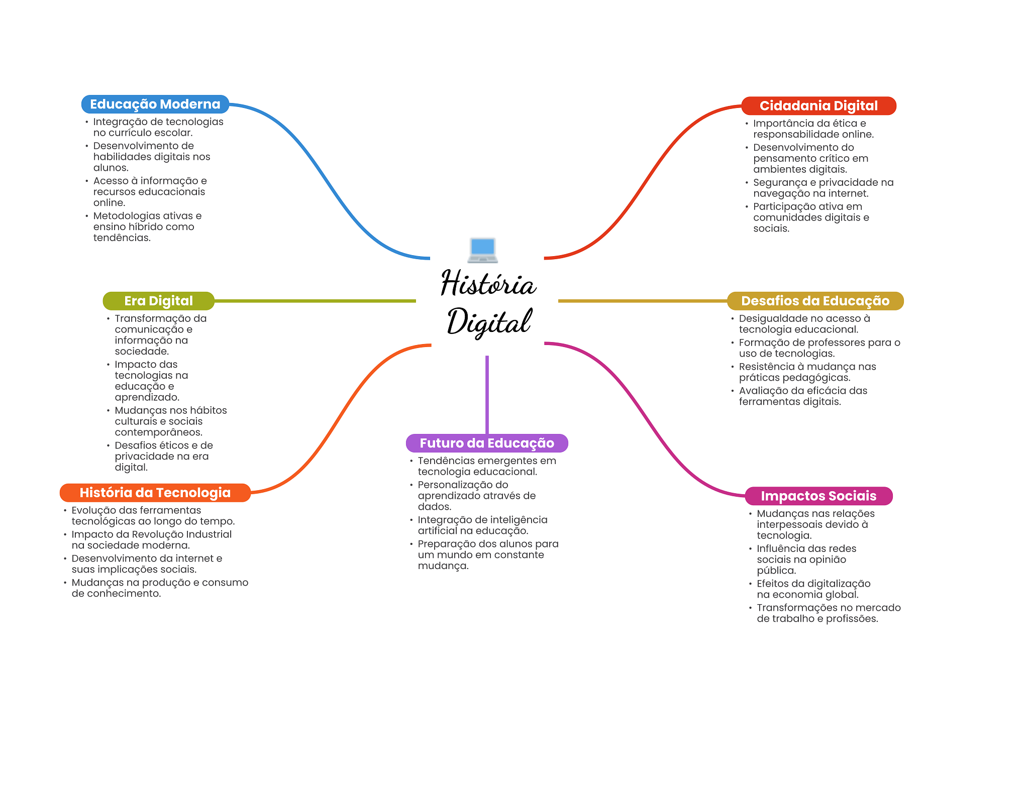 Educação Moderna Cidadania Digital Integração de tecnologias Importância da ética e no currículo escolar. responsabilidade online. Desenvolvimento de Desenvolvimento do habilidades digitais nos pensamento crítico em alunos. ambientes digitais. Acesso à informação e Segurança e privacidade na recursos educacionais navegação na internet. online. Participação ativa em Metodologias ativas e comunidades digitais e ensino híbrido como sociais. tendências. História Era Digital Desafios da Educação Transformação da Digital Desigualdade no acesso à comunicação e tecnologia educacional. informação na Formação de professores para O sociedade. uso de tecnologias. Impacto das Resistência à mudança nas tecnologias na práticas pedagógicas. educação e Avaliação da eficácia das aprendizado. ferramentas digitais. Mudanças nos hábitos culturais e sociais contemporâneos. Desafios éticos e de Futuro da Educação privacidade na era Tendências emergentes em digital. tecnologia educacional. Personalização do História da Tecnologia aprendizado através de Impactos Sociais Evolução das ferramentas dados. Mudanças nas relações tecnológicas ao longo do tempo. Integração de inteligência interpessoais devido à Impacto da Revolução Industrial artificial na educação. tecnologia. na sociedade moderna. Preparação dos alunos para Influência das redes Desenvolvimento da internet e um mundo em constante sociais na opinião suas implicações sociais. mudança. pública. Mudanças na produção e consumo Efeitos da digitalização de conhecimento. na economia global. Transformações no mercado de trabalho e profissões.