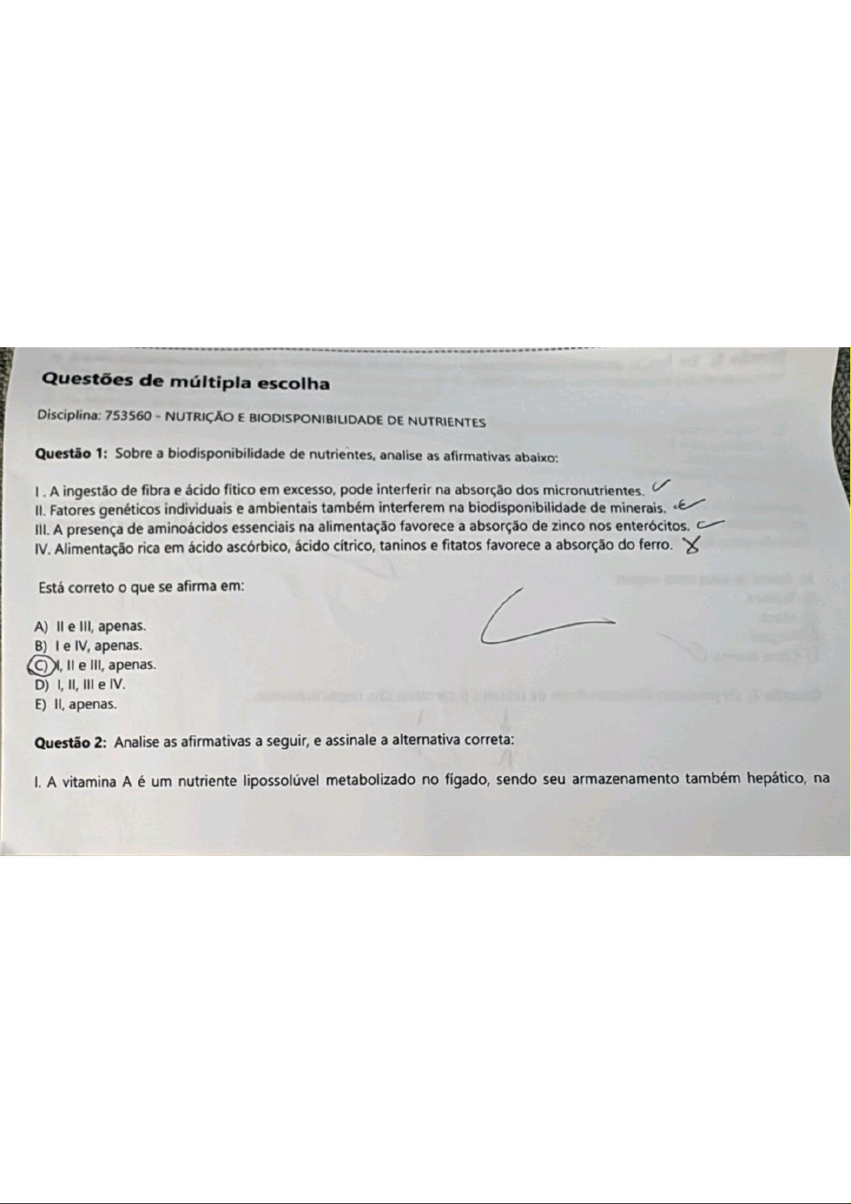 Questões de múltipla escolha Disciplina: 753560 NUTRIÇÃO E BIODISPONIBILIDADE DE NUTRIENTES Questão 1: Sobre a biodisponibilidade de nutrientes, analise as afirmativas abaixo: A ingestão de fibra e ácido fítico em excesso, pode interferir na absorção dos micronutrientes. II. Fatores genéticos individuais e ambientais também interferem na biodisponibilidade de minerais. III. A presença de aminoácidos essenciais na alimentação favorece a absorção de zinco nos enterócitos. IV. Alimentação rica em ácido ascórbico, ácido cítrico, taninos e fitatos favorece a absorção do ferro. X Está correto que se afirma em: A) e III, apenas. B) I e IV, apenas. e III, apenas. D) I, II, III e IV. E) II, apenas. Questão 2: Analise as afirmativas a seguir, e assinale a alternativa correta: I. A vitamina A é um nutriente lipossolúvel metabolizado no fígado, sendo seu armazenamento também hepático, naforma de éster de retilina. a ação Para da transporte enzima deste nutriente (vitamina A), a ausência de desnutrição proteica, assim integridade hepática, palmitato de retinol lecitina no rim. aciltransferase tem um papel importante, pois é responsável pela como reesterificação a do retinol em A respeito dessas asserções, assinale a opção correta. A) B) As As asserções e são proposições verdadeiras, e a é uma justificativa correta da C) A asserções I e são proposições verdadeiras, mas a não é uma justificativa correta da D) A asserção é uma proposição e a é uma proposição As asserção é uma proposição falsa, e a é uma proposição verdadeira. asserções e são proposições falsas. Questão são, respectivamente, 3: A carência de vitaminas representadas por I, e III produzem avitaminoses cujos aos números I, e escorbuto, raquitismo e cegueira noturna. Que alternativa apresenta as vitaminas correspondentes sintomas A) vit. vit. D, III vit. E. B) vit. E vit. B, III vit. A. vit. - vit. D, III vit. A. D) I vit. A vit. B, III vit. E. E) vit. vit. B, III vit. A. Questão 4: ácido fítico (também conhecido como fitato, quando em forma de sal) é uma forma utilizada pelas planta para armazenamento de fósforo. A é um composto químico classificado como alcaloide do grupo das xantina São alimentos ricos em cafeína e ácido fítico, respectivamente: A) Chá preto e farelo de trigo. B) Groselha e café. C) Chocolate e café. D) Chocolate e vinagre de vinho. E) Café e refrigerante a base de cola. Questão 5: Em função do desenvolvimento esquelético, muscular e endócrino acelerados e a maturação sexual, as necessidades dos adolescentes são maiores em relação ao: A) Cálcio e B) Ferro e vitamina C. C) Vitaminas B6 e B12. D) lodo e E) Vitamina E e vitamina C. Questão 6: zinco é necessário para o bom desenvolvimento neurológico do bebê e a sua deficiência pode provocar malformações congênitas, baixo peso ao nascimento e morte prematura. Dos alimentos abaixo há um que tem melhor fonte de zinco, identifique-o: A) Azeite de oliva extra virgem. B) Tapioca. Vagem. E) Carne bovina. Questão 7: Os principais alimentos-fonte de retinol e são, respectivamente: A2 Folhosos verdes-escuros, tais como espinafre, agrião, rúcula, chicória e vegetais amarelos e alaranjados são importantes alimentos-fonte de vitamina A pré-formada (retinol). B) Figado, ovo, leite e derivados são as principais fontes de retinol está presente em alimentos de origem animal e o em alimentos de origem vegetal. D) Como não será transformado em retinol no organismo, as fontes contendo não devem ser consumidas na alimentação. retinol pode ser obtido das leveduras, esteróis de plantas e concentrados de frutos cítricos. Questão 8: Nutriente que atua como antioxidante, na reciclagem da vitamina E, além de favorecer a produção e manutenção do colágeno. Estamos falando de qual nutriente? São seus alimentos fonte: A) Ácido fólico. Laranja, couve e repolho. B) Vitamina C. Alcatra, laranja e morango. Riboflavina. Farelo de trigo, acém e morango. Ácido ascórbico. Acerola, brócolis e goiaba. Tiamina. Farelo de trigo, castanha e gérmen de trigo. Questão 9: Ao atender um paciente, você observou deficiência de vitaminas K e E. Qual preparação abaixo você incluiria no planejamento alimentar com intuito de aumentar o consumo dessas 2 vitaminas? A) Espinafre cozido em calor úmido direto. B) Bife de figado grelhado. Espinafre refogado em óleo vegetal. D) Ovos cozidos em água, E) Peixe frito em gordura hidrogenada Questão 10: Sobre o metabolismo do ferro, é correto afirmar que: A) A melhor forma de absorção do ferro é a férrica. B) espinafre e o representam as maiores fontes de Uma das formas de armazenamento do ferro é a ferritina. D) Os fitatos e o ácido ascórbico dificultam a absorção do ferro. E) requerimento de ferro para mulheres em idade reprodutiva é inferior aos homens da mesma