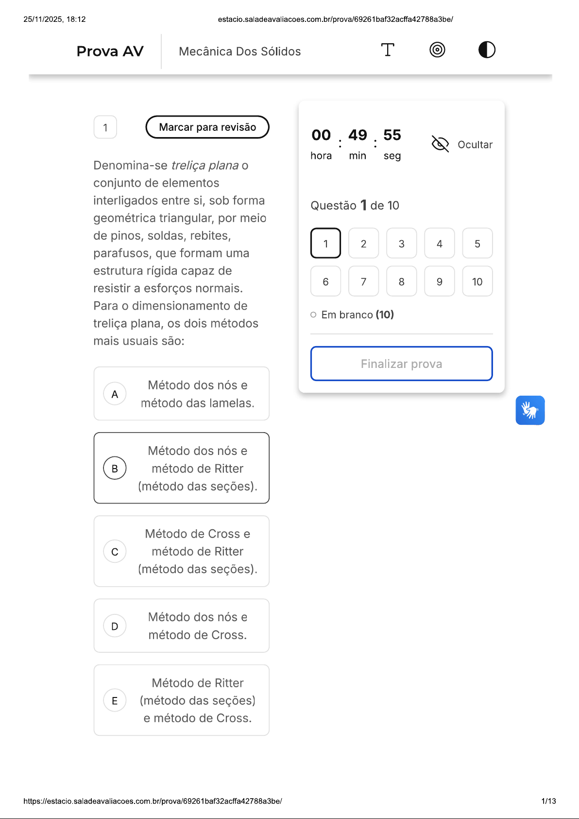 25/11/2025, 18:12 estacio.saladeavaliacoes.com.br/prova/69261baf32acffa42788a3be/ Prova AV Mecânica Dos Sólidos T 1 Marcar para revisão 00 : 49 : 55 Ocultar hora min seg Denomina-se treliça plana conjunto de elementos interligados entre si, sob forma Questão 1 de 10 geométrica triangular, por meio de pinos, soldas, rebites, 1 2 3 4 5 parafusos, que formam uma estrutura rígida capaz de 6 7 8 9 10 resistir a esforços normais. Para dimensionamento de Em branco (10) treliça plana, os dois métodos mais usuais são: Finalizar prova Método dos nós e A método das lamelas. Método dos nós e método de Ritter (método das seções). Método de Cross e c método de Ritter (método das seções). Método dos nós e D método de Cross. Método de Ritter E (método das seções) e método de Cross. 1/1325/11/2025, 18:12 estacio.saladeavaliacoes.com.br/prova/69261baf32acffa42788a3be/ 2 Marcar para revisão Em resistência dos materiais, de acordo com a tensão e deformação carregamento axial, onde E é deformação específica normal de uma barra sob carga axial; δ é a deformação da barra; e, L é comprimento da barra, assinale a alternativa correta. A ε = δ/L c D ε = δ x L E 3 Marcar para revisão Uma das fases para a resolução de um problema de equilíbrio estático é o desenho do diagrama do corpo livre de um corpo, em que as forças ativas e reativas são indicadas. Após essa fase, segue a fase das equações do equilíbrio e, por fim, a resolução 2/1325/11/2025, 18:12 estacio.saladeavaliacoes.com.br/prova/69261baf32acffa42788a3be/ matemática do problema. As figuras abaixo mostram algumas estruturas e seus diagramas do corpo livre. Marque a opção em que DCL está completo. A Fonte: Autor C Fonte: Autor B c A Fonte: Autor 3/1325/11/2025, 18:12 estacio.saladeavaliacoes.com.br/prova/69261baf32acffa42788a3be/ D Fonte: Autor E C D atrito Fonte: Autor 4 Marcar para revisão Existem vários métodos que auxiliam na resolução das treliças, ou seja, na determinação das forças que agem nas barras. Um desses métodos é chamado de "método dos nós". Em linhas gerais, aplica-se equilíbrio translacional nos eixos X e y, e duas equações são geradas. Esse passo é repetido algumas vezes. Supondo uma treliça com um número grande de nós, O trabalho algébrico é demasiado. Nesses casos, a utilização de uma ferramenta computacional é adequada. Que método pode ser aplicado? 4/1325/11/2025, 18:12 Um método para a determinação de A raízes - Newton Raphson, por exemplo. Um método que resolva um sistema de equações lineares Gauss Jordan, por exemplo. Um método para a determinação de c áreas sob uma curva Regra de Simpson, por exemplo. Um método para a D determinação de EDO Euller, por exemplo. Um método para a otimização de E equações lineares Simplex, por exemplo. 5 Marcar para revisão Existem vários métodos que auxiliam na modelagem de vigas isostáticas bi apoiadas. Suponha, em particular, a modelagem matemática para fazer a substituição de um 5/1325/11/2025, 18:12 estacio.saladeavaliacoes.com.br/prova/69261baf32acffa42788a3be/ carregamento distribuído pela carga concentrada equivalente. Após a modelagem, a utilização de uma ferramenta computacional é adequada. A ferramenta computacional escolhida deve utilizar um método numérico. Que método pode ser aplicado? Um método para a determinação de A raízes Newton Raphson, por exemplo. Um método que resolva um sistema de equações lineares Gauss Jordan, por exemplo. Um método para a determinação de c áreas sob uma curva Regra de Simpson, por exemplo. Um método para a D determinação de EDO Euller, por exemplo. Um método para a otimização de E equações lineares Simplex, por exemplo. 6/1325/11/2025, 18:12 estacio.saladeavaliacoes.com.br/prova/69261baf32acffa42788a3be/ 6 Marcar para revisão Genericamente, no estudo das vigas dois grupos de carregamentos são importantes: as cargas concentradas e as cargas distribuídas ao longo do comprimento. Supondo uma viga bi apoiada isostática sob carregamento uniformemente distribuído. Dos exemplos abaixo, qual representa esse carregamento? Uma pessoa na A sacada de um apartamento. Uma viga apoiada sobre outra, transversalmente. Uma parede de um c apartamento. Quatro vigas apoiadas D em uma, igualmente espaçadas. A carga de uma caixa E dágua na laje de uma casa. 7/1325/11/2025, 18:12 estacio.saladeavaliacoes.com.br/prova/69261baf32acffa42788a3be/ 7 Marcar para revisão Considere uma barra que a 20°C tenha diâmetro 200 mm e seja feita de um material cujo coeficiente de expansão térmica vale 24 X 10⁻⁶ e módulo de elasticidade 70 GPa. Se uma força constante de 30 kN passa a agir sobre a seção reta da barra quando a temperatura é de 120°C, determine a tensão normal média na barra. Utilize π = 3. A 1,000 MPa 1,052 MPa c 0,995 MPa D 0,985 MPa E 0,958 MPa 8 Marcar para revisão Um ponto da superfície de uma peça está sujeito a um estado plano de tensões onde e são tensões principais não nulas. No plano dessas tensões, a tensão cisalhante 8/1325/11/2025, 18:12 máxima é obtida pela expressão: A 2 2 c - D 2 σ₁ E 2 9 Marcar para revisão Na análise dos problemas de estática, desenho do DCL é fundamental. Nesse desenho, todos os apoios que estão na estrutura devem ser substituídos por forças e/ou momentos, dependendo do tipo de restrição que cada um impõe (translação ou de rotação). A seguir seguem alguns vínculos comuns na Engenharia. Nas opções abaixo, marque aquela que identifica corretamente um vínculo de segundo gênero. 9/1325/11/2025, 18:12 estacio.saladeavaliacoes.com.br/prova/69261baf32acffa42788a3be/ A Solda atrito 10/1325/11/2025, 18:12 estacio.saladeavaliacoes.com.br/prova/69261baf32acffa42788a3be/ c D E 11/1325/11/2025, 18:12 estacio.saladeavaliacoes.com.br/prova/69261baf32acffa42788a3be/ 10 Marcar para revisão As tensões normais σ e as tensões de cisalhamento T em um ponto de um 