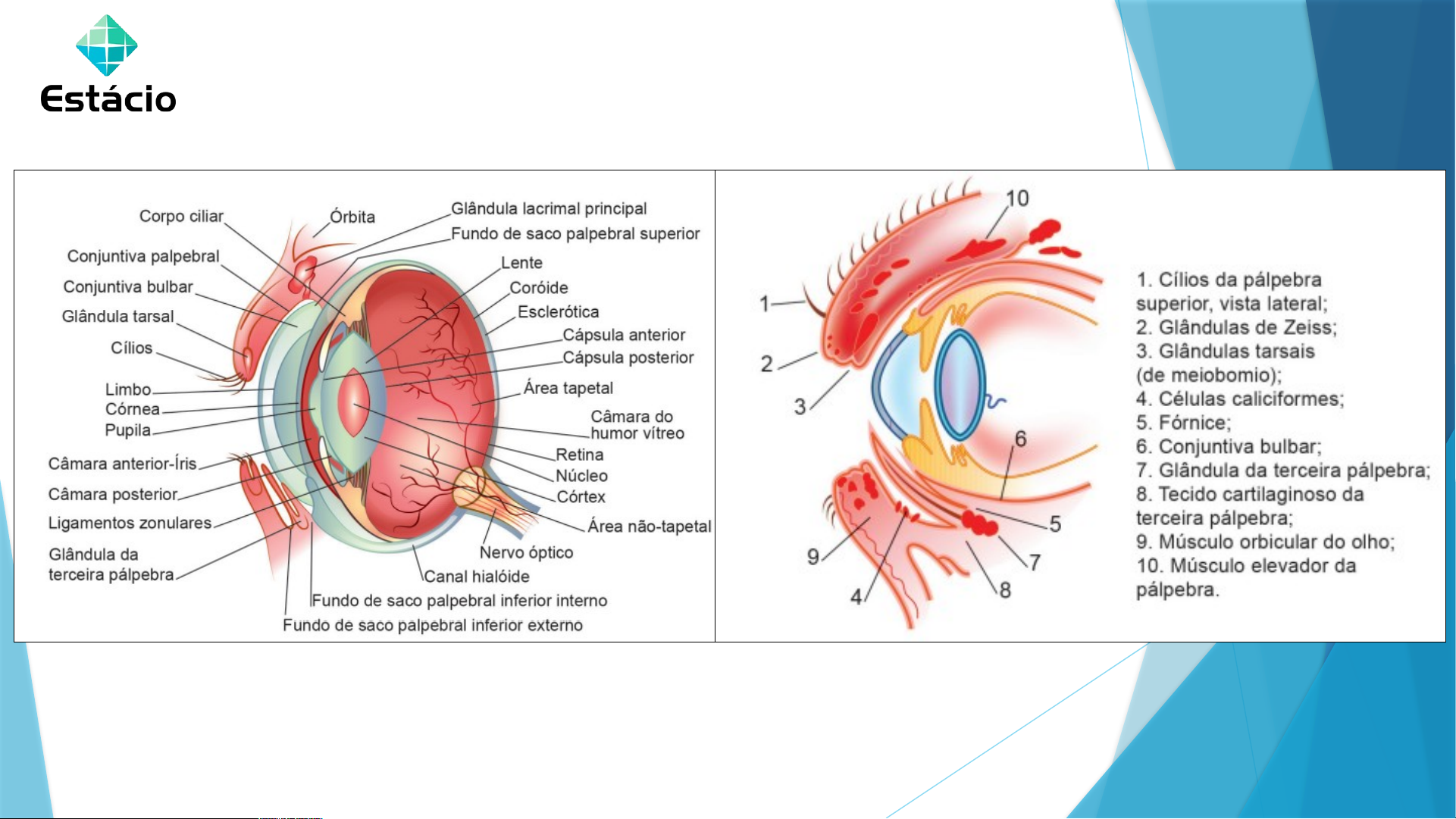 ESTRUTURA DO BULBO DO OLHO ENTENDA AS PRINCIPAIS DENOMINAÇÕES DA ESTRUTURA OCULAR: BULBO OCULAR • Túnica fibrosa = córnea e esclera. • Trato uveal = íris, corpo ciliar e coroide. •Túnica nervosa = retina e nervo óptico. MEIOS TRANSPARENTES - humor aquoso, lente e humor vítreo. ANEXOS OCULARES - órbita, músculos extraoculares, pálpebras, terceira pálpebra e conjuntiva CAMADA FIBROSA EXTERNA-ESCLERA O colágeno transparente da córnea transforma-se em opaco e esbranquiçado. Auxilia na resistência do olho devido a tensão do humor aquoso. Presta-se para fixação dos músculos extraoculares e é trespassado pelo nervo óptico. Possui numerosos vasos sanguíneos vindos de artérias ciliares anteriores, por isso é sobremaneira vascularizado. É a camada refratária mais prestigiosa do olho sendo o primeiro meio refringente a qual tem-se uma percepção inicial, visível, do globo ocular. Sendo avascular, as suas necessidades nutricionais e de oxigénio são supridas por difusão, internamente, pelo humor aquoso e externamente, pelo filme lacrimal. Funções podemos elencar o suporte do conteúdo intraocular, a refração e a transmissão da luz. A córnea é inervada pelos nervos ciliares que derivam do nervo trigêmeo. CAMADA FIBROSA EXTERNA-CÓRNEA CAMADA MÉDIA- CORIÓIDE Camada situada entre esclera e a retina sendo incumbida pelo fornecimento de sangue, oxigênio e nutrientes do epitélio pigmentar da retina. A corióide forma uma área ligeiramente refletora. CAMADA MÉDIA- CORPO CILIAR Situado entre o corióide e a íris. Está intimamente em contato com o corpo vítreo sendo responsável pela produção do humor aquoso. Função de manter a pressão ocular bem como seu formato esférico. Os músculos ciliares se contraem alterando o formato da lente para que haja melhor acomodação ao campo visual, permitindo assim, um melhor foco dos objetos. CAMADA MÉDIA- ÍRIS É o componente mais externo da úvea, é ela que determina qual será o formato da pupila, sendo que no felino terá a forma de um sulco vertical. É organizada por uma rede delgada de vasos sanguíneos, nervos e fibras musculares sendo responsável pela cor dos olhos. As fibras musculares fazem com que haja uma adaptação de dilatação e ou estreitamento da pupila quando houver a presença de luminosidade. CAMADA INTERNA - RETINA Converte a luminosidade física em química através do nervo óptico levando informações pelos neurônios até o cérebro. Apenas dois terços da retina podem ser atingidos pela luz ao entrar pela abertura pupilar. CAMADA INTERNA - NERVO ÓPTICO Conhecido como II par de nervo craniano. É formado pela fusão dos axônios das células ganglionares da retina. Sua cobertura é mielinizada quando passa da área crivosa da esclera e a corióide formando o nervo óptico . VIA LACRIMAL ÓRGÃOS OCULARES ACESSÓRIOS PÁLPEBRAS E CONJUNTIVA A Pálpebra são em número de três, sendo que a superior e a inferior protegem o olho prevenindo de ressecamento da córnea através da distribuição da lágrima bem como tem uma função de levar esta lágrima para a região nasal do bulbo. As margens das pálpebras não apresentam cílios embora alguns possam aparecer na pálpebra superior. A terceira pálpebra situada no canto medial do olho cujo formato aparece com a letra T e devido a isso pode cobrir metade da córnea quando o bulbo está retraído, e possui ainda uma glândula lacrimal nictitante serosa produtora de imunoglobulinas que protegem o olho contra infecções . A pálpebra em sua face interna, é coberta pela conjuntiva. Esta membrana cobre ainda a superfície do globo ocular entre o fórnice conjuntival e a córnea (conjuntiva bulbar). APARELHO LACRIMAL O aparelho lacrimal é matizado por dois componentes: o aparelho secretor e o aparelho excretor. No aparelho secretor encontra-se três glândulas sendo; a glândula lacrimal, que situada entre duas camadas da periórbita, e tem como função precípua produzir uma secreção salina, capaz de digerir a cápsula de certas bactérias. A glândula da terceira pálpebra e a glândulas acessórias. Excretor é possuidor de redes de condutos que drena o filme lacrimal até a cavidade nasal. A drenagem lacrimal ocorre quando o excesso de lágrima acumula-se no fundo do saco conjuntival inferior; pela gravidade é bombeado mecanicamente para o ponto lacrimal inferior e superior e para os canalículos lacrimais, pelo mecanismo de piscar. São inervados por três nervos craniais: oculomotor, troclear e abducente. Mm. Retos: (dorsal, ventral, lateral e medial) Inervação: Nervo oculomotor (Mm. retos dorsal,ventral e medial). Nervo abducente (m. reto lateral). M. retrator do globo ocular - Inervação: Nervo abducente. M. Oblíquo dorsal - Inervação: Nervo troclear M. Oblíquo Ventral M. levantador da pálpebra superior nervação: Nervo oculomotor. Músculos extrínsecos do globo ocular M. reto lateral M. reto ventral M. reto dorsal M. oblíquo ventral M. retrator do globo M. retrator do globo ocular M. oblíquo ventral Nervo óptico ORELHA PAVILHÃO AURICULAR 1- utrículo. 2- sáculo. 3- ductos semicirculares. 4- ampolas contendo cristas ampulares. 5- ducto endolinfático. 6, 7- máculas. 8- ducto coclear. image1.png image2.png image3.png image4.jpeg image5.jpeg image6.png image7.png image8.gif image9.jpeg image10.png image11.png image12.jpeg image13.png image14.png image15.png image16.png image17.png image18.png image19.png image20.png image21.png image22.png image23.png image24.png image25.png image26.jpeg image27.png image28.jpeg image29.png image30.png image31.png image32.png image33.png