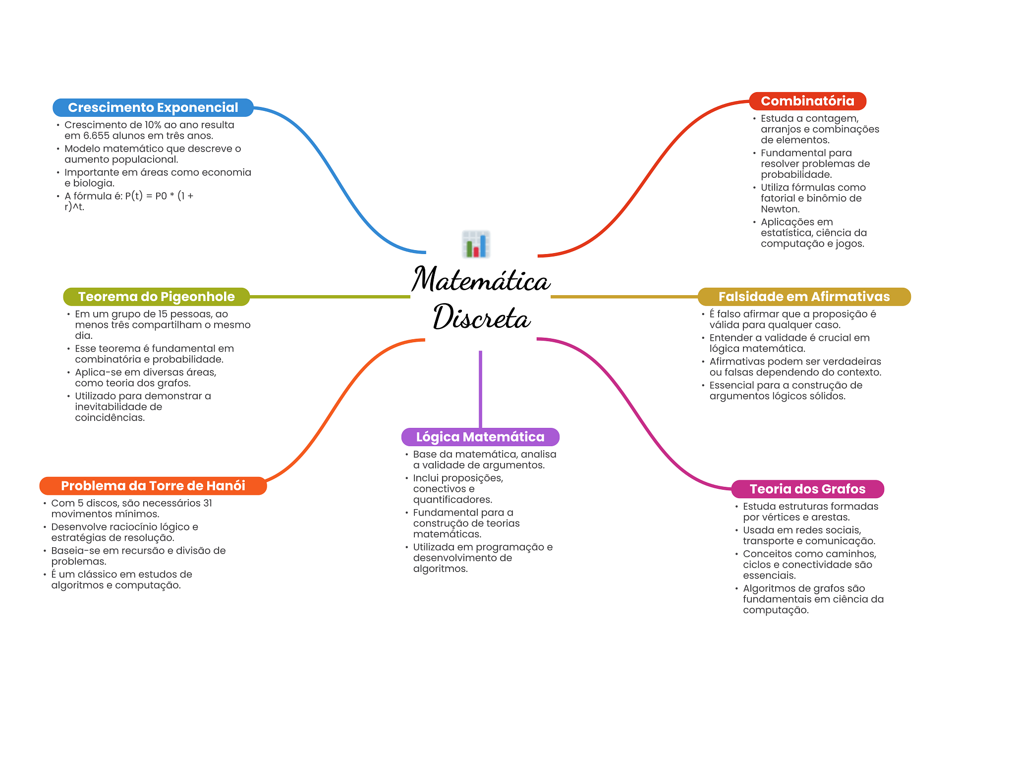 Combinatória Crescimento Exponencial Estuda a contagem, Crescimento de 10% ao ano resulta arranjos e combinações em 6.655 alunos em três anos. de elementos. Modelo matemático que descreve Fundamental para aumento populacional. resolver problemas de Importante em áreas como economia probabilidade. e biologia. Utiliza fórmulas como A fórmula é: P(t) PO * + fatorial e binômio de Newton. Aplicações em estatística, ciência da computação e jogos. Matemática Teorema do Pigeonhole Falsidade em Afirmativas Em um grupo de 15 pessoas, ao Discreta É falso afirmar que a proposição é menos três compartilham O mesmo válida para qualquer caso. dia. Entender a validade é crucial em Esse teorema é fundamental em lógica matemática. combinatória e probabilidade. Afirmativas podem ser verdadeiras Aplica-se em diversas áreas, ou falsas dependendo do contexto. como teoria dos grafos. Essencial para a construção de Utilizado para demonstrar a argumentos lógicos sólidos. inevitabilidade de coincidências. Lógica Matemática Base da matemática, analisa a validade de argumentos. Inclui proposições, Problema da Torre de Hanói conectivos e Teoria dos Grafos Com 5 discos, são necessários 31 quantificadores. Estuda estruturas formadas movimentos mínimos. Fundamental para a por vértices e arestas. Desenvolve raciocínio lógico e construção de teorias matemáticas. Usada em redes sociais, estratégias de resolução. transporte e comunicação. Baseia-se em recursão e divisão de Utilizada em programação e desenvolvimento de Conceitos como caminhos, problemas. É um clássico em estudos de algoritmos. ciclos e conectividade são essenciais. algoritmos e computação. Algoritmos de grafos são fundamentais em ciência da computação.