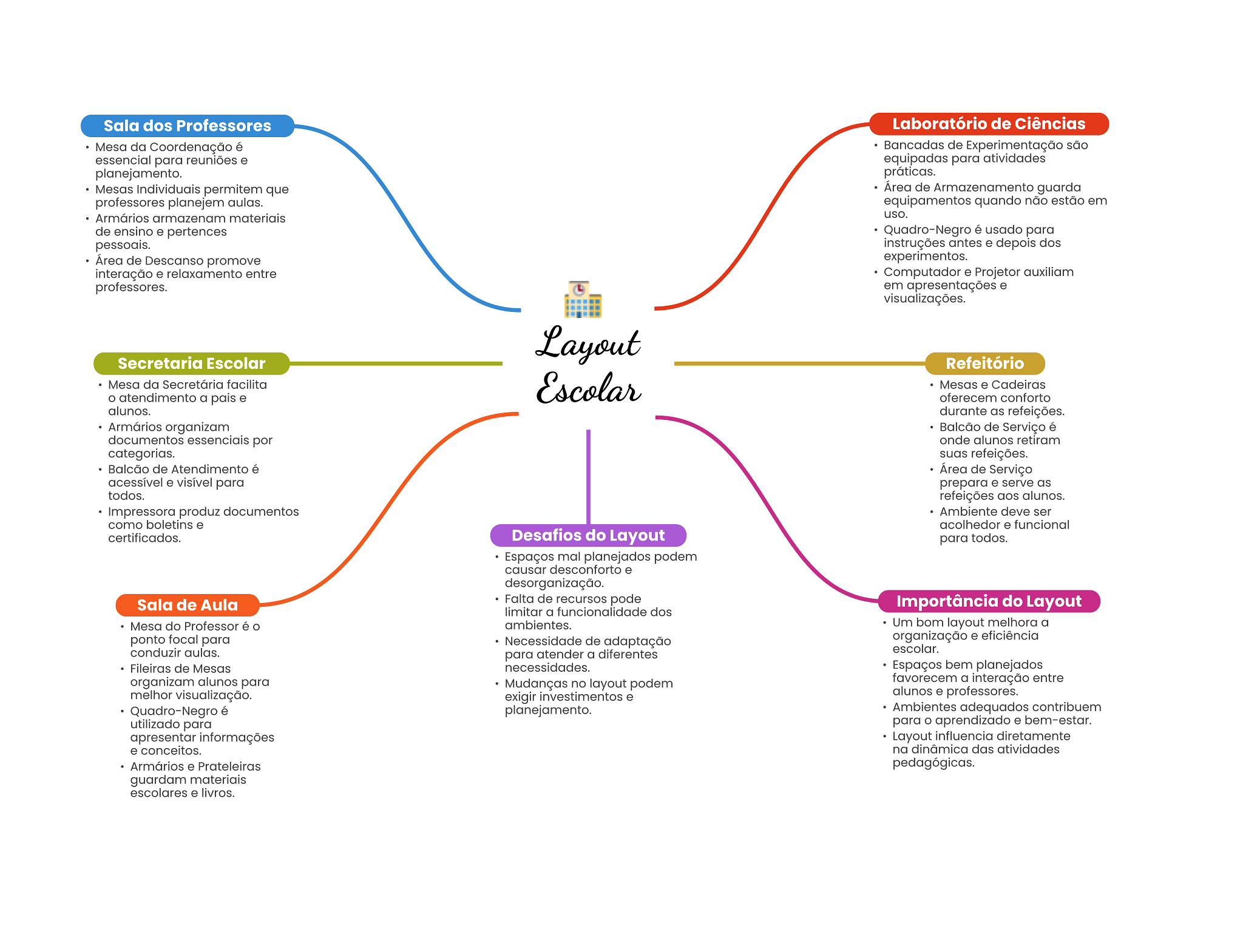 Sala dos Professores Laboratório de Ciências Mesa da Coordenação é Bancadas de Experimentação são essencial para reuniões e equipadas para atividades planejamento. práticas. Mesas Individuais permitem que Área de Armazenamento guarda professores planejem aulas. equipamentos quando não estão em Armários armazenam materiais uso. de ensino e pertences Quadro-Negro é usado para pessoais. instruções antes e depois dos Área de Descanso promove experimentos. interação e relaxamento entre Computador e Projetor auxiliam professores. em apresentações e visualizações. Layout Secretaria Escolar Refeitório Mesa da Secretária facilita Escolar Mesas e Cadeiras atendimento a pais e oferecem conforto alunos. durante as refeições. Armários organizam Balcão de Serviço é documentos essenciais por onde alunos retiram categorias. suas refeições. Balcão de Atendimento é Área de Serviço acessível e visível para prepara e serve as todos. refeições aos alunos. Impressora produz documentos Ambiente deve ser como boletins e acolhedor e funcional certificados. Desafios do Layout para todos. Espaços mal planejados podem causar desconforto e desorganização. Sala de Aula Falta de recursos pode Importância do Layout limitar a funcionalidade dos Mesa do Professor é ambientes. Um bom layout melhora a ponto focal para Necessidade de adaptação organização e eficiência conduzir aulas. escolar. para atender a diferentes Fileiras de Mesas necessidades. Espaços bem planejados organizam alunos para Mudanças no layout podem favorecem a interação entre melhor visualização. exigir investimentos e alunos e professores. Quadro-Negro é planejamento. Ambientes adequados contribuem utilizado para para aprendizado e bem-estar. apresentar informações Layout influencia diretamente e conceitos. na dinâmica das atividades Armários e Prateleiras pedagógicas. guardam materiais escolares e livros.