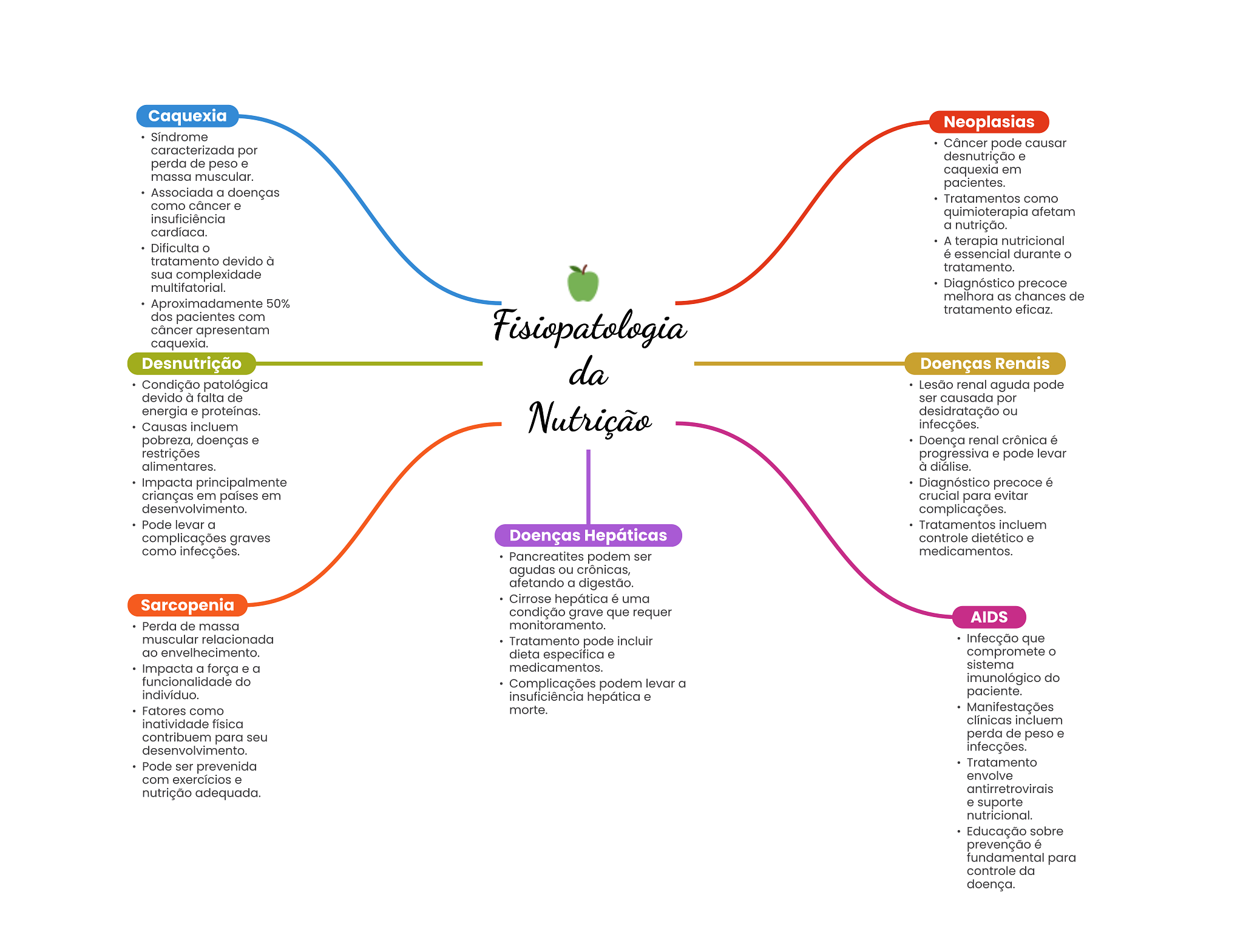 Caquexia Neoplasias Síndrome Câncer pode causar caracterizada por desnutrição e perda de peso e massa muscular. caquexia em pacientes. Associada a doenças Tratamentos como como câncer e insuficiência quimioterapia afetam cardíaca. a nutrição. Dificulta A terapia nutricional é essencial durante tratamento devido à tratamento. sua complexidade multifatorial. Diagnóstico precoce melhora as chances de Aproximadamente 50% tratamento eficaz. dos pacientes com câncer apresentam Fisiopatologia caquexia. Desnutrição da Doenças Renais Condição patológica Lesão renal aguda pode devido à falta de ser causada por energia e proteínas. Nutrição desidratação ou Causas incluem infecções. pobreza, doenças e Doença renal crônica é restrições progressiva e pode levar alimentares. à diálise. Impacta principalmente Diagnóstico precoce é crianças em países em crucial para evitar desenvolvimento. complicações. Pode levar a Tratamentos incluem complicações graves Doenças Hepáticas controle dietético e como infecções. medicamentos. Pancreatites podem ser agudas ou crônicas, afetando a digestão. Sarcopenia Cirrose hepática é uma condição grave que requer AIDS Perda de massa monitoramento. muscular relacionada Tratamento pode incluir Infecção que ao envelhecimento. dieta específica e compromete O Impacta a força e a medicamentos. sistema funcionalidade do Complicações podem levar a imunológico do indivíduo. insuficiência hepática e paciente. Fatores como morte. Manifestações inatividade física clínicas incluem contribuem para seu perda de peso e desenvolvimento. infecções. Pode ser prevenida Tratamento com exercícios e envolve nutrição adequada. antirretrovirais e suporte nutricional. Educação sobre prevenção é fundamental para controle da doença.