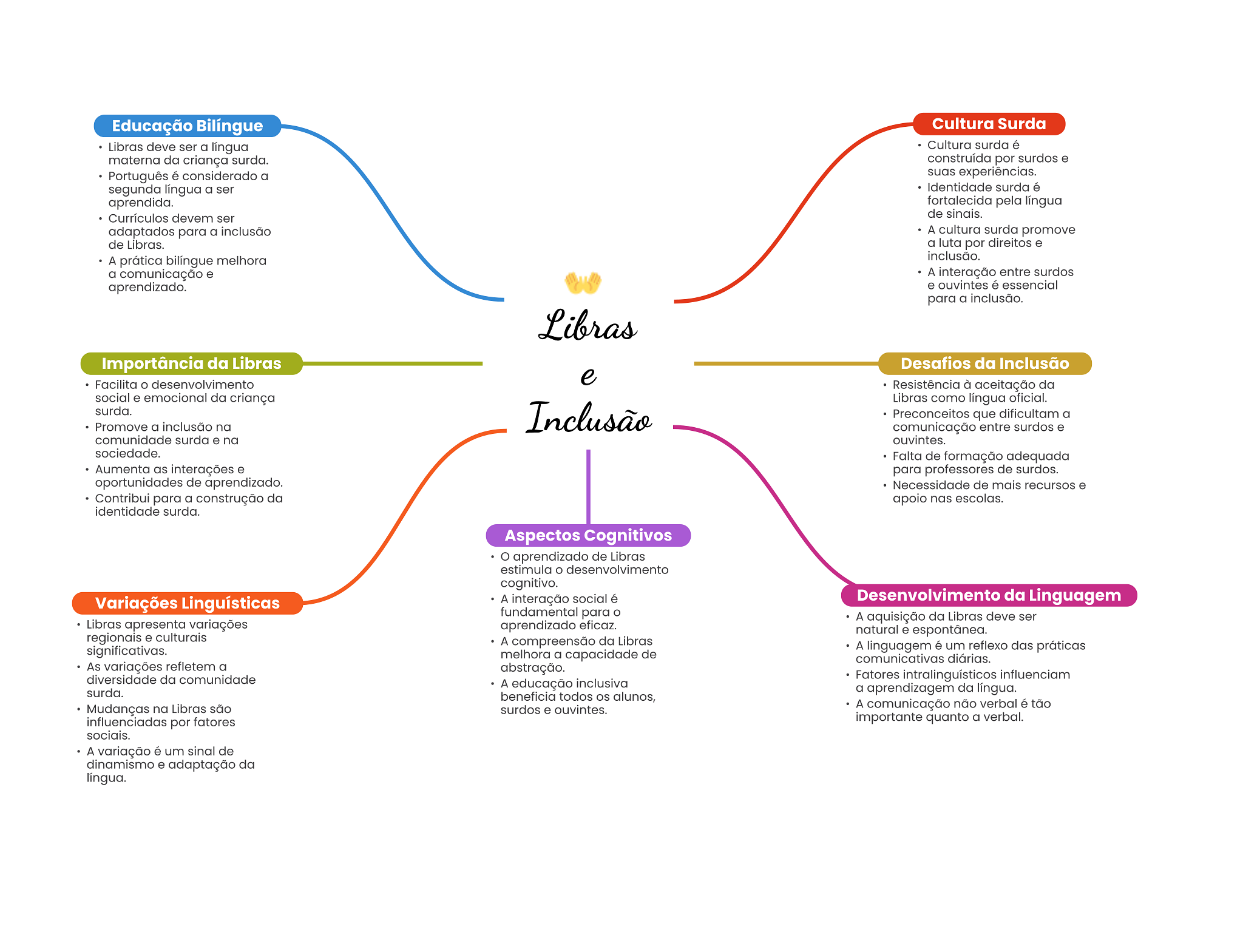Educação Bilíngue Cultura Surda Libras deve ser a língua Cultura surda é materna da criança surda. construída por surdos e Português é considerado a suas experiências. segunda língua a ser Identidade surda é aprendida. fortalecida pela língua Currículos devem ser de sinais. adaptados para a inclusão A cultura surda promove de Libras. a luta por direitos e A prática bilíngue melhora inclusão. a comunicação e A interação entre surdos aprendizado. e ouvintes é essencial para a inclusão. Libras Importância da Libras Desafios da Inclusão Facilita desenvolvimento e Resistência à aceitação da social e emocional da criança Libras como língua oficial. surda. Promove a inclusão na Inclusão Preconceitos que dificultam a comunicação entre surdos e comunidade surda e na ouvintes. sociedade. Falta de formação adequada Aumenta as interações e para professores de surdos. oportunidades de aprendizado. Necessidade de mais recursos e Contribui para a construção da apoio nas escolas. identidade surda. Aspectos Cognitivos aprendizado de Libras estimula desenvolvimento cognitivo. Variações Linguísticas A interação social é Desenvolvimento da Linguagem fundamental para O A aquisição da Libras deve ser Libras apresenta variações aprendizado eficaz. natural e espontânea. regionais e culturais A compreensão da Libras significativas. A linguagem é um reflexo das práticas melhora a capacidade de comunicativas diárias. As variações refletem a abstração. diversidade da comunidade Fatores intralinguísticos influenciam A educação inclusiva surda. a aprendizagem da língua. beneficia todos alunos, Mudanças na Libras são surdos e ouvintes. A comunicação não verbal é tão influenciadas por fatores importante quanto a verbal. sociais. A variação é um sinal de dinamismo e adaptação da língua.