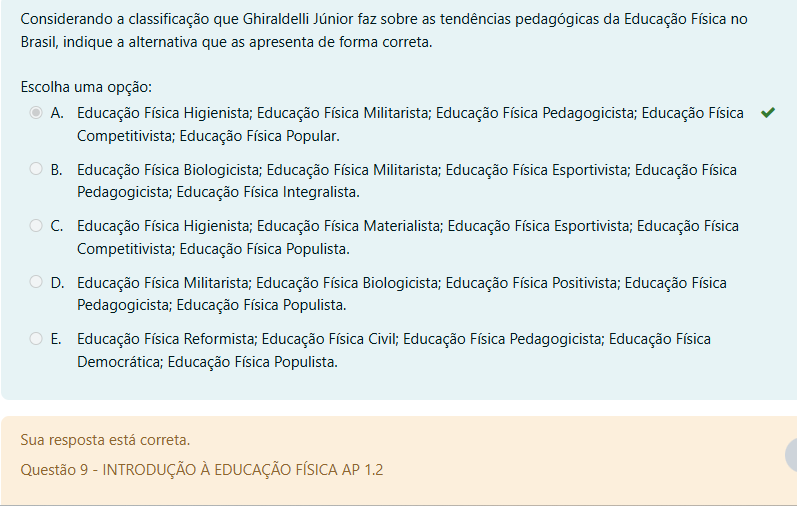 Considerando a classificação que Ghiraldelli Júnior faz sobre as tendências pedagógicas da Educação Física no Brasil, indique a alternativa que as apresenta de forma correta. Escolha uma opção: A. Educação Física Higienista; Educação Física Militarista; Educação Física Pedagogicista; Educação Física Competitivista; Educação Física Popular. B. Educação Física Biologicista; Educação Física Militarista; Educação Física Esportivista; Educação Física Pedagogicista; Educação Física Integralista. C. Educação Física Higienista; Educação Materialista; Educação Física Esportivista; Educação Física Competitivista; Educação Física Populista. D. Educação Física Militarista; Educação Física Biologicista; Educação Física Positivista; Educação Física Pedagogicista; Educação Física Populista. E. Educação Física Reformista; Educação Física Civil; Educação Física Pedagogicista; Educação Física Democrática; Educação Física Populista. Sua resposta está correta. Questão 9 INTRODUÇÃO À EDUCAÇÃO FÍSICA AP 1.2
