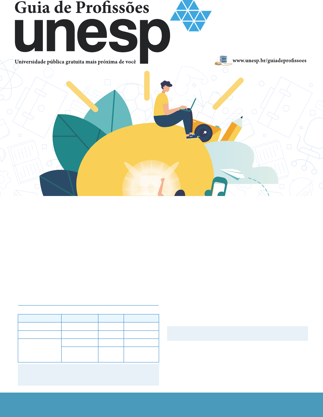 Neste Encarte são apresentados todos os cursos ofe- recidos pela Unesp, em quadros com os seguintes dados: câmpus universitário onde o curso é oferecido, período de aulas, número de vagas e duração mínima. Na tabela abaixo, veja o exemplo do curso de Engenharia Civil. Períodos de aula (Resolução Unesp nº 29/2019) Matutino: aulas somente no período da manhã; Vespertino: aulas somente no período da tarde; Noturno: aulas somente no período da noite; Vespertino-noturno: aulas no período da noite e, eventualmente, à tarde; Integral: aulas distribuídas nos períodos da manhã e da tarde e, excepcionalmente à noite. Alguns cursos poderão programar atividades obrigatórias fora do período de aulas ou aos sábados. B/L Indica alternativas para Bacharelado (B) e Licenciatura (L). Em alguns cursos, a opção dá-se no seu transcorrer; em outros, deve ser feita já no momento da inscrição para o vestibular. Por isso, é bom ir pensando no assunto desde já. Tabelas de cursos Câmpus universitário onde o curso é oferecido, período de aulas, número de vagas e duração mínima Parte integrante do Guia de Profissões – Vestibular Unesp 2019 Nota: As informações sobre período, número de vagas, duração, data de realização de exame e nome dos cursos podem ser alteradas ao longo do ano. ENGENHARIA CIVIL Câmpus Período Vagas Duração Bauru Integral 60 5 anos Guaratinguetá Integral 40 5 anos Ilha Solteira Integral 40 (jan.) 5 anos Integral 40 (com início em ago.) 5 anos CIÊNCIA DA COMPUTAÇÃO Câmpus Período Vagas Duração Bauru Integral 30 4 anos Presidente Prudente Vespertino/Noturno 35 4,5 anos Rio Claro Integral 30 4 anos Noturno 30 5 anos São José do Rio Preto Integral 35 4 anos ENGENHARIA AERONÁUTICA Câmpus Período Vagas Duração São João da Boa Vista Integral 40 5 anos ENGENHARIA AMBIENTAL Câmpus Período Vagas Duração Presidente Prudente Integral 35 5 anos Rio Claro Integral 30 5 anos São José dos Campos Integral 40 5 anos Sorocaba Integral 40 5 anos ENGENHARIA BIOTECNOLÓGICA Câmpus Período Vagas Duração Assis Integral 45 5 anos ENGENHARIA CARTOGRÁFICA E DE AGRIMENSURA Câmpus Período Vagas Duração Presidente Prudente Integral 40 5 anos ENGENHARIA CIVIL Câmpus Período Vagas Duração Bauru Integral 60 5 anos Guaratinguetá Integral 40 5 anos Ilha Solteira Integral 40 5 anos Integral 40 (com início em ago.) 5 anos ENGENHARIA DE ALIMENTOS Câmpus Período Vagas Duração São José do Rio Preto Integral 30 5 anos ENGENHARIA DE BIOPROCESSOS E BIOTECNOLOGIA Câmpus Período Vagas Duração Araraquara Integral 40 5 anos Botucatu Integral 50 5 anos ENGENHARIA DE BIOSSISTEMAS Câmpus Período Vagas Duração Tupã Integral 40 5 anos ENGENHARIA DE CONTROLE E AUTOMAÇÃO Câmpus Período Vagas Duração Sorocaba Integral 40 5 anos ENGENHARIA DE ENERGIA Câmpus Período Vagas Duração Rosana Integral 40 5 anos ENGENHARIA DE MATERIAIS Câmpus Período Vagas Duração Guaratinguetá Integral 40 5 anos ENGENHARIA DE PRODUÇÃO Câmpus Período Vagas Duração Bauru Noturno 40 5 anos Guaratinguetá Integral 30 5 anos Itapeva Noturno 40 5 anos ENGENHARIA ELETRÔNICA E DE TELECOMUNICAÇÕES Câmpus Período Vagas Duração São João da Boa Vista Integral 40 5 anos ENGENHARIA ELÉTRICA Câmpus Período Vagas Duração Bauru Integral 60 5 anos Guaratinguetá Integral 40 5 anos Ilha Solteira Integral 40 5 anos Integral 40 (com início em ago.) 5 anos 2 Guia de Profissões Guia de Profissões 3 BIOLÓGICAS EXATAS ENGENHARIA INDUSTRIAL MADEIREIRA Câmpus Período Vagas Duração Itapeva Integral 40 5 anos ENGENHARIA MECÂNICA Câmpus Período Vagas Duração Bauru Integral 60 5 anos Guaratinguetá Integral 60 5 anos Noturno 30 6 anos Ilha Solteira Integral 40 5 anos Integral 40 (com início em ago.) 5 anos ENGENHARIA QUÍMICA Câmpus Período Vagas Duração Araraquara Integral 40 5 anos ESTATÍSTICA Câmpus Período Vagas Duração Presidente Prudente Integral 30 4 anos FÍSICA Câmpus Período Vagas Duração Bauru 1 Vespertino/Noturno 60 (B/L) 4 anos Guaratinguetá Noturno 40 (B/L) 5 (B) / 4 (L) anos Ilha Solteira Noturno 30 (L) 5 anos Presidente Prudente Noturno 30 (L) 4 anos Rio Claro Integral 40 (B/L) 4 anos São José do Rio Preto 2 Integral 50 (B/L) 4 anos 1 – Bacharelado em Física de Materiais 2 – Bacharelado em Física Biológica e Licenciatura em Física FÍSICA MÉDICA Câmpus Período Vagas Duração Botucatu Integral 40 4 anos GEOLOGIA Câmpus Período Vagas Duração Rio Claro Integral 35 5 anos MATEMÁTICA Câmpus Período Vagas Duração Bauru Noturno 40 (L) 4 anos Guaratinguetá Noturno 30 (L) 4 anos Ilha Solteira Noturno 30 (L) 4 anos Presidente Prudente Matutino 40 (L) 4 anos Noturno 50 (L) 4 anos Rio Claro Integral 45 (B/L) 4 anos São José do Rio Preto Integral 55 (B/L) 4 anos Noturno 45 (L) 4,5 anos METEOROLOGIA Câmpus Período Vagas Duração Bauru Noturno 40 4 anos QUÍMICA Câmpus Período Vagas Duração Araraquara Integral 50 (B/QT 1) 4 (B)/4,5 (QT 1) anos Noturno 30 (L) 5 anos Bauru Noturno 40 2 5 anos Presidente Prudente Noturno 40 (L) 4 anos São José do Rio Preto Integral 50 (B/L) 3 4 anos 1 – QT = Química Tecnológica 2 – Bacharelado em Química Ambiental Tecnológica – 5 anos e Licenciatura em Química – 4,5 anos 3 – Bacharelado em Química Ambiental e Licenciatura em Química SISTEMAS DE INFORMAÇÃO Câmpus Período Vagas Duração Bauru Noturno 40 4 anos ENGENHARIA FLORESTAL Câmpus Período Vagas Duração Botucatu Integral 40 5 anos FARMÁCIA Câmpus Período Vagas Duração Araraquara Integral 70 5 anos Noturno 30 6 anos FISIOTERAPIA Câmpus Período Vagas Duração Marília Integral 40 4 anos Presidente Prudente Integral 45 4 anos FONOAUDIOLOGIA Câmpus Período Vagas Duração Marília Integral 35 4 anos MEDICINA Câmpus Período Vagas Duração Botucatu Integral 90 6 anos MEDICINA VETERINÁRIA Câmpus Período Vagas Duração Araçatuba Integral 45 5 anos Botucatu Integral 60 5 anos Jab