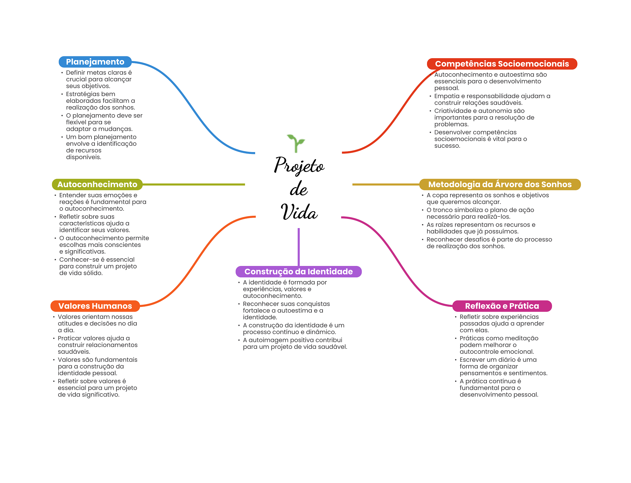 Planejamento Competências Socioemocionais Definir metas claras é Autoconhecimento e autoestima são crucial para alcançar essenciais para desenvolvimento seus objetivos. pessoal. Estratégias bem Empatia e responsabilidade ajudam a elaboradas facilitam a construir relações saudáveis. realização dos sonhos. Criatividade e autonomia são planejamento deve ser importantes para a resolução de flexível para se problemas. adaptar a mudanças. Desenvolver competências Um bom planejamento é vital para envolve a identificação sucesso. de recursos disponíveis. Projeto Autoconhecimento de Metodologia da Árvore dos Sonhos Entender suas emoções e A copa representa sonhos e objetivos reações é fundamental para que queremos alcançar. autoconhecimento. Refletir sobre suas Vida tronco simboliza plano de ação necessário para realizá-los. características ajuda a As raízes representam recursos e identificar seus valores. habilidades que já possuímos. autoconhecimento permite Reconhecer desafios é parte do processo escolhas mais conscientes de realização dos sonhos. e significativas. Conhecer-se é essencial para construir um projeto de vida sólido. Construção da Identidade A identidade é formada por experiências, valores e autoconhecimento. Valores Humanos Reconhecer suas conquistas Reflexão e Prática fortalece a autoestima e a Valores orientam nossas identidade. Refletir sobre experiências atitudes e decisões no dia A construção da identidade é um passadas ajuda a aprender a dia. processo contínuo e dinâmico. com elas. Praticar valores ajuda a A autoimagem positiva contribui Práticas como meditação construir relacionamentos para um projeto de vida saudável. podem melhorar saudáveis. autocontrole emocional. Valores são fundamentais Escrever um diário é uma para a construção da forma de organizar identidade pessoal. pensamentos e sentimentos. Refletir sobre valores é A prática contínua é essencial para um projeto fundamental para de vida significativo. desenvolvimento pessoal.