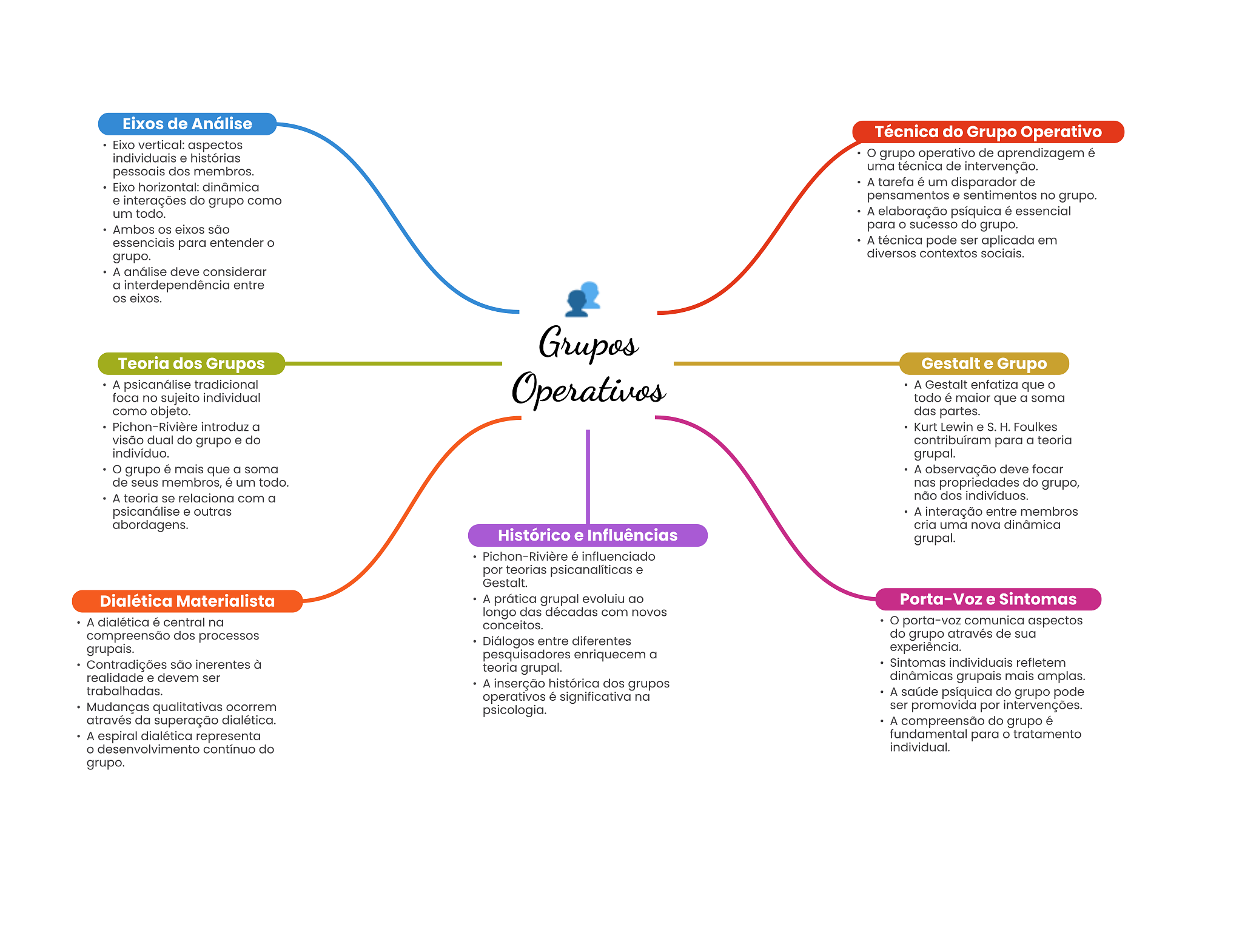 Eixos de Análise Técnica do Grupo Operativo Eixo vertical: aspectos individuais e histórias O grupo operativo de aprendizagem é pessoais dos membros. uma técnica de intervenção. Eixo horizontal: dinâmica A tarefa é um disparador de e interações do grupo como pensamentos e sentimentos no grupo. um todo. A elaboração psíquica é essencial Ambos eixos são para O sucesso do grupo. essenciais para entender O A técnica pode ser aplicada em grupo. diversos contextos sociais. A análise deve considerar a interdependência entre OS eixos. Grupos Teoria dos Grupos Gestalt e Grupo A psicanálise tradicional Operativos A Gestalt enfatiza que foca no sujeito individual todo é maior que a soma como objeto. das partes. Pichon-Rivière introduz a Kurt Lewin e S.H. Foulkes visão dual do grupo e do contribuíram para a teoria indivíduo. grupal. grupo é mais que a soma A observação deve focar de seus membros, é um todo. nas propriedades do grupo, A teoria se relaciona com a não dos indivíduos. psicanálise e outras A interação entre membros abordagens. cria uma nova dinâmica Histórico e Influências grupal. Pichon-Rivière é influenciado por teorias psicanalíticas e Gestalt. Dialética Materialista A prática grupal evoluiu ao Porta-Voz e Sintomas longo das décadas com novos A dialética é central na conceitos. O porta-voz comunica aspectos compreensão dos processos do grupo através de sua Diálogos entre diferentes grupais. experiência. pesquisadores enriquecem a Contradições são inerentes à teoria grupal. Sintomas individuais refletem realidade e devem ser dinâmicas grupais mais amplas. trabalhadas. A inserção histórica dos grupos operativos é significativa na A saúde psíquica do grupo pode Mudanças qualitativas ocorrem psicologia. ser promovida por intervenções. através da superação dialética. A compreensão do grupo é A espiral dialética representa fundamental para tratamento desenvolvimento contínuo do individual. grupo.