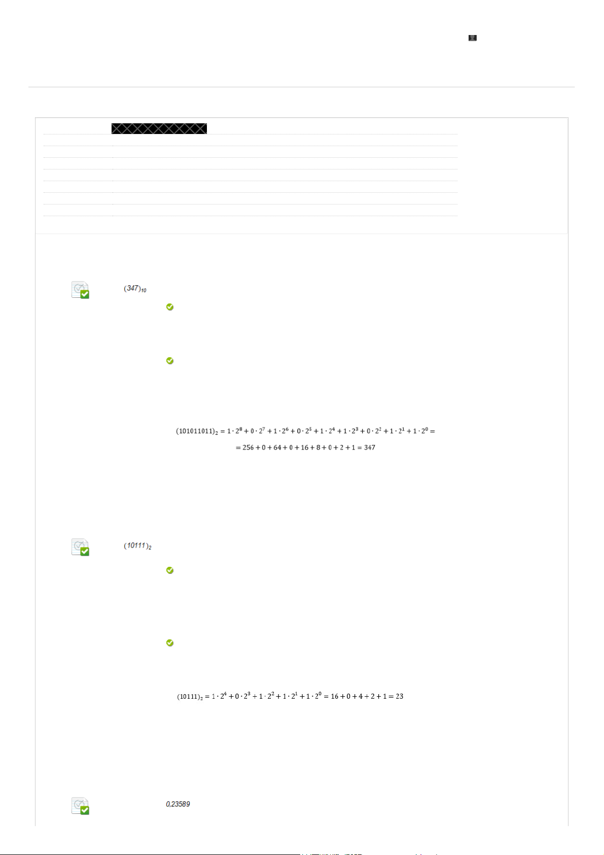 Revisar envio do teste: QUESTIONÁRIO UNIDADE ICÁLCULO NUMÉRICO COMPUTACIONAL 7941-30_43701_R_E1_20252 CONTEÚDO Usuário Curso CÁLCULO NUMÉRICO COMPUTACIONAL Teste QUESTIONÁRIO UNIDADE I Iniciado 03/10/25 20:25 Enviado 03/10/25 20:27 Status Completada Resultado da tentativa 5 em 5 pontos Tempo decorrido 2 minutos Resultados exibidos Todas as respostas, Respostas enviadas, Respostas corretas, Comentários, Perguntas respondidas incorretamente Pergunta 1 Resposta Selecionada: c. Respostas: a. b. c. d. e. Comentário da resposta: O número representado na base 2 é igual a: (101011011)2 (111111111)2 (100000001)2 (101011011)2 (011111110)2 (000000001)2 Resposta: C Comentário: Basta observar que: Pergunta 2 Resposta Selecionada: d. Respostas: a. b. c. d. e. Comentário da resposta: O número representado na base 10 é igual a: (23)10 (32)10 (35)10 (27)10 (23)10 (64)10 Resposta: D Comentário: Basta observar que: Pergunta 3 Aproximando o número utilizando o truncamento e duas casas decimais, obtemos a resposta: UNIP EAD BIBLIOTECAS MURAL DO ALUNO TUTORIAIS LABORATÓRIOS JULIO MELO 4 CONTEÚDOS ACADÊMICOS 0,5 em 0,5 pontos 0,5 em 0,5 pontos 0,5 em 0,5 pontos 03/10/2025, 20:27 Revisar envio do teste: QUESTIONÁRIO UNIDADE I – CÁLCULO... https://ava.ead.unip.br/webapps/assessment/review/review.jsp?attempt_id=_116136518_1&course_id=_415352_1&content_id=_4630306_1&return_content=1… 1/4 http://company.blackboard.com/ https://ava.ead.unip.br/webapps/blackboard/execute/courseMain?course_id=_415352_1 https://ava.ead.unip.br/webapps/blackboard/content/listContent.jsp?course_id=_415352_1&content_id=_4628720_1&mode=reset https://ava.ead.unip.br/webapps/portal/execute/tabs/tabAction?tab_tab_group_id=_10_1 https://ava.ead.unip.br/webapps/portal/execute/tabs/tabAction?tab_tab_group_id=_27_1 https://ava.ead.unip.br/webapps/portal/execute/tabs/tabAction?tab_tab_group_id=_47_1 https://ava.ead.unip.br/webapps/portal/execute/tabs/tabAction?tab_tab_group_id=_29_1 https://ava.ead.unip.br/webapps/portal/execute/tabs/tabAction?tab_tab_group_id=_64_1 https://ava.ead.unip.br/webapps/portal/execute/tabs/tabAction?tab_tab_group_id=_25_1 https://ava.ead.unip.br/webapps/login/?action=logout Resposta Selecionada: c. Respostas: a. b. c. d. e. Comentário da resposta: 0,23. 0,21. 0,22. 0,23. 0,24. 0,25. Resposta: C Comentário: No truncamento basta eliminarmos as casas decimais indesejadas. Pergunta 4 Resposta Selecionada: e. Respostas: a. b. c. d. e. Comentário da resposta: Aproximando o número utilizando o arredondamento e três casas decimais obtemos a resposta: 0,236. 0,232. 0,233. 0,235. 0,231. 0,236. Resposta: E Comentário: No arredondamento, como o último algarismo a ser eliminado é igual a 8, devemos somar 1 ao algarismo anterior obtendo as casas decimais indesejadas. Pergunta 5 Resposta Selecionada: c. Respostas: a. b. c. d. e. Comentário da resposta: Segundo o Teorema de Bolzano, a função possui uma raiz no intervalo: [-1, 0]. [-4, -3]. [-2, -1]. [-1, 0]. [1, 2]. A função não possui raízes reais. Resposta: C Comentário: Basta calcularmos o valor da função nos extremos do intervalo: Como a função muda de sinal no intervalo [-1, 0], este intervalo deve conter pelo menos uma raiz da função. Pergunta 6 0,5 em 0,5 pontos 0,5 em 0,5 pontos 0,5 em 0,5 pontos 03/10/2025, 20:27 Revisar envio do teste: QUESTIONÁRIO UNIDADE I – CÁLCULO... https://ava.ead.unip.br/webapps/assessment/review/review.jsp?attempt_id=_116136518_1&course_id=_415352_1&content_id=_4630306_1&return_content=1… 2/4 Resposta Selecionada: d. Respostas: a. b. c. d. e. Comentário da resposta: Considere a função representada pelo gráfico a seguir. Segundo o gráfico anterior, a função representada possui como raízes os pontos: x = 2 e x = 3. x = 6 e x = -1. x = 0 e x = 1 x = 1 e x = 2. x = 2 e x = 3. x = 4 e x = 6. Resposta: D Comentário: Basta observar que o gráfico da função intercepta o eixo x nos pontos x = 2 e x = 3. Pergunta 7 Resposta Selecionada: b. Respostas: a. b. c. d. e. Comentário da resposta: Segundo o gráfico a seguir, quais os intervalos que contêm as raízes da função representada por ele? [-3, -2]; [-1, 0] e [0, 1]. [-6, -5]; [-5, -4] e [1,2] [-3, -2]; [-1, 0] e [0, 1]. [-5, -4]; [-2, -1] e [1,2] [6, 5]; [5, 4] e [-2, -1]. A função não possui raízes reais. Resposta: B Comentário: Basta observar que o gráfico da função intercepta o eixo x em pontos pertencentes aos intervalos [-3, -2]; [-1, 0] e [0, 1]. Pergunta 8 Resposta Selecionada: e. Respostas: a. b. Segundo o Teorema de Gauss, a função tem como possíveis raízes inteiras o seguinte conjunto de valores : 0,5 em 0,5 pontos 0,5 em 0,5 pontos 03/10/2025, 20:27 Revisar envio do teste: QUESTIONÁRIO UNIDADE I – CÁLCULO... https://ava.ead.unip.br/webapps/assessment/review/review.jsp?attempt_id=_116136518_1&course_id=_415352_1&content_id=_4630306_1&return_content=1… 3/4 Sexta-feira, 3 de Outubro de 2025 20h27min17s GMT-03:00 c. d. e. Comentário da resposta: Resposta: E Comentário: Basta observar que nos divisores de 20, o termo independente do polinômio que define a função f(x) é igual aos valores Pergunta 9 Resposta Selecionada: c. Respostas: a. b. c. d. e. Comentário da resposta: Sabendo que e utilizando o Método da Dicotomia, após a primeira iteração, o intervalo obtido pela bissecção do intervalo [1, 2] na justificativa do cálculo aproximado de é: Resposta: C Comentário: Note que pertence ao intervalo [1, 2]. Ao iniciarmos o método da Dicotomia, o intervalo [1, 2] é dividido em dois outros intervalos, a saber, e . Como segue que o intervalo considerado pelo método da Dicotomia é . Pergunta 10 Resposta Selecionada: c. Respostas: a. b. c. d. e. Comentário da resposta: Considere a função e sua derivada . Sabendo que a função de Newton-Raphson é dada por , após os cálculos necessários obteremos a seguinte função : Resposta: C Comentário: Efetuando os cálculos: ← OK 0,5 em 0,5 pontos 0,5 em 0,5 