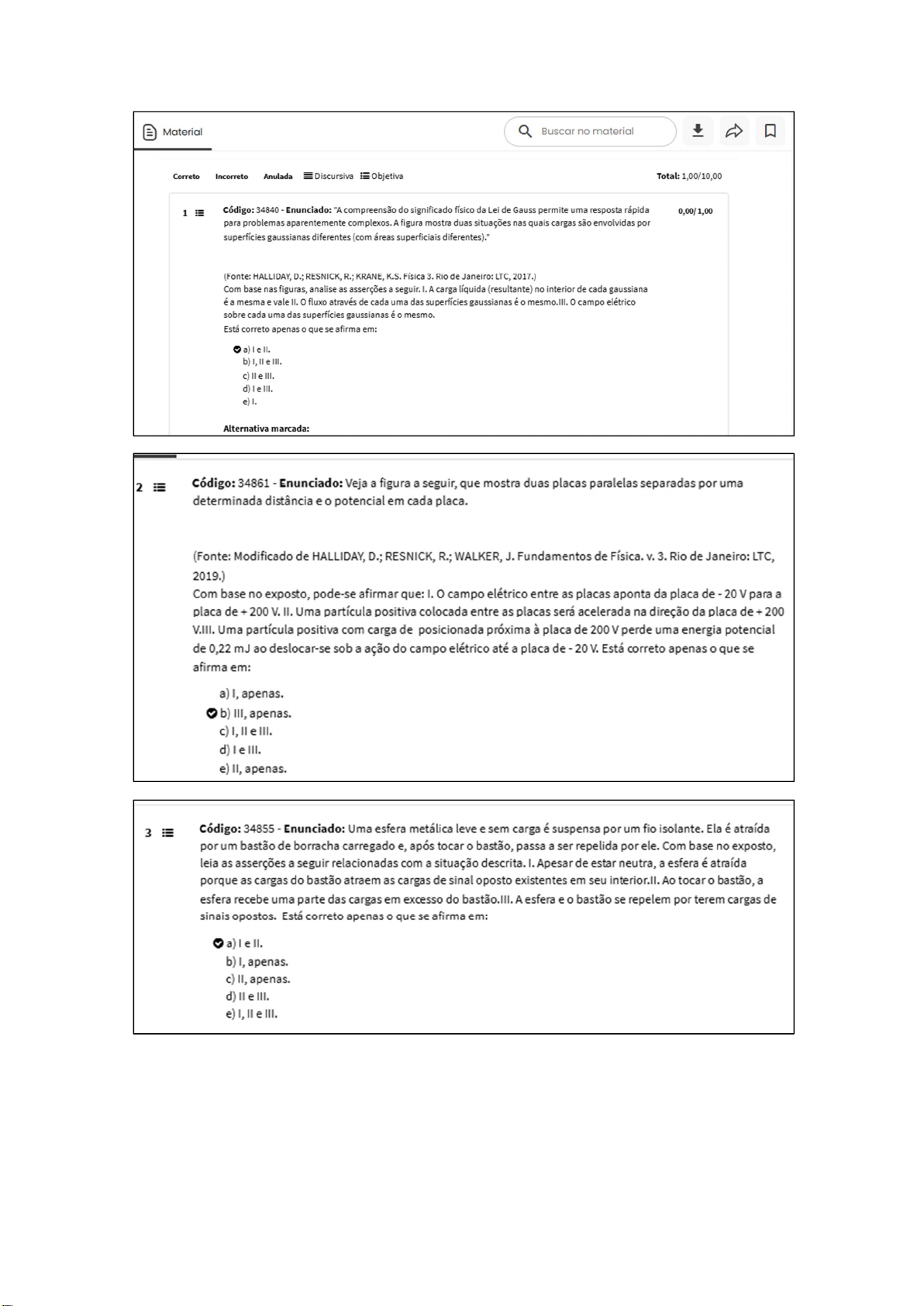 Material Buscar no material Correto Incorreto Anulada Discursiva Objetiva Total: 1,00/10,00 1 iii Código: 34840 Enunciado: "A compreensão do significado físico da Lei de Gauss permite uma resposta rápida 0,00/1,00 para problemas aparentemente complexos. A figura mostra duas situações nas quais cargas são envolvidas por superfícies gaussianas diferentes (com áreas superficiais diferentes)." (Fonte: HALLIDAY, D.; RESNICK, R.; KRANE, K.S. Física 3. Rio de Janeiro: LTC, 2017.) Com base nas figuras, analise as asserções a seguir. I.A carga líquida (resultante) no interior de cada gaussiana é a mesma e vale II. o fluxo através de cada uma das superfícies gaussianas é o campo elétrico sobre cada uma das superfícies gaussianas éo mesmo. Está correto apenas que se afirma em: a) II. b) III. c) III. d) III. e) Alternativa marcada: 2 Código: 34861 Enunciado: Veja a figura a seguir, que mostra duas placas paralelas separadas por uma determinada distância e o potencial em cada placa. (Fonte: Modificado de HALLIDAY, D.; RESNICK, R.; WALKER, J. Fundamentos de Física. v.3. Rio de Janeiro: LTC, 2019.) Com base no exposto, pode-se afirmar que: I. campo elétrico entre as placas aponta da placa de 20 V para a placa de 200 V. II. Uma partícula positiva colocada entre as placas será acelerada na direção da placa de 200 V.III. Uma partícula positiva com carga de posicionada próxima à placa de 200 V perde uma energia potencial de 0,22 mJ ao deslocar-se sob a ação do campo elétrico até a placa de 20 V. Está correto apenas o que se afirma em: a) I, apenas. b) III, apenas. c) I, e III. d) III. e) II, apenas. 3 Código: 34855 Enunciado: Uma esfera metálica leve e sem carga é suspensa por um fio isolante. Ela é atraída por um bastão de borracha carregado e, após tocar bastão, passa a ser repelida por ele. Com base no exposto, leia as asserções a seguir relacionadas com a situação descrita. I. Apesar de estar neutra, a esfera é atraída porque as cargas do bastão atraem as cargas de sinal oposto existentes em seu Ao tocar bastão, a esfera recebe uma parte das cargas em excesso do bastão.III. A esfera e bastão se repelem por terem cargas de sinais opostos. Está correto apenas que se afirma em: a) II. b) I, apenas. c) II, apenas. d) e III. e) I, II e III.4 Código: 34858 Enunciado: As figuras a seguir mostram quatro configurações nas quais cinco partículas carregadas estão posicionadas ao longo de uma linha reta com um espaçamento uniforme entre elas. valor de cada carga está indicado, com exceção da carga central, que é positiva e tem o mesmo valor para as quatro configurações. Lembrando que o módulo da força eletrostática entre duas partículas carregadas, dado pela Lei de Coulomb, é e indica a força resultante na configuração (Fonte: HALLIDAY, D.; RESNICK, R.; WALKER, J. Fundamentos de Física. v.3. Rio de Janeiro: LTC, 2019.) Diante disso, marque a alternativa que expressa corretamente a relação entre as intensidades das forças resultantes sobre a carga central nas quatro configurações. 5 Código: 34860 Enunciado: A figura a seguir mostra uma barra de plástico com carga negativa. objetivo é determinar o campo elétrico gerado pela barra no ponto P. (Fonte: Modificado de HALLIDAY, D.; RESNICK, R.; WALKER, J. Fundamentos de Física. v.3. Rio de Janeiro: LTC, 2019.) Com base no exposto, analise as asserções a seguir relacionadas com o procedimento para cálculo do campo.l. A barra pode ser dividida em pequenos elementos de carga e campo gerado por ela no ponto P pode ser calculado a partir do campo gerado por cada o campo gerado por cada elemento pode ser escrito utilizando-se a Lei de Coulomb, o campo total no ponto P é calculado a partir da soma escalar das contribuições de cada elemento. Está correto apenas o que se afirma em: a) I, III. b) II. c) e II. d) e) III. 3 de 4 6 Código: 34847 Enunciado: Uma bateria é um dispositivo que armazena energia eletroquímica. Ao ser conectada a um circuito, como na figura, a bateria (B) irá produzir uma diferença de potencial específica entre os condutores (a e b) anexados aos terminais do dispositivo. (Fonte: Modificado de HALLIDAY, D.; RESNICK, R.; WALKER, J. Fundamentos de Física. 3. Rio de Janeiro: LTC, 2019.) Considerando uma bateria de 12 V e uma separação entre as placas de 0,30 cm, marque a alternativa que apresenta corretamente a intensidade do campo elétrico gerado entre as placas e sua orientação. a) 4 kV/m, apontando da placa a para a placa b. b) 4 kV/m, apontando da placa b para a placa a. c) 40 V/m, apontando da placa a para a placa b. d) campo é nulo. e) 40 V/m, apontando da placa b para a placa a. 7 Código: 35055 Enunciado: A figura a seguir mostra quatro cargas que ocupam os vértices de um quadrado. Sabendo que e, desenhe vetor que representa a força resultante exercida pelas quatro cargas sobre uma carga de prova 3 positiva, colocada no centro do quadrado. Resposta: Justificativa: Expectativa de resposta: Como as cargas localizadas nos vértices têm módulos iguais, as forças exercidas pelas cargas 2 e 3 se anulam, enquanto as forças exercidas pelas cargas 1 e 4 se somam. Logo:1 Código: 34851 Enunciado: Condutores elétricos são materiais nos quais a carga elétrica pode se 1,00/1,00 mover livremente, que não ocorre nos materiais isolantes. Considere então duas esferas sólidas, ambas de raio R, as quais têm a mesma carga total Q. Uma esfera é de material condutor, enquanto a outra é de material isolante. Considere que a carga na esfera isolante está uniformemente distribuída por todo seu volume e que as duas esferas estão em equilíbrio eletrostático. Com base nessas informações, leia as afirmativas a seguir.l. Na esfera condutora, a carga se distribui uniformemente pela superfície externa da esfera e, portanto, a carga em seu interior é zero.ll. campo elétrico é nulo no interior das duas esferas.III. Para a esfera condutora, as linhas de camp