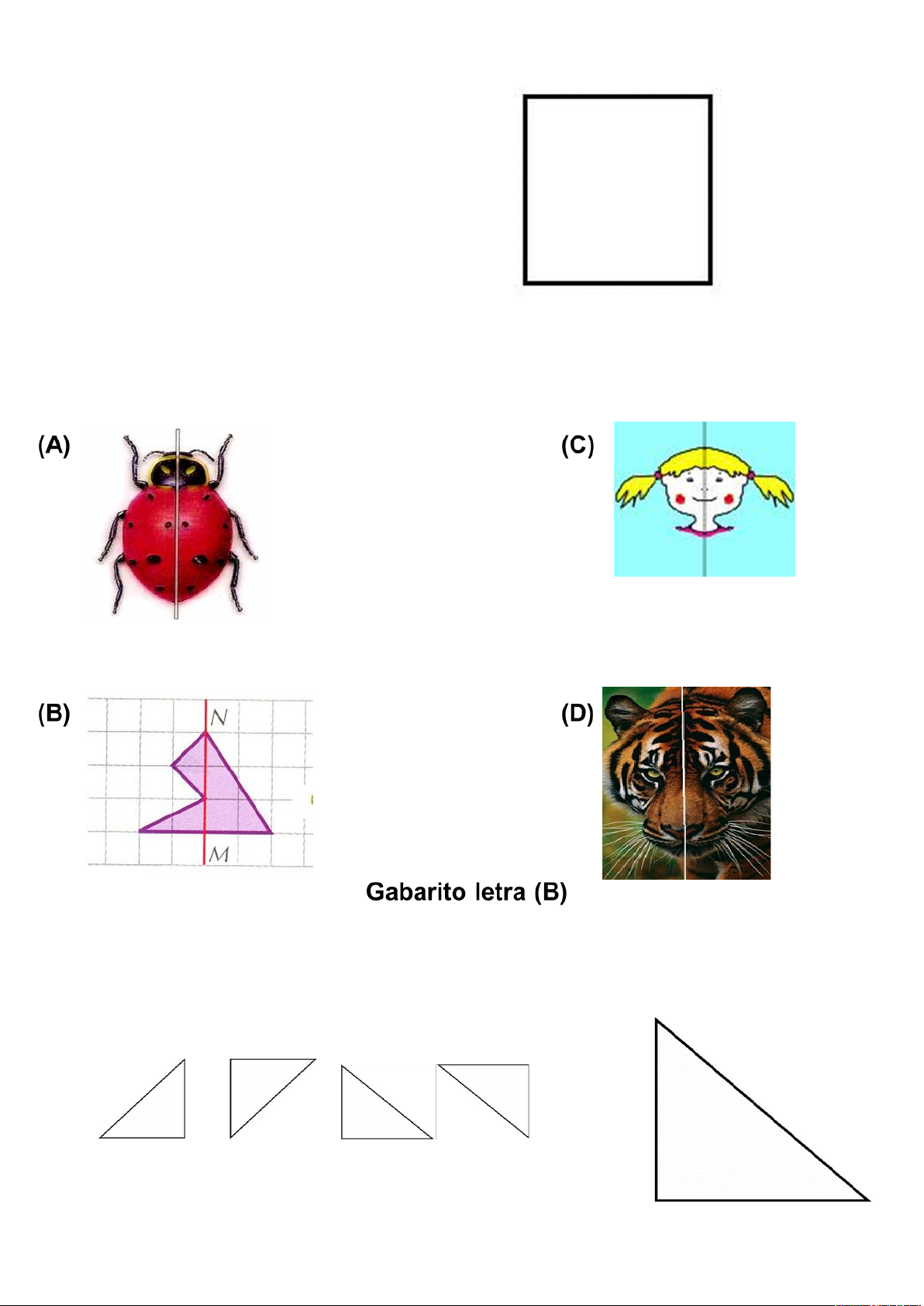 Simetria Questão 1 Observe a figura. Quantos eixos de simetria possui? (A) Dois (B) Infinito (C) Nenhum (D) Quatro GABARITO: Letra (D) Questão 2 Assinale a alternativa que NÃO mostra a simetria da figura. Questão 3 Qual destas imagens corresponde à imagem do triângulo [XYZ] depois de rodar 90º à volta de x, no sentido contrário ao dos ponteiros do relógio? Y (A) 1 (B) 2 (C) 3 (D) 4 (1) (2) (3) (4) GABARITO: Letra (A) X Z Questão 4 Alguns pontos turísticos mais visitados no mundo foram construídos pelo homem. Uns mais antigos e conservados até hoje e outros criados mais recentemente. Observe as fotos abaixo. Quais são assimétricas? (1) (2) (3) (4) (A) 1 (B) 2 (C) 3 (D) 4 Gabarito letra (B) Questão 5 Dois amigos resolveram participar de uma corrida de bicicleta e tiraram várias fotos. Observe uma das fotos e responda quantos eixos de simetria possui um pneu de bicicleta. (A) Cem (B) Dois (C) Infinitos (D) Oito Gabarito letra (C) Questão 6 Numa escola, os alunos deram uma sugestão para decorar a sala de leitura com pisos coloridos usando o modelo da foto ao lado. Que tipo de simetria você pode observar nos pisos? A) Reflexão com deslizamento B) Reflexão C) Rotação D) Translação Gabarito letra (B) Questão 7 Alguns artistas utilizam as figuras geométricas para criarem suas obras, como exemplo temos a Torre Eiffel, em Paris que lembra um triângulo gigante. Nas figuras planas abaixo, qual é a relação entre o número de lados e o número de simetrias? A) O número de lados é a metade do número de simetrias. B) O número de lados é o mesmo número de simetrias. C) O número de lados é diferente do número de simetrias. D) O número de lados é o dobro do número de simetrias. Gabarito letra (B) Questão 8 Em filmes ou desenhos antigos encontrávamos moinhos que realizavam o trabalho de moer grãos ou bombear águas, usando a energia dos ventos. Nos moinhos atuais as hélices são usadas como elemento de captação e conversão da energia eólica em energia elétrica. Que tipo de simetria é encontrada nos movimentos das hélices? (A) Reflexão (B) Rotação (C) Reflexão com deslizamento (D)Translação Gabarito letra B Questão 9 O medidor de energia elétrica de uma residência, conhecido por "relógio de luz" é constituído de quatro pequenos relógios, cujos sentidos de rotação estão indicados conforme a figura: Traçando o eixo de simetria na vertical em cada relógio, quais pares de relógios são simétricos? Descarte os ponteiros. (A) 1º e 3º relógios, 2º e 4º relógios (B) 2º e 3º relógios, 1º e 4º relógios (C) 3º e 4º relógios, 1º e 2º relógios (D) 1º e 3º relógios, 1º e 4º relógios Gabarito letra A Questão 10 Cada grupo de alimentos fornece alguns nutrientes, mas não todos os que o organismo necessita; nenhum grupo é mais importante do que o outro. Para o bom funcionamento do corpo é necessário que os alimentos de todos os grupos façam parte do seu plano alimentar. A Pirâmide alimentar lembra uma figura plana. Traçando os eixos de simetria desta figura conseguimos, consequentemente, obter uma: (A) Assimetria (B) Bissetriz interna (C) Circunferência (D) Rotação Gabarito letra (B) Questão 11 Atualmente, os estudiosos vem afirmando que caminhar é uma atividade física muito benéfica para a saúde. A caminhada pode proporcionar a redução da pressão sanguínea; redução do stress; melhor circulação do sangue; aumento do tônus muscular; melhoria da postura; dentre outros. A foto ao lado mostra uma caminhada na areia. Analisando a foto, diga que tipo de isometria é realizada nesta caminhada. (A) Rotação (B) Reflexão (C) Reflexão com deslizamento (D) Translação Gabarito letra (C) Questão 12 Para uma atividade realizada no laboratório de Artes, a turma dividida em grupos precisa construir um cartaz do Cristo Redentor e expor no dia do aniversário da cidade do Rio de Janeiro. Observando as figuras, quais são os tipos de isometrias apresentadas? (A) Reflexão e Translação (B) Reflexão com deslocamento (C) Rotação e Reflexão (D) Translação e Rotação Gabarito letra C image6.png image7.png image8.png image9.png image10.png image11.png image12.png image13.png image14.png image15.png image1.png image2.png image3.png image4.png image5.png