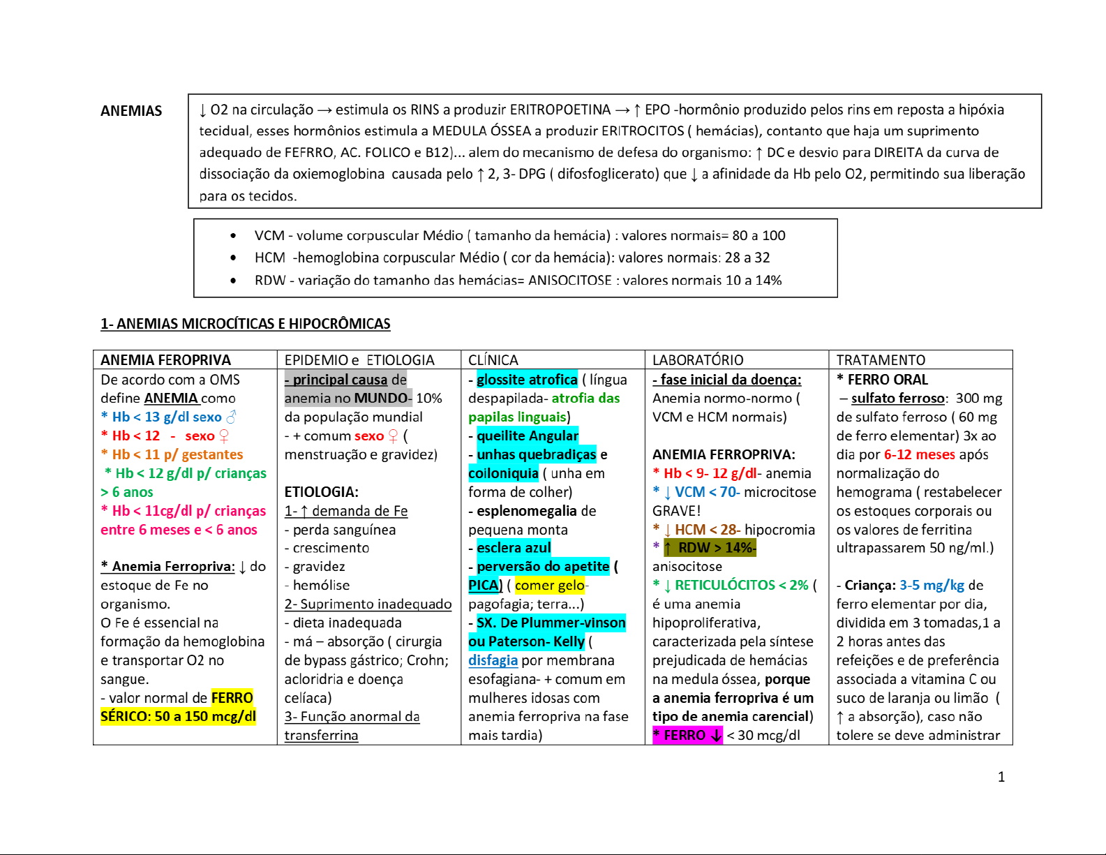 ANEMIAS 02 na circulação estimula os RINS a produzir ERITROPOETINA EPO -hormônio produzido pelos rins em reposta a hipóxia tecidual, esses hormônios estimula a MEDULA ÓSSEA a produzir ERITROCITOS ( hemácias), contanto que haja um suprimento adequado de FEFRRO, AC. FOLICO e B12)... alem do mecanismo de defesa do organismo: T DC e desvio para DIREITA da curva de dissociação da oxiemoglobina causada pelo 2, 3- DPG ( difosfoglicerato) que a afinidade da Hb pelo permitindo sua liberação para os tecidos. VCM volume corpuscular Médio ( tamanho da hemácia) : valores normais= 80 a 100 HCM -hemoglobina corpuscular Médio ( cor da hemácia): valores normais: 28 a 32 RDW variação do tamanho das hemácias= ANISOCITOSE : valores normais 10 a 14% 1- ANEMIAS MICROCÍTICAS E HIPOCRÔMICAS ANEMIA FEROPRIVA EPIDEMIO e ETIOLOGIA CLÍNICA LABORATÓRIO TRATAMENTO De acordo com a OMS principal causa de glossite atrofica ( língua fase inicial da doença: * FERRO ORAL define ANEMIA como anemia no 10% despapilada- atrofia das Anemia normo-normo ( sulfato ferroso: 300 mg * Hb 6 anos ETIOLOGIA: forma de colher) * VCM 14% ultrapassarem 50 ng/ml.) * Anemia Ferropriva: do gravidez perversão do apetite anisocitose estoque de Fe no hemólise PICA) ( comer gelo- * RETICULÓCITOSa principal fonte de Fe OBS: acloridria ou anorexia, irritabilidade * FERRITINA 50 anos: funciona com reguladora * saturação da 48-72 hrs e atinge seu pico reserva de ferro) como sempre que tiver anemia da homeostase de ferro no transferrina 5-7 dias. forma de FERRITINA ou ferropriva tem que organismo, tem 2 ações: * da capacidade total de a hemoglobina aumenta HEMOSIDERINA. investigar CANCER DE a absorção de Fe no ligação ao ferro TIBIC) dentro de 4-30 dias e CÓLON, fazer intestino e a liberação de 360 normaliza em 6 semanas. Fe é absorvido no COLONOSCOPIA. ferro do sistema * protoporfirina melhora dos sintomas na intestino delgado e é + reticuloendotelial As semana fadiga..) facilmente absorvido na * crianças: CRESCIMENTO situações que estimula a ESFREGAÇO DO SANGE forma de FERRO FERROSO. a demanda de ferro). A síntese de Hepcidina e PERIFÉRICO OBS: o exame de escolha a enzima ferro-redutase principal causa de anemia portanto a * HIPOCROMIA HCM) para avaliar a resposta transforma ferro férrico ferropriva em crianças é disponibilidade do Fe, são: * MICROCITOSE VCM) PRECOCE ao tratamento é em ferro ferroso. por INGESTÃO inflamação ( anemia de * ANISOCITOSE RDW) CONTAGEM DE INADEQUADA DE FERRO. doença crônica) e * POIQUILOCITOSE ( Molécula responsável sobrecarga de Fe. hemácias em forma de por transportar o Fe no charuto, lápis ou alvo) * FERRO PARENTERAL plasma= transferrina. Indicações: QUANDO REPOSIÇÃO PADRÃO-OURO: intolerância oral ORAL NÃO SURTE EFEITO- aspirado da medula óssea incapacidade de atender OBS: conteúdo de Ferro refratário ao tratamento = mostra a ausência de as necessidades de ferro do leito humano é oral: ferro nos macrófagos e oral absorvido de 2 a 3 vezes - anemia multifatorial eritroblastos. hemodiálise mais em comparação com má adesão ao sangramento GI leite de vaca. tratamento persistente sangramento crônico Calculo para reposição: não absorção de ferro ( Peso corporal (Kg) X 2,3 X doença celíaca; infecção 15- hemoglobina sérica por H.PYLORI e gastrite em g/dl) + 500 atrófica.) 2ANEMIA DE DÇA CRÔNICA EPIDEMIOLOGIA LABORATÓRIO TRATAMENTO ANEMIA INFLAMATÓRIA- causa + COMUM de A # entre anemia - níveis moderados de Hb ( OBS: MELHOR exame Secundaria a ativação anemia. ferropriva e anemia de raro 80 ou Artrite reumatoide e já na anemia crônica a levemente MICRO. TTO: se trata a doença de - LES Ela é causada por distúrbio FERRITINA esta normal ou FERRO NL ou base. -Sarcoidose na homeostase do ferro, mas as capacidades de FERRITINA NL doença inflamatória caracterizada por estimulo ligação com ferro e a RDW NORMAL intestinal à produção de HEPCIDINA, quantidade dos receptores RETICULOCITOS ( TBC / empiema/ que leva ao de transferrina estão anemia hipoproliferativa) abscesso/ pneumonia "aprisionamento" do ferro TIBIC normal ou ( endocardite infecciosa nos macrófagos do OBS: a liberação de que diferencia da anemia meningite sistema reticuloendotelial, citocinas inflamatórias ferropriva) - HIV e como isso, os estoques estimula a produção de Índice de SATURAÇÃO qualquer doença de ferro ( FERRITINA 1) e Hepcidina. DA TRANSFERRINA crônica!!! da disponibilidade de Fe ( PCR ou VHS FERRO CLINICA: Evidencia clinica ou laboratorial de inflamação. TALASSEMIAS FISIOPATOLOGIA CLINICA LABORATÓRIO e TTo Diminuição da síntese da 1- alfatalassemia da Betatalassemia: Betatalassemia: produção de cadeias α) * TALASSEMIA MAJOR: anemia HIPO-MICRO VCMsudoeste da Ásia e África produz nada ou produz superior com separação do dentes- "fascie - - Saturação de transferrina muito pouco. talassêmico" ou fascie de esquilo.) normal ou HEMOGLOBINA: TALASSEMIA litíase biliar pela hemólise crônica T BI; LDH globina INTERMEDIA hepatoesplenomegalia ESFREGAÇO DO SANGUE I + : produz pouco comprometimento do desenvolvimento, PERIFÉRICO globina HEME globina TALASSEMIA MINOR fertilidade e disfunção endócrina. - anisopoiquilocitose I ou : produz RX de crâneo "HAIR-ON-END" - HEMÁCIAS em ALVO Globina um pouco abaixo do * TALASSEMIA INTERMEDIA: HIPOCROMIA HCM e CHCM) * no adulto normal a normal. geralmente se manifesta na adolescência. PONTILHADO BASÓFILO molécula de hemoglobina OBS: pessoa crescimento, desenvolvimento, fertilidade RDW é formada por 4 cadeias NORMAL. preservado. de globinas: clinica + branda * PADRÃO-OURO: -97% de hemoglobina a quantidade de Hb A * TALASSEMIA MINOR: ELETROFORESE DE Hb ou A1( a hemoglobina em cada hemácia- que assintomática ou anemia leve ( hipo- micro)- Níveis aumentados de Hb A2 e F possui 2 cadeias a e 2 leva a hemácia micro/ costuma exacerbar na gravidez. e níveis baixos ou ausentes de 2% de hemoglo