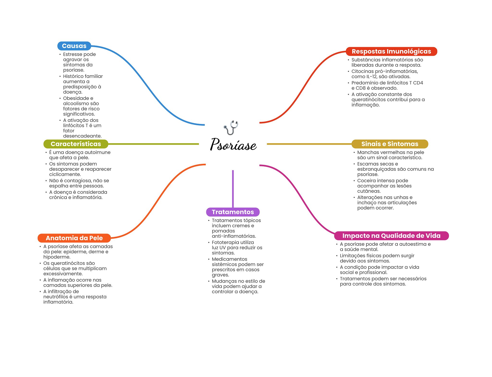 Causas Estresse pode Respostas Imunológicas agravar Substâncias inflamatórias são sintomas da liberadas durante a resposta. psoríase. Citocinas pró-inflamatórias, Histórico familiar como IL-12, são ativadas. aumenta a Predomínio de linfócitos T CD4 predisposição à e CD8 é observado. doença. A ativação constante dos Obesidade e queratinócitos contribui para a alcoolismo são inflamação. fatores de risco significativos. A ativação dos linfócitos T é um fator desencadeante. Características Sinais e Sintomas É uma doença autoimune Manchas vermelhas na pele que afeta a pele. são um sinal característico. Os sintomas podem Escamas secas e desaparecer e reaparecer esbranquiçadas são comuns na ciclicamente. psoríase. Não é contagiosa, não se Coceira intensa pode espalha entre pessoas. acompanhar as lesões A doença é considerada cutâneas. crônica e inflamatória. Alterações nas unhas e inchaço nas articulações podem ocorrer. Tratamentos Tratamentos tópicos incluem cremes e pomadas Anatomia da Pele anti-inflamatórias. Impacto na Qualidade de Vida Fototerapia utiliza A psoríase afeta as camadas A psoríase pode afetar a autoestima e luz UV para reduzir a saúde mental. da pele: epiderme, derme e sintomas. hipoderme. Limitações físicas podem surgir Medicamentos devido aos sintomas. Os queratinócitos são sistêmicos podem ser células que se multiplicam prescritos em casos A condição pode impactar a vida excessivamente. social e profissional. graves. A inflamação ocorre nas Mudanças no estilo de Tratamentos podem ser necessários camadas superiores da pele. vida podem ajudar a para controle dos sintomas. A infiltração de controlar a doença. neutrófilos é uma resposta inflamatória.