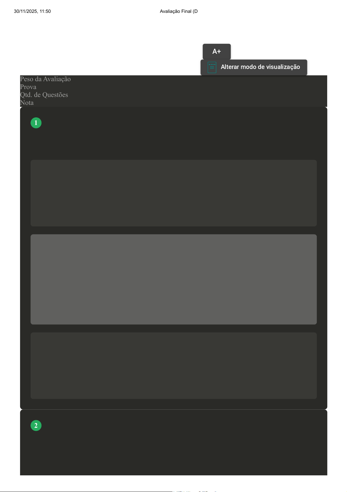 Prova Impressa GABARITO | Avaliação Final (Discursiva) - Individual (Cod.:772286) Peso da Avaliação 4,00 Prova 58557912 Qtd. de Questões 2 Nota 9,50 Nas práticas do laboratório virtual, um dos experimentos aborda as técnicas de medições de massa e volume de líquidos. O experimento demonstra o uso das principais vidrarias e acessórios utilizados em laboratórios de química geral. Com base no sumário teórico, roteiro da prática e na condução do experimento no laboratório virtual, defina a propriedade da densidade (massa específica) e descreva para que ela é utilizada no laboratório. Resposta esperada A densidade relaciona a massa de certo material ao volume que ele ocupa. Esta propriedade é definida justamente pela razão entre massa e volume (densidade = m/V). Como a densidade é uma propriedade característica do material, pode ser utilizada para identificar uma substância no laboratório. Minha resposta A densidade relaciona a massa de um certo material ao volume que ele ocupa, sendo definida essa propriedade pela razão entre massa e volume (densidade = m/v). Esse experimento é utilizado para demonstrar as diferenças entre componentes com densidades distintas. Ao formar uma mistura heterogênea, que ao ser condicionada em um recipiente e mantida em repouso, a fase mais densa no caso ( água) irá decantar no fundo do recipiente devido a ação da gravidade, com isso é possível a remoção da água , deve-se ser tomado o cuidado no momento da remoção para não ocorrer novamente a mistura. sendo essa a utilização em laboratório. Retorno da correção Parabéns, acadêmico(a)! Sua resposta atingiu os objetivos da questão e você atingiu o esperado, demonstrando a competência da análise e síntese do assunto abordado, apresentando excelentes argumentos próprios, com base nos materiais disponibilizados. Confira no quadro "Resposta esperada" a sugestão de resposta para esta questão. Nas práticas do laboratório virtual, um dos experimentos aborda o processo de separação por decantação que permite separar componentes que compõem duas ou mais fases de uma mistura heterogênea. Este método é comumente utilizado em misturas bifásicas, como líquido-líquido, sólido- líquido e sólido-gás. Neste experimento, é possível identificar e utilizar vidrarias específicas do processo de decantação, reconhecer misturas com duas fases além de descrever o processo de separação por decantação. Com base no sumário teórico, roteiro e condução deste experimento, VOLTAR A+ Alterar modo de visualização 1 2 30/11/2025, 11:50 Avaliação Final (Discursiva) - Individual about:blank 1/2 explique como uma mistura de água (fase mais densa) e óleo (fase menos densa) é separada pelo processo de decantação. Resposta esperada Os fenômenos envolvidos neste processo estão baseados nas diferenças de densidade dos componentes (água e óleo) que formam a mistura heterogênea que, ao serem condicionados em um recipiente com superfície estável e em repouso, a fase mais densa (água) irá decantar no fundo do recipiente por ação da gravidade. Assim, após a decantação, pode-se remover a fase superior ou a inferior, tomando-se a precaução necessária para evitar que as fases separadas se misturem novamente. Devido a sua simplicidade, a decantação é bastante utilizada em laboratórios químicos. Minha resposta 1º Utilizar a proveta para medir cada componente da mistura 2º Colocar duas ou mais fases no béquer. 3º Utilizar um bastão de vidro para misturar as fases que estão no béquer. 4º Depositar a mistura dentro do funil, onde fica em repouso até ocorrer a separação. 5º Após a separação colocar um béquer abaixo do funil , e abrir a válvula ou torneira suavemente até que a fase com maior densidade seja retirada. Utilizando esse processo, verificamos que após o repouso a água que é mais densa fica na parte inferior do funil possibilitando sua retirada, enquanto o óleo que é menos denso fica em cima. Retorno da correção Parabéns, acadêmico(a)! Sua resposta se aproximou dos objetivos da questão, mas poderia apenas ter apresentado mais argumentos acerca dos conteúdos disponibilizados nos materiais didáticos e estudos. Confira no quadro "Resposta esperada" a sugestão de resposta para esta questão. Imprimir 30/11/2025, 11:50 Avaliação Final (Discursiva) - Individual about:blank 2/2